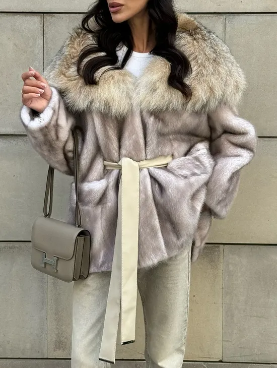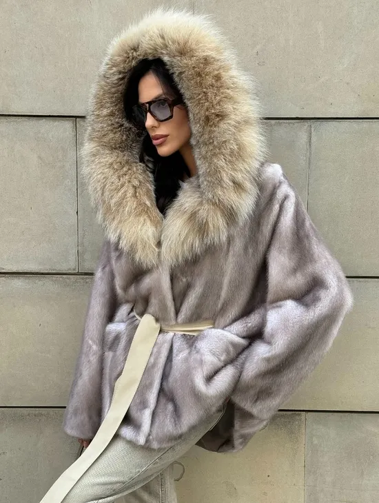Норка роспуск с капюшоном из меха рыси, летучая мышь - цвет жемчуг
