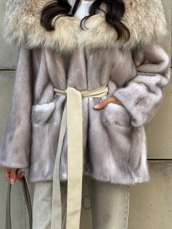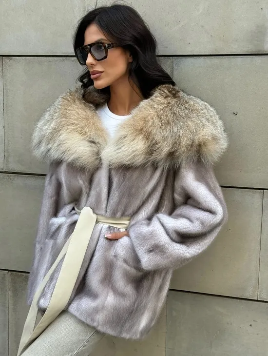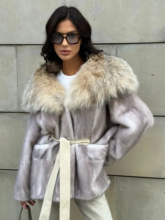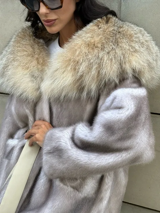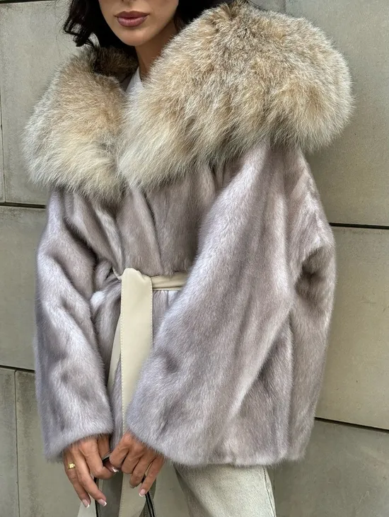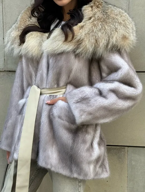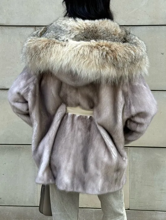 Полупальто из меха норки с капюшоном, отделка из меха рыси - цвет колотый лед