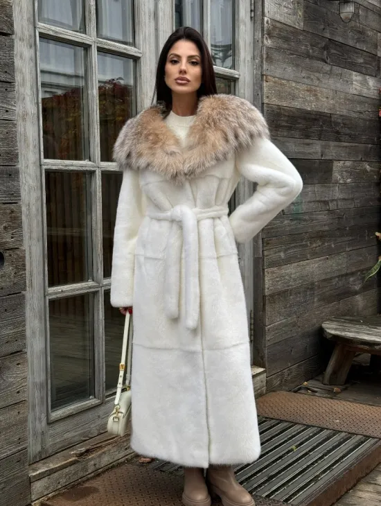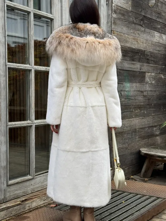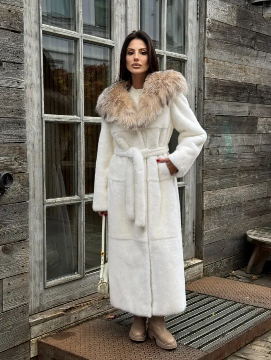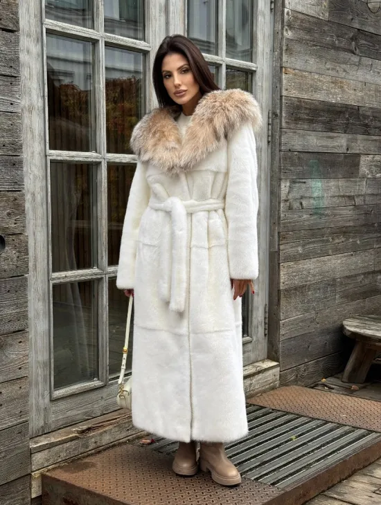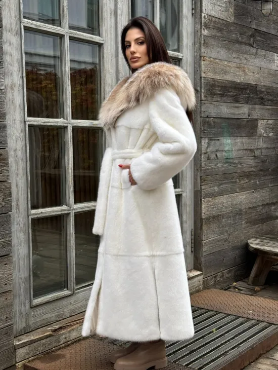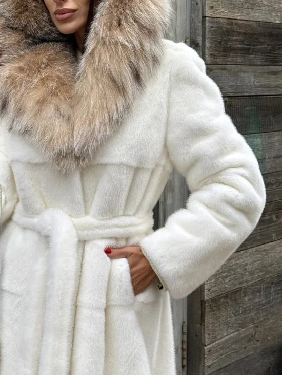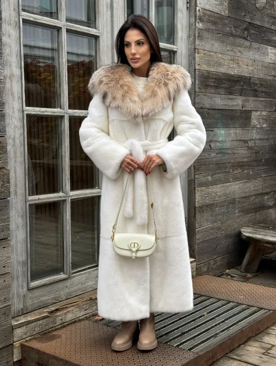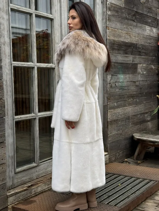 Шуба Халат из норки " PREMIUM WHITE " с капюшоном из меха рыси