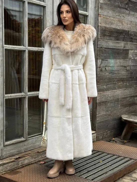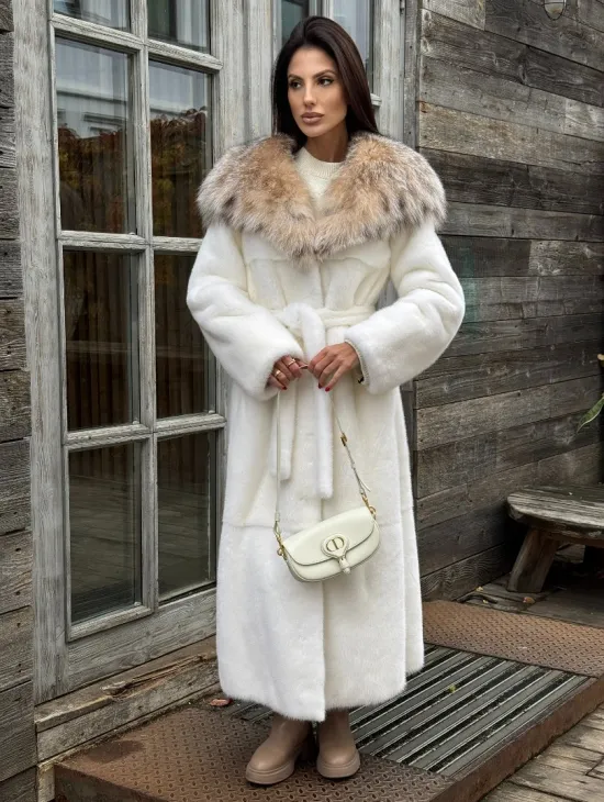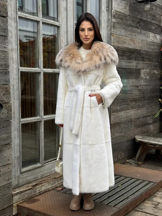 Белая длинная норковая шуба - кимоно с капюшоном из меха рыси