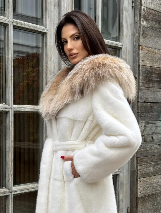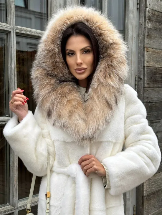 Белая норковая шуба средней длины с капюшоном из рыси