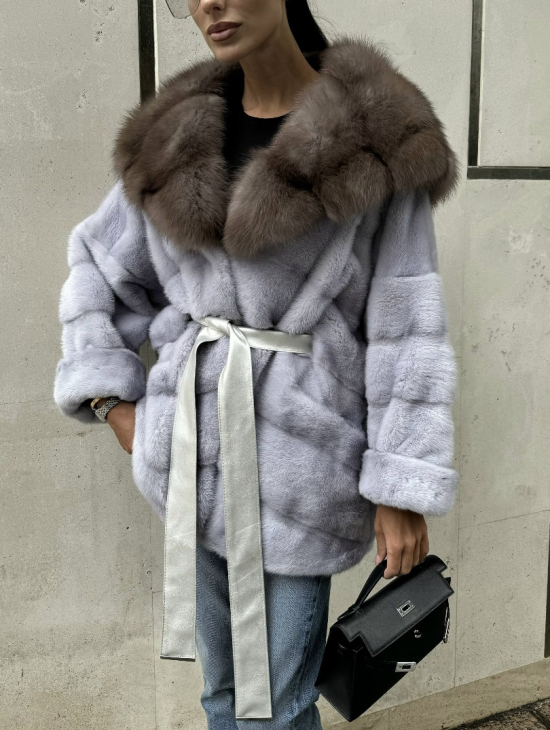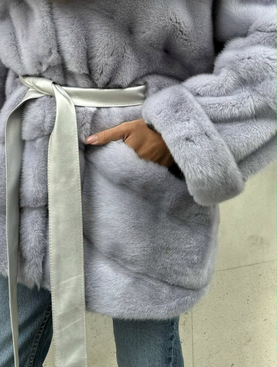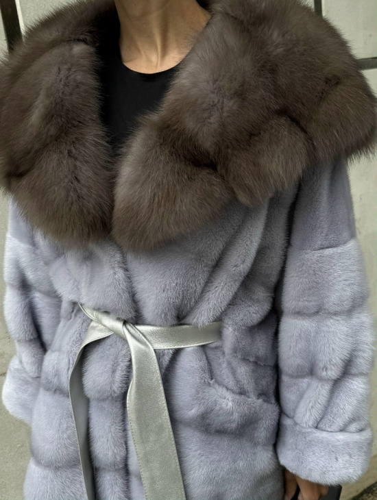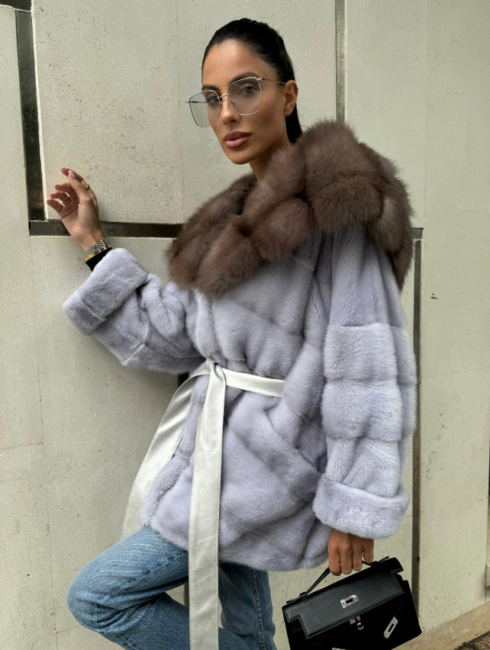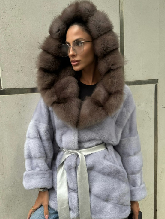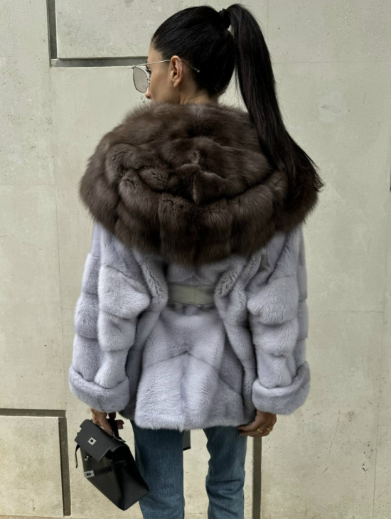 Шуба норковая с капюшоном из меха куницы - цвет голубой