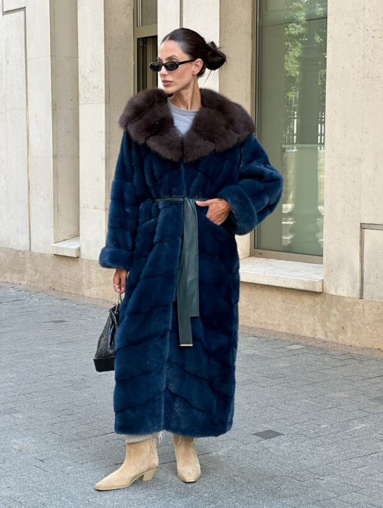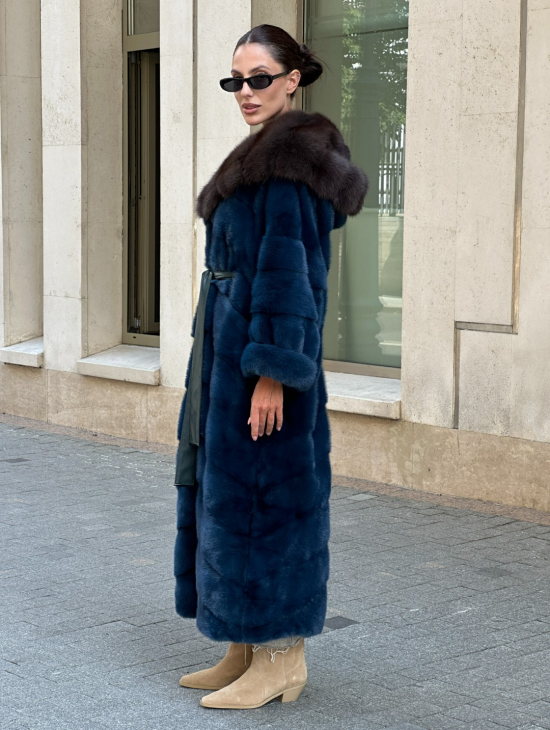 Шуба из меха норки с воротником из куницы - цвет соболь