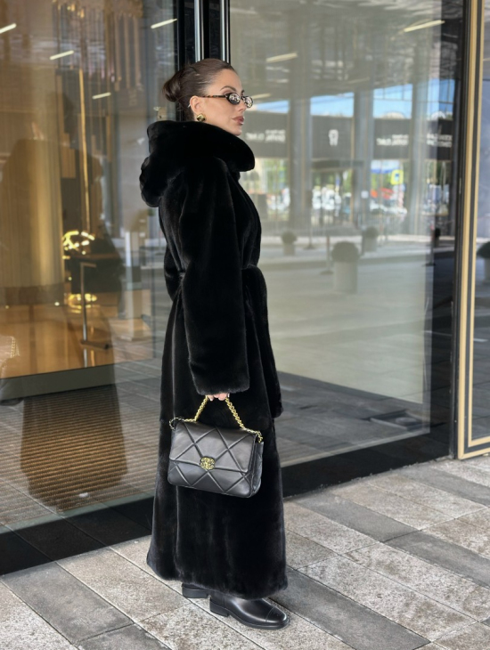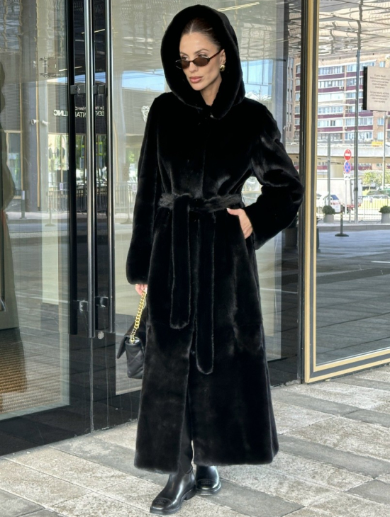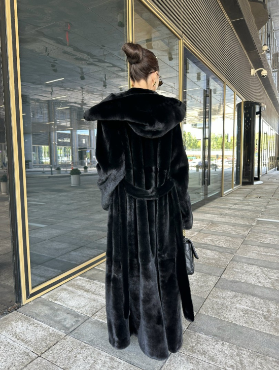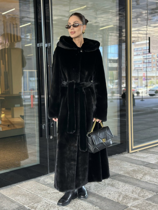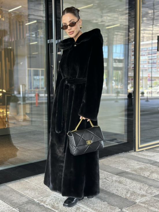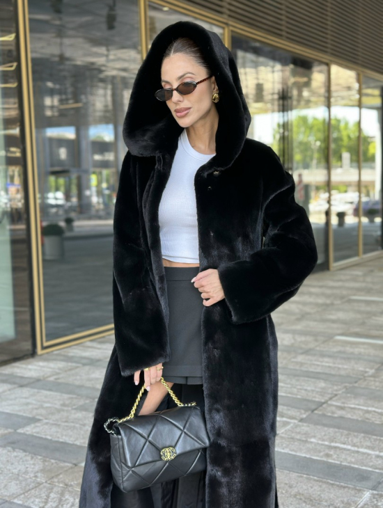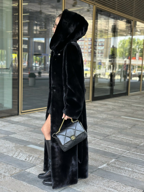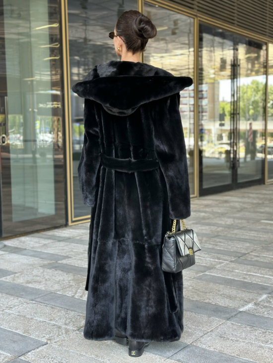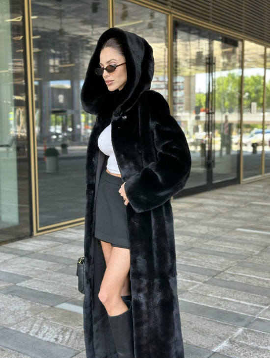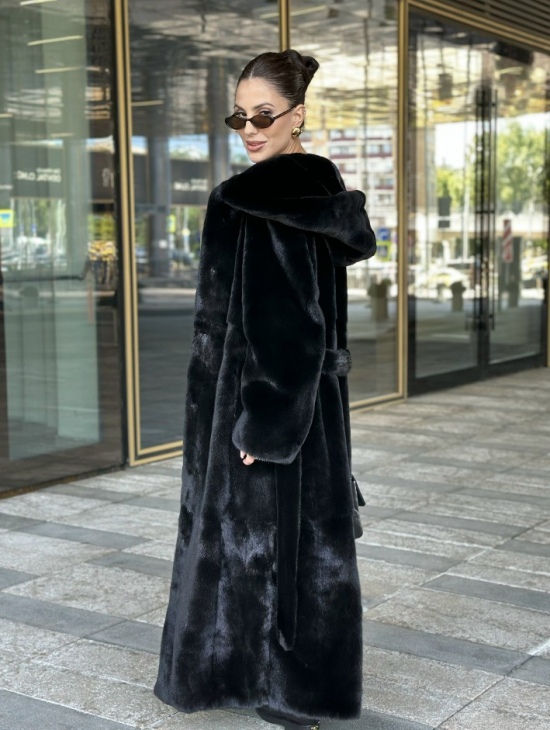 Удлиненная шуба из норки BLACKGLAMA с капюшоном