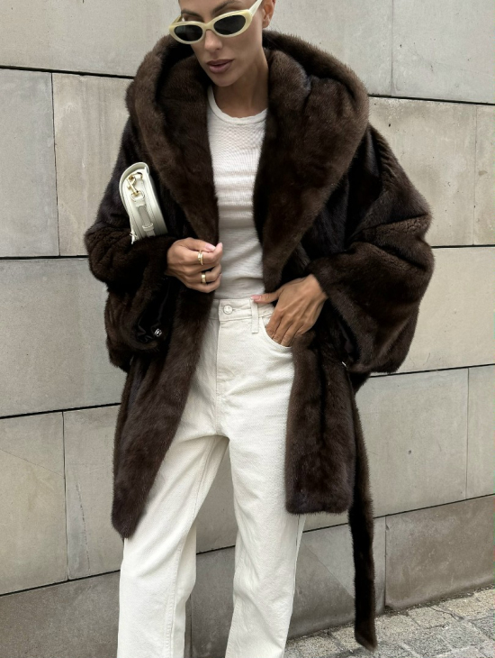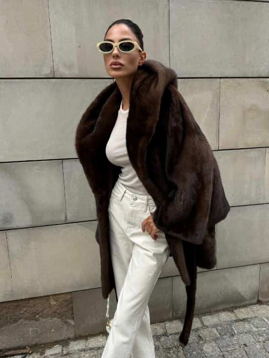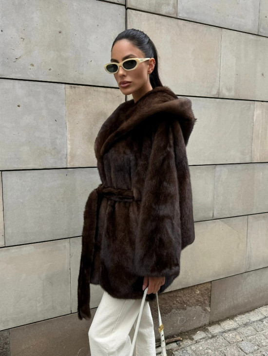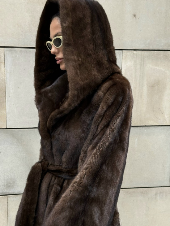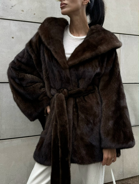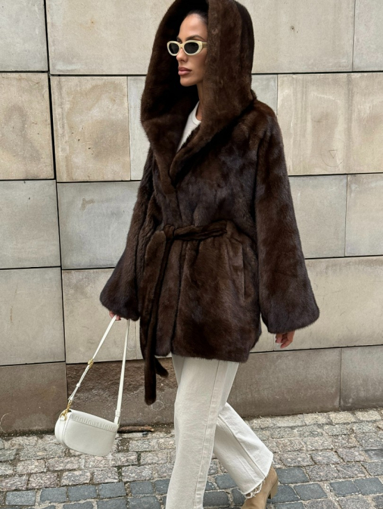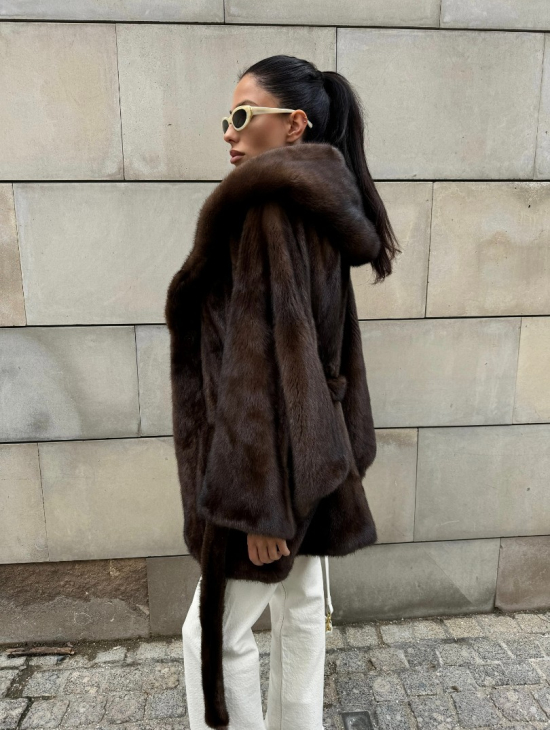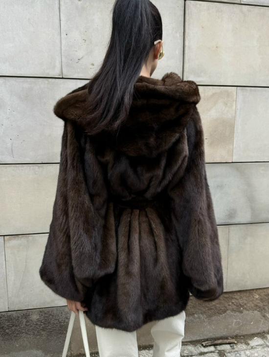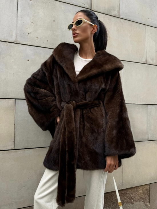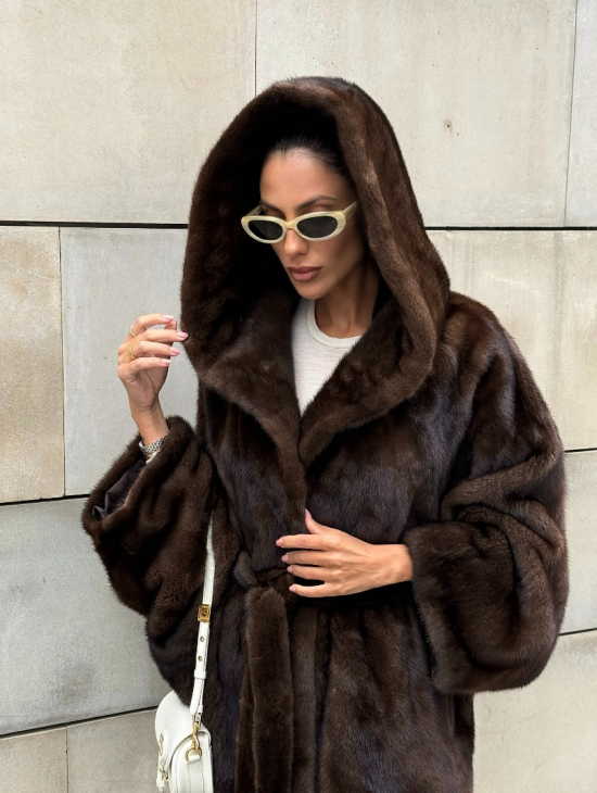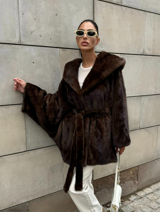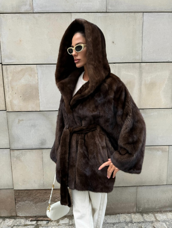 Шуба из скандинавской норки с капюшоном летучая мышь, роспуск орех