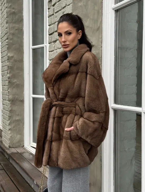 Полушубок из натурального меха норки Nafa mink в цвете соболь с капюшоном, фасон - летучая мышь