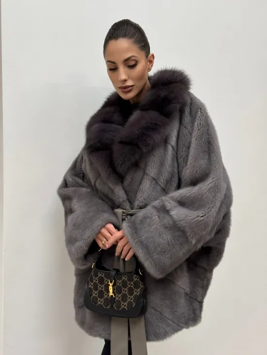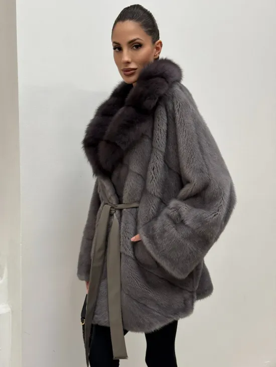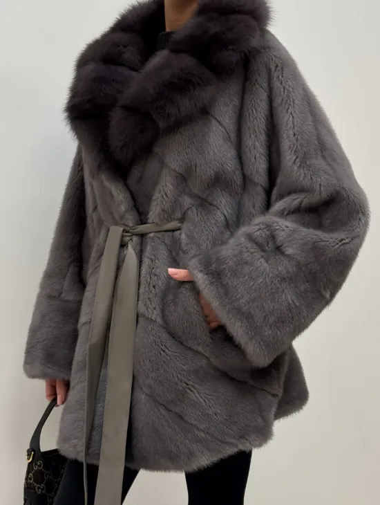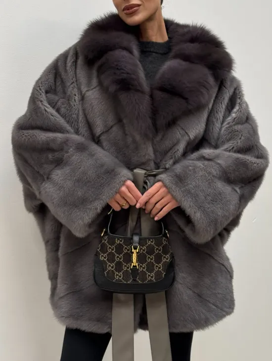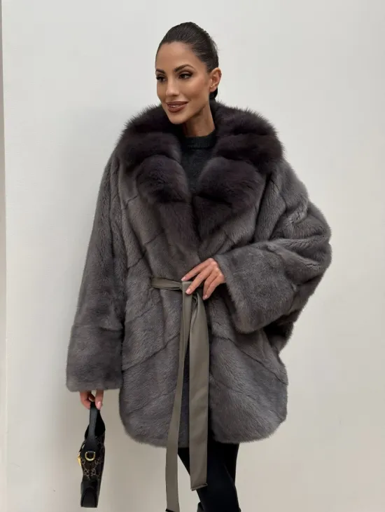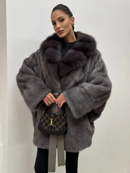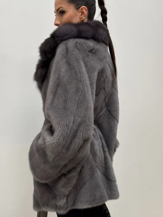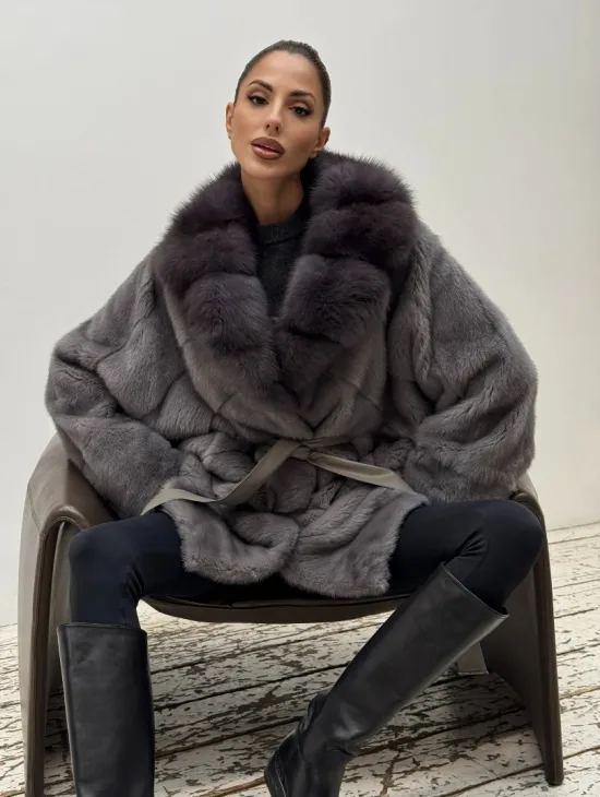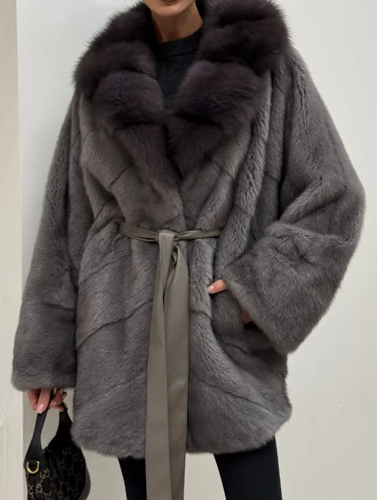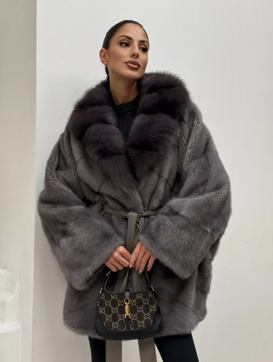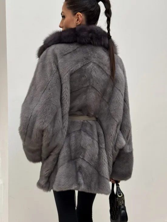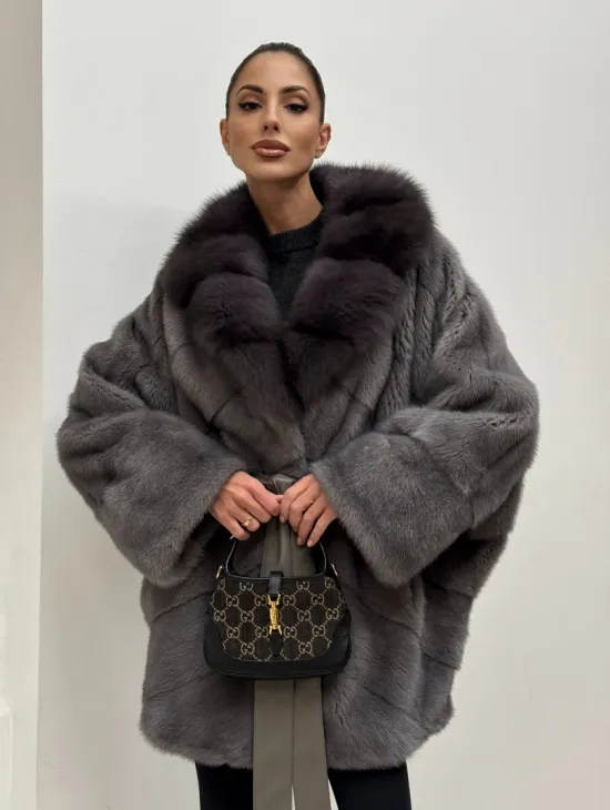 Полушубок норковый "Летучая мышь" с воротником из меха куницы