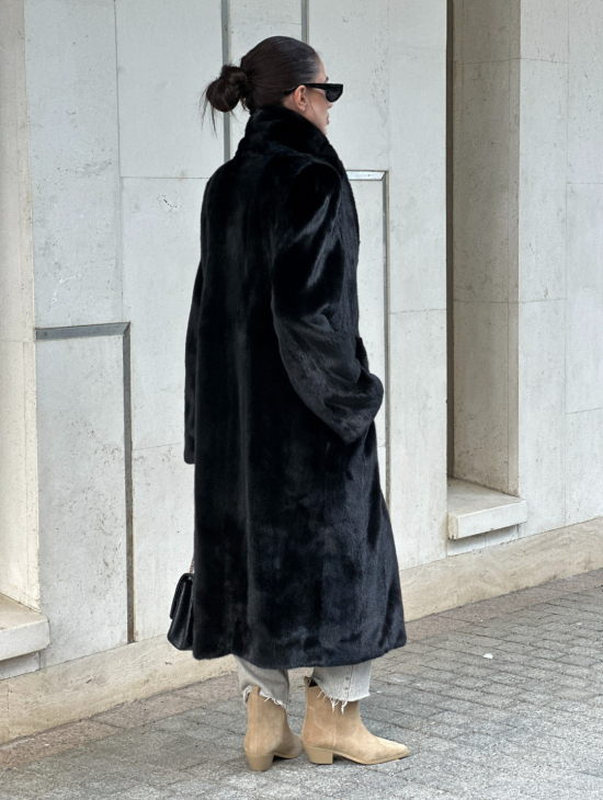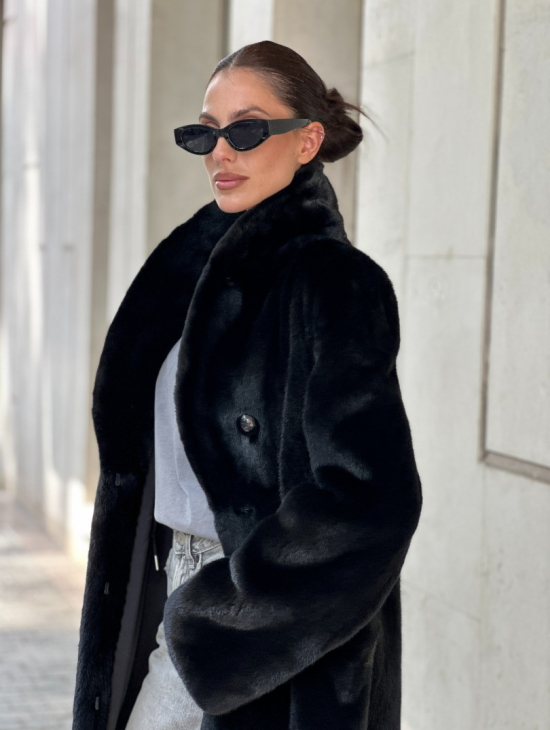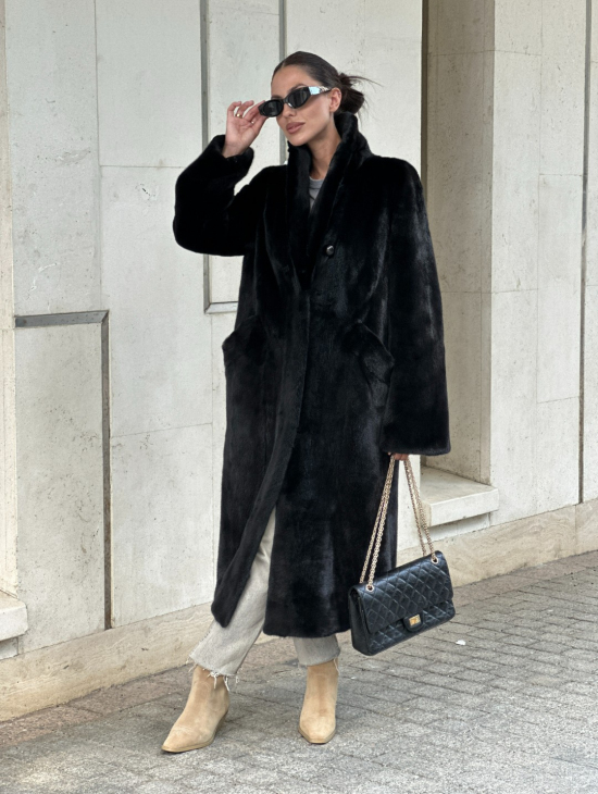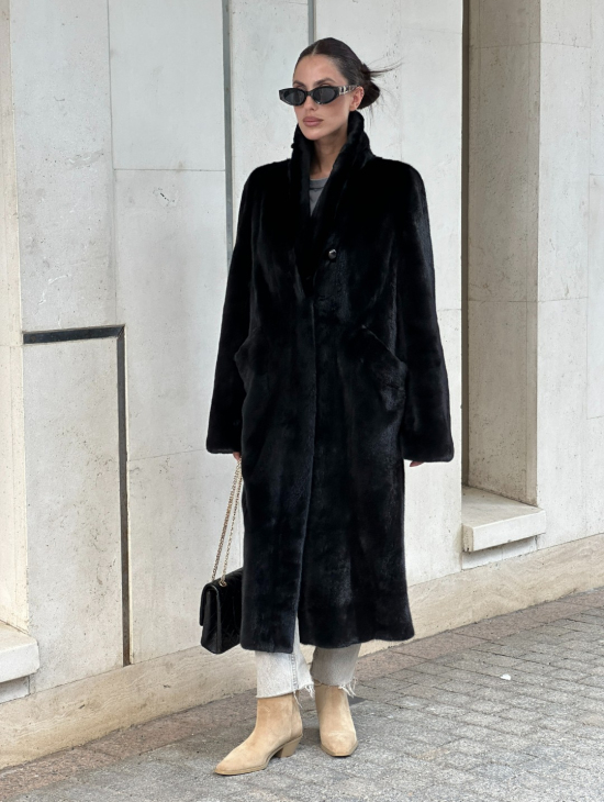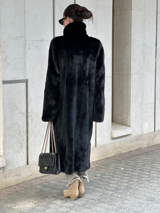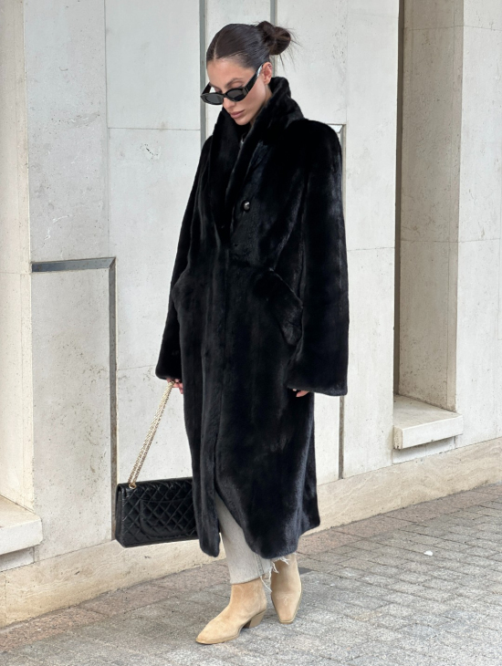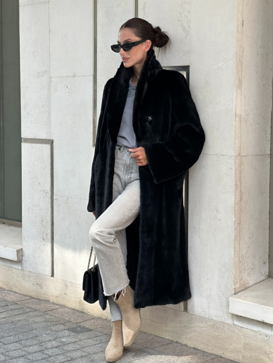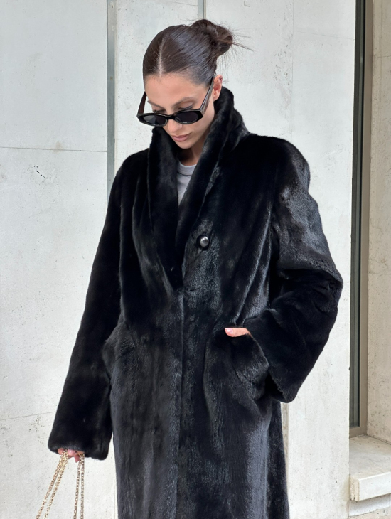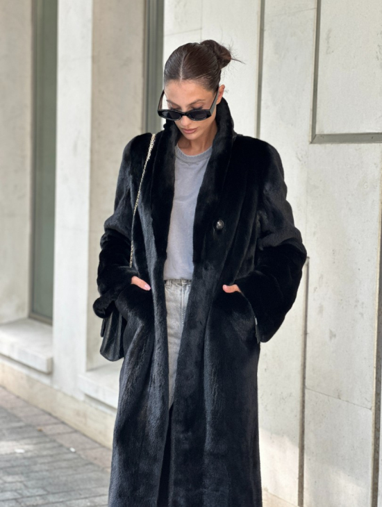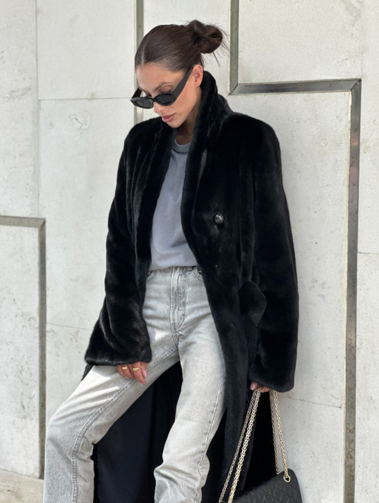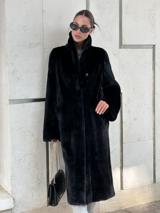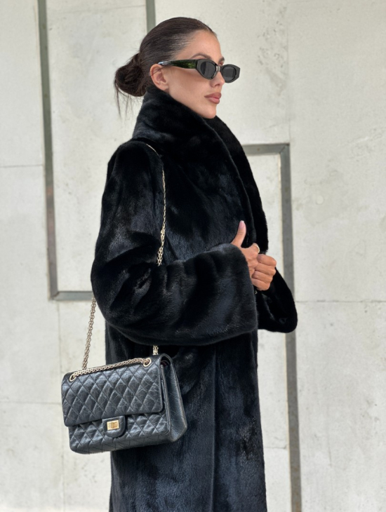 Норковая шуба черного цвета с капюшоном из чернобурки