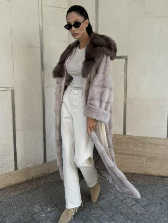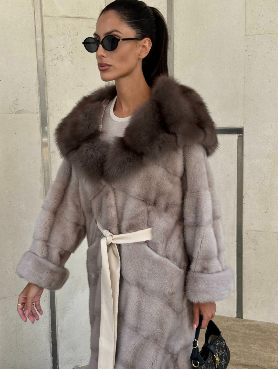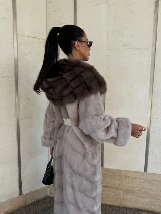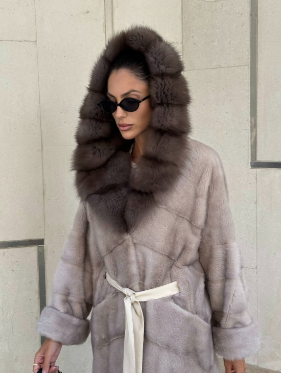 Шуба норковая с капюшоном из меха куницы в цвете нюд