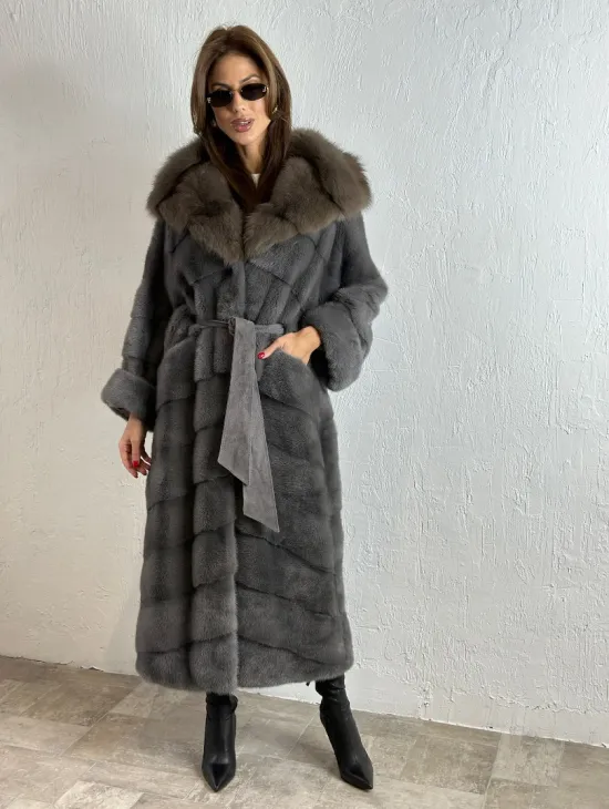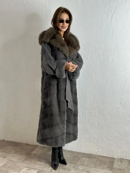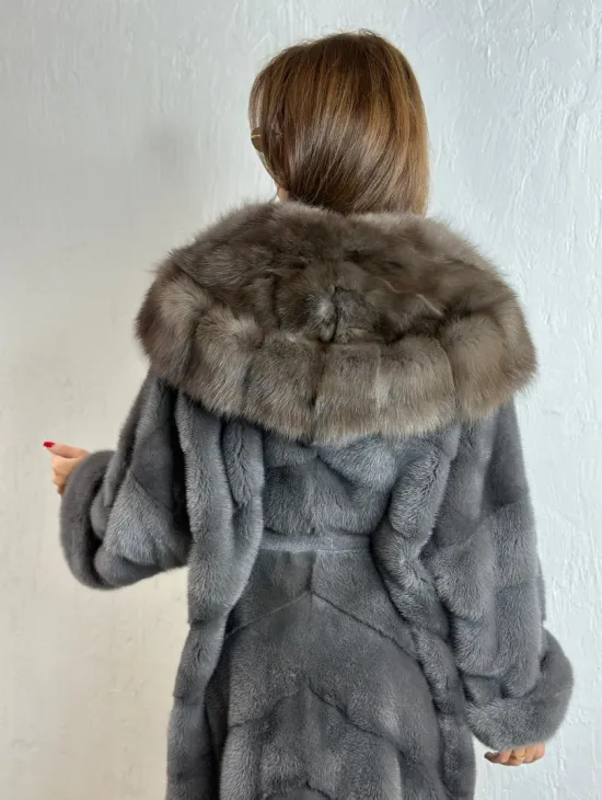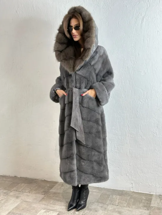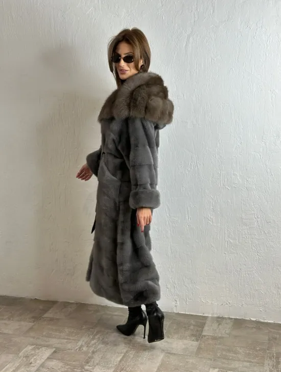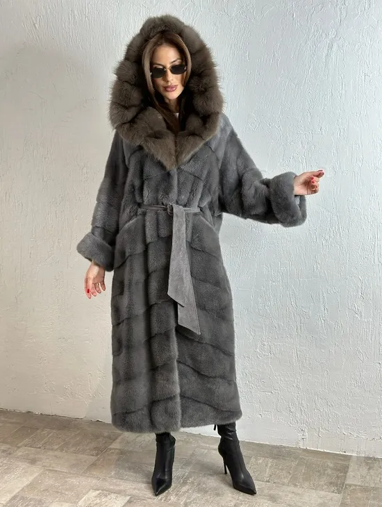 Удлиненная норковая шуба с капюшоном из куницы - цвет графит грей
