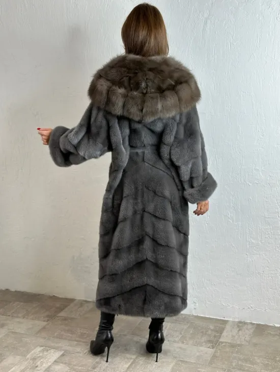 Длинная шуба из норки с капюшоном из куницы - цвет синий графит
