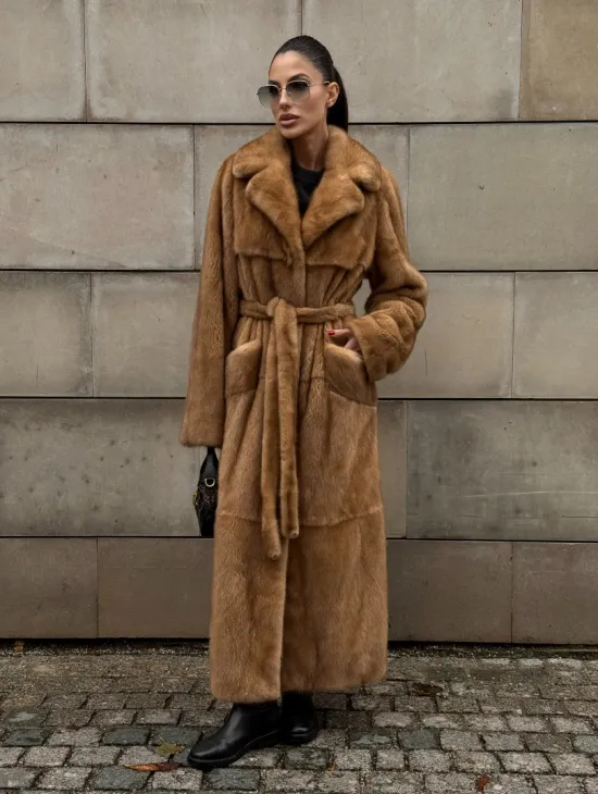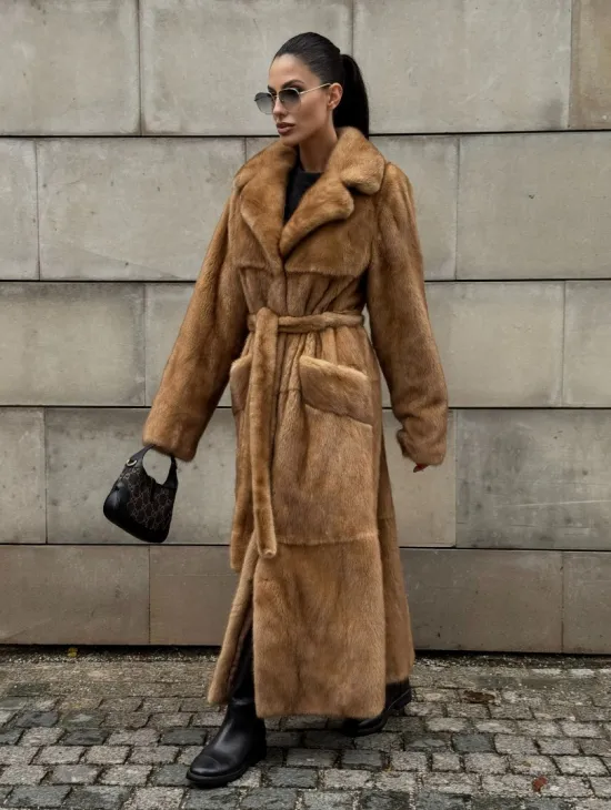 Шуба - халат maxi из меха норки Caramel с накладными карманами