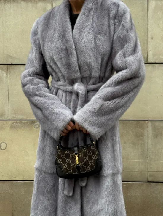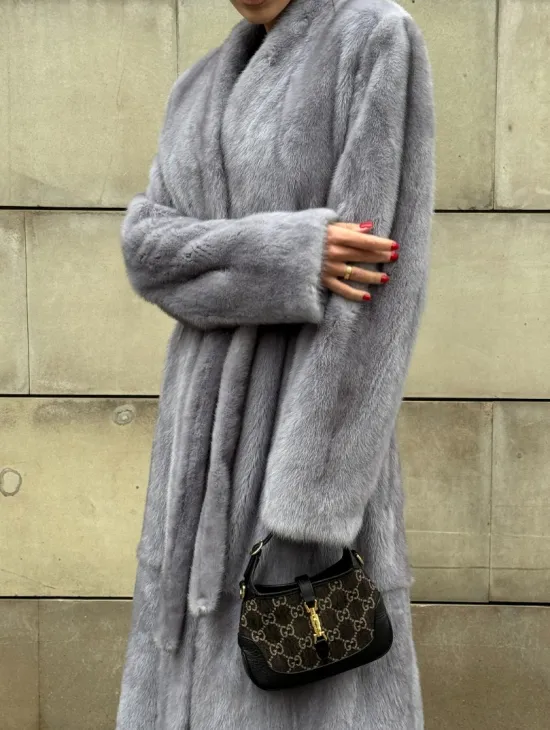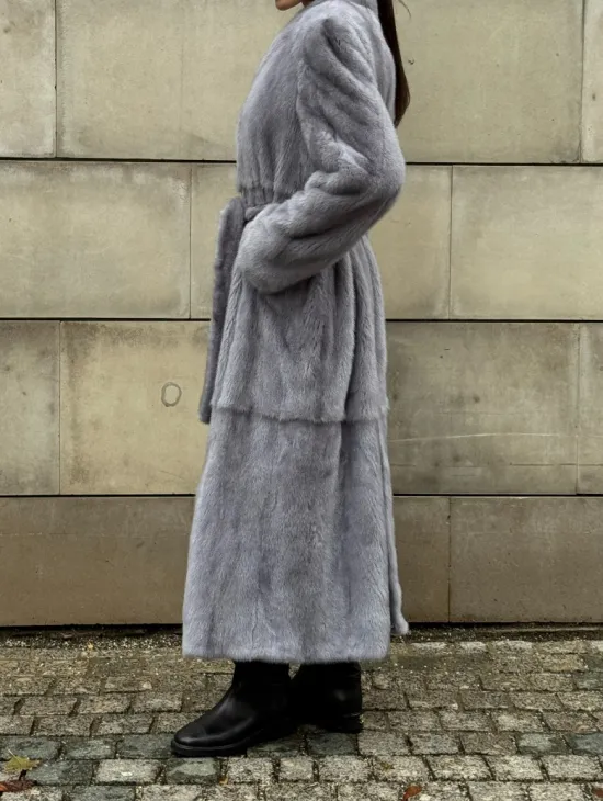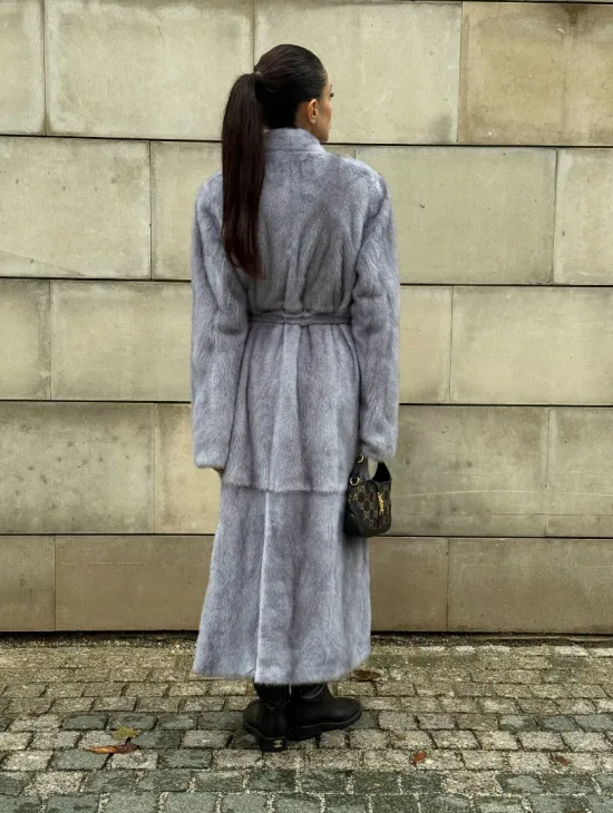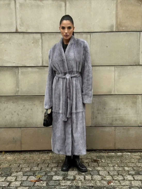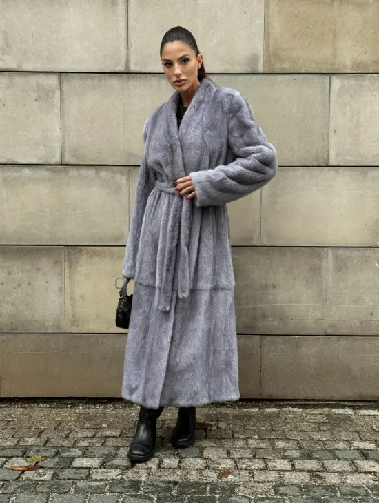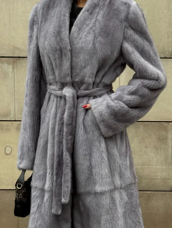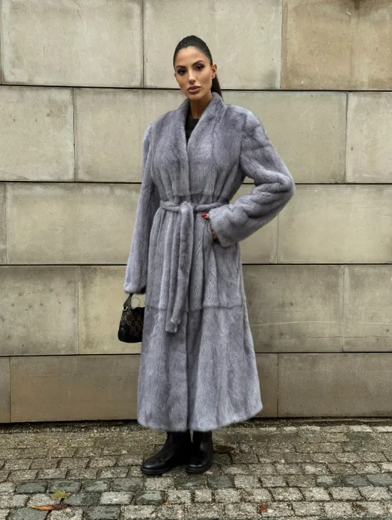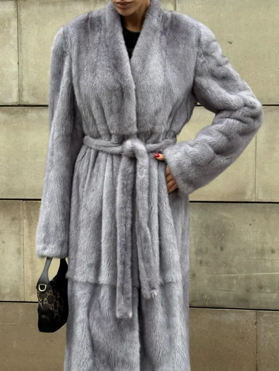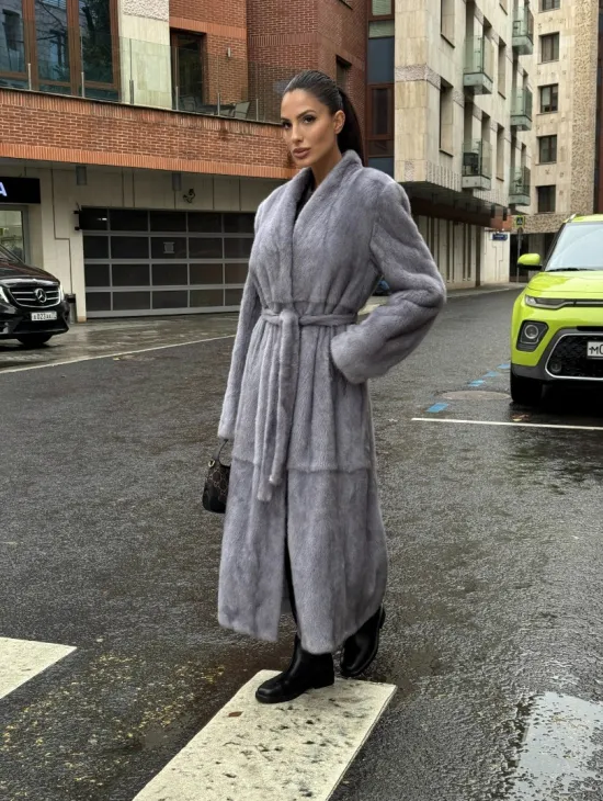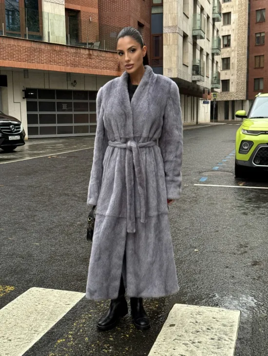 Шуба из голубой скандинавской норки без воротника с поясом “Fashion trend 2024-2025“