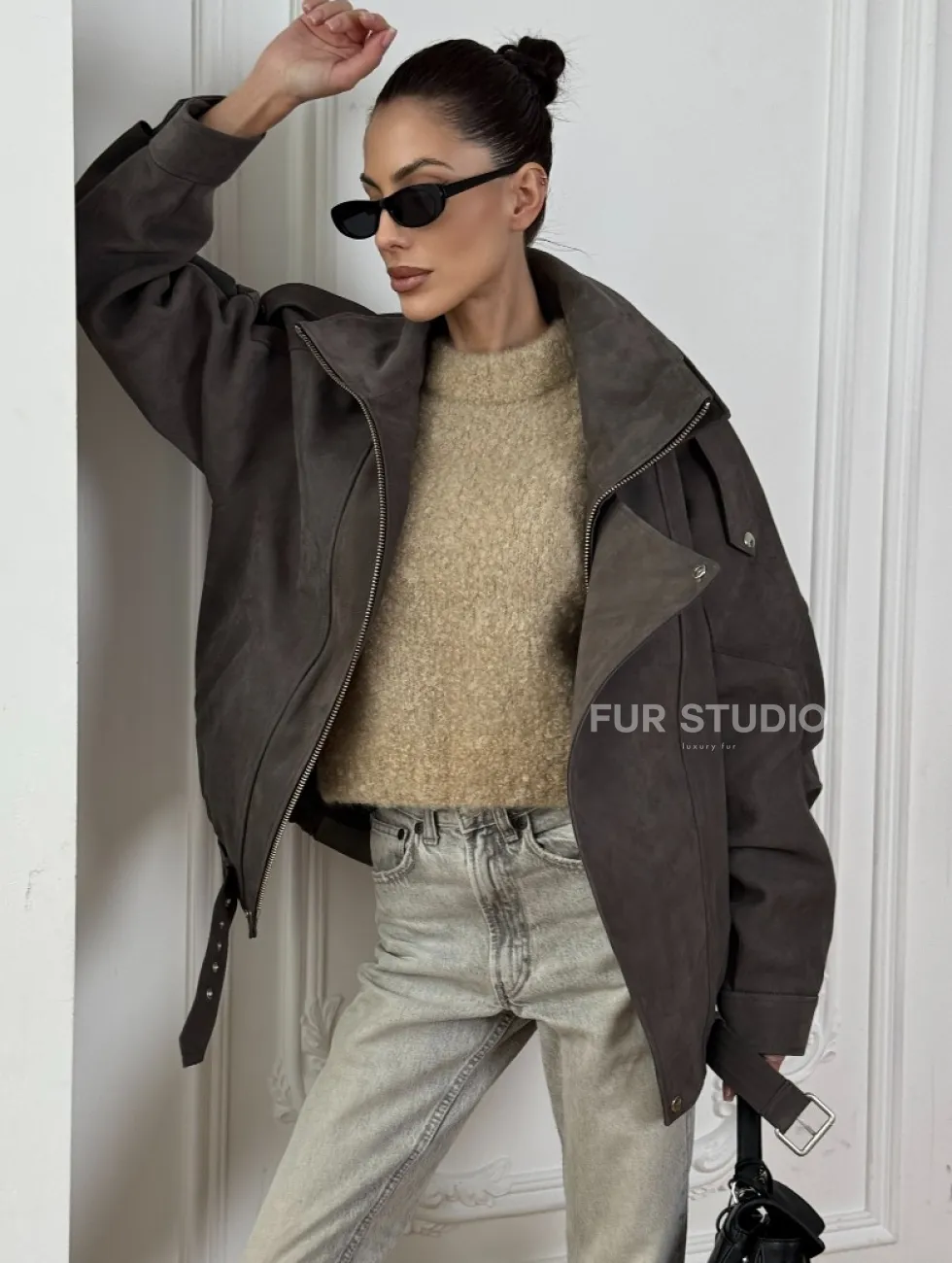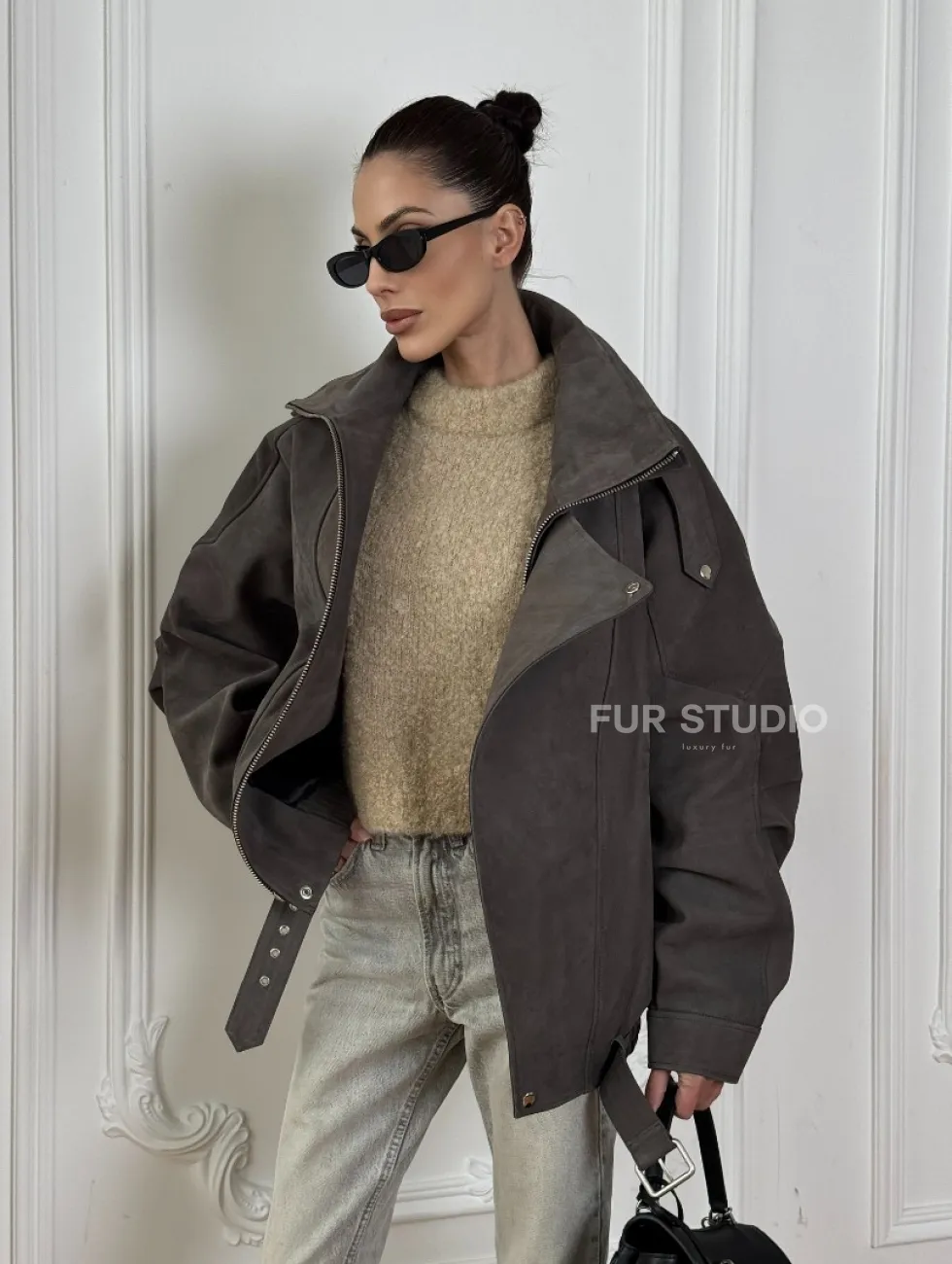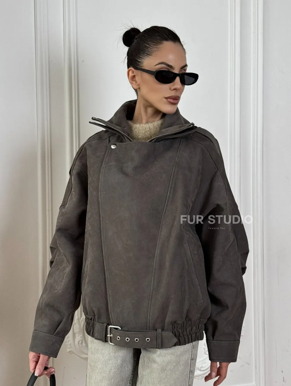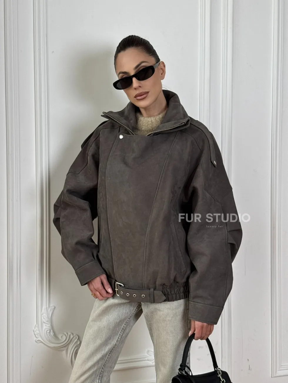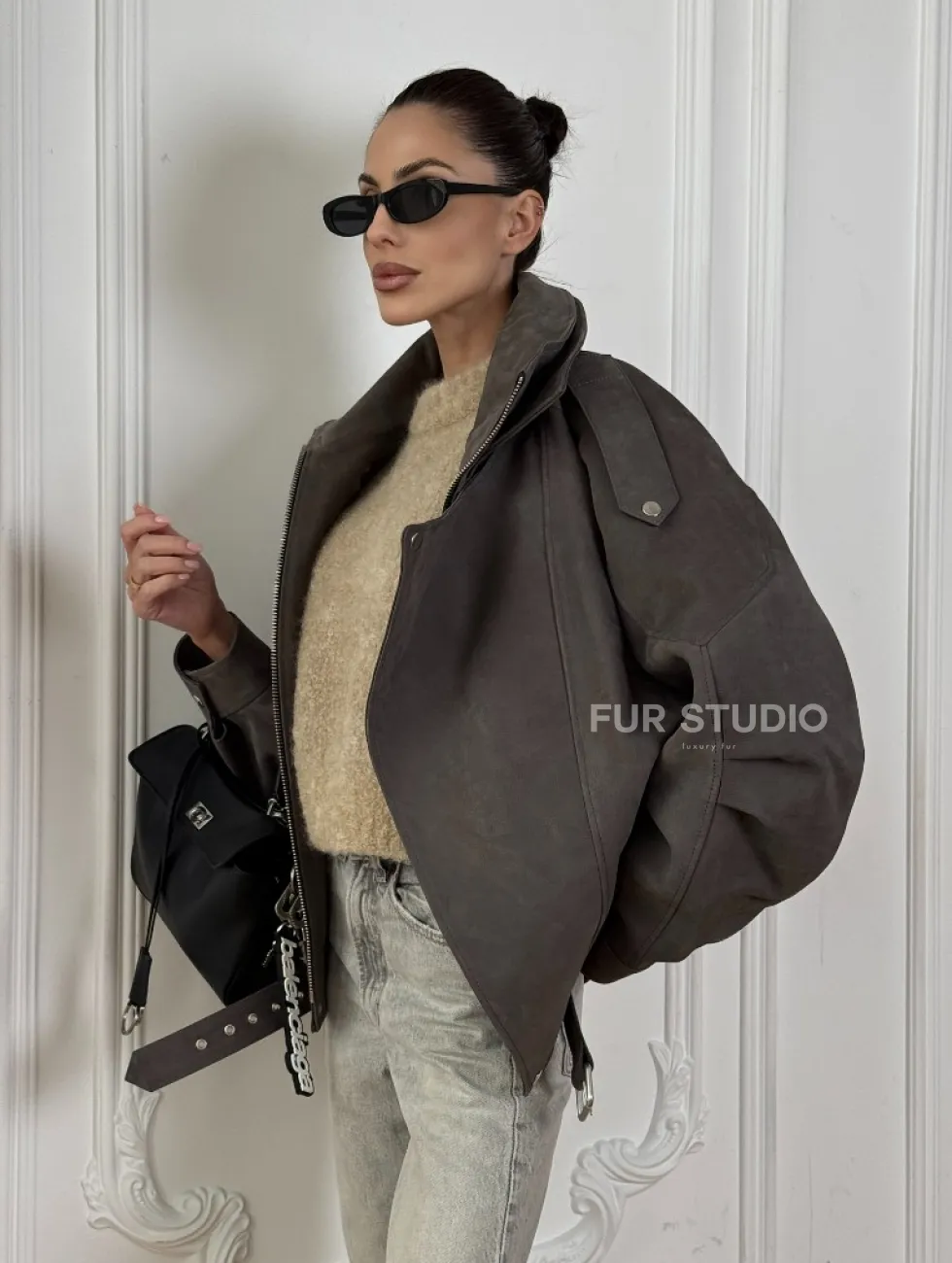 Современная куртка - бомбер из винтажной кожи Gray с двойным воротником доступна для покупки в нашем шоуруме Furs Studio в Чите, где также предоставляется удобная доставка во все города России.