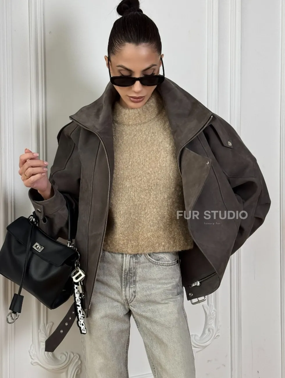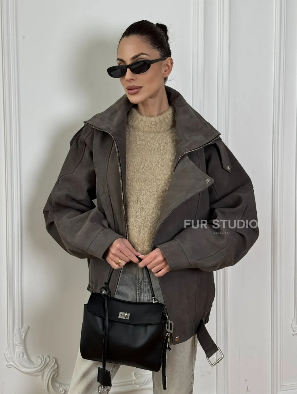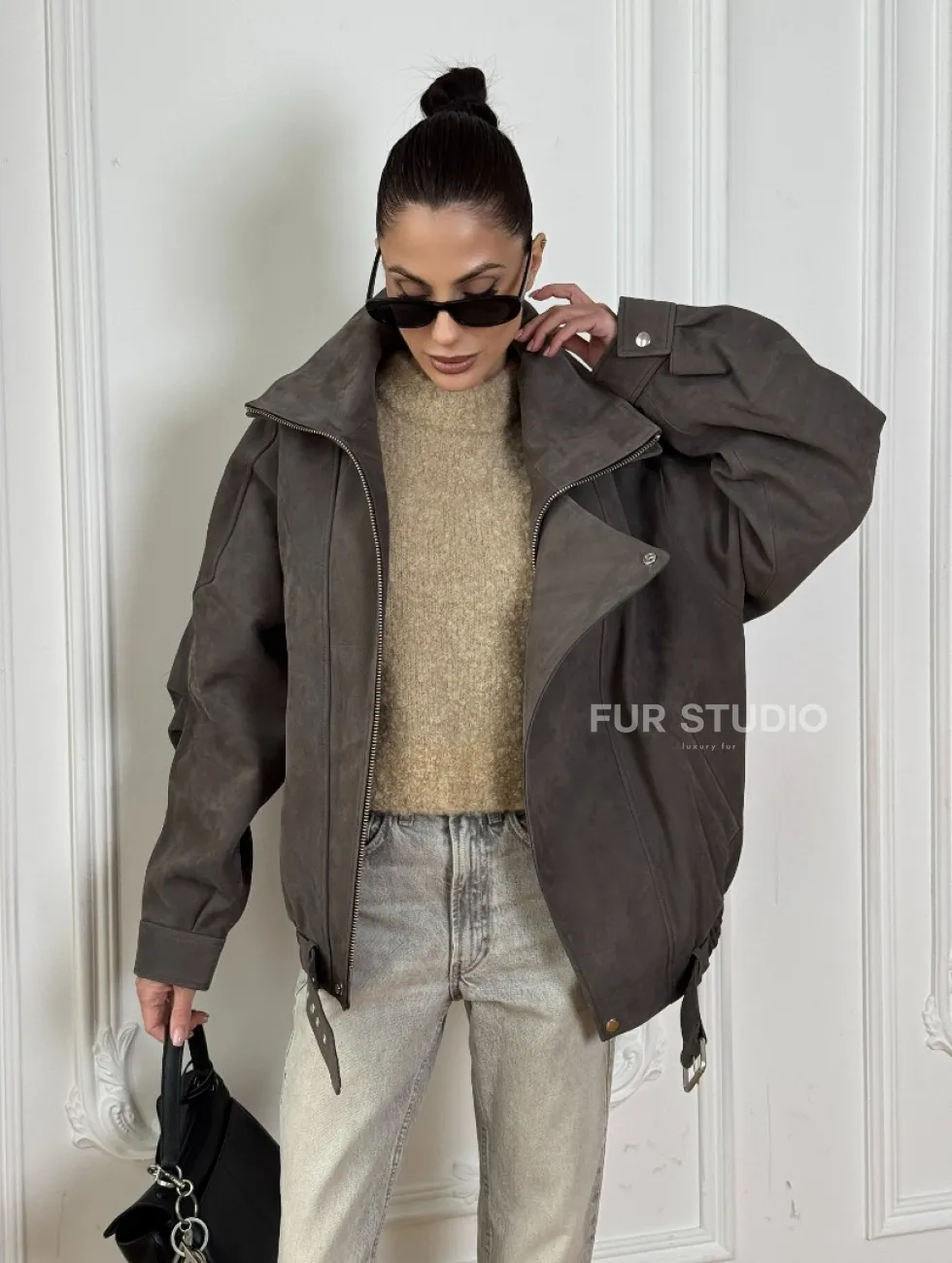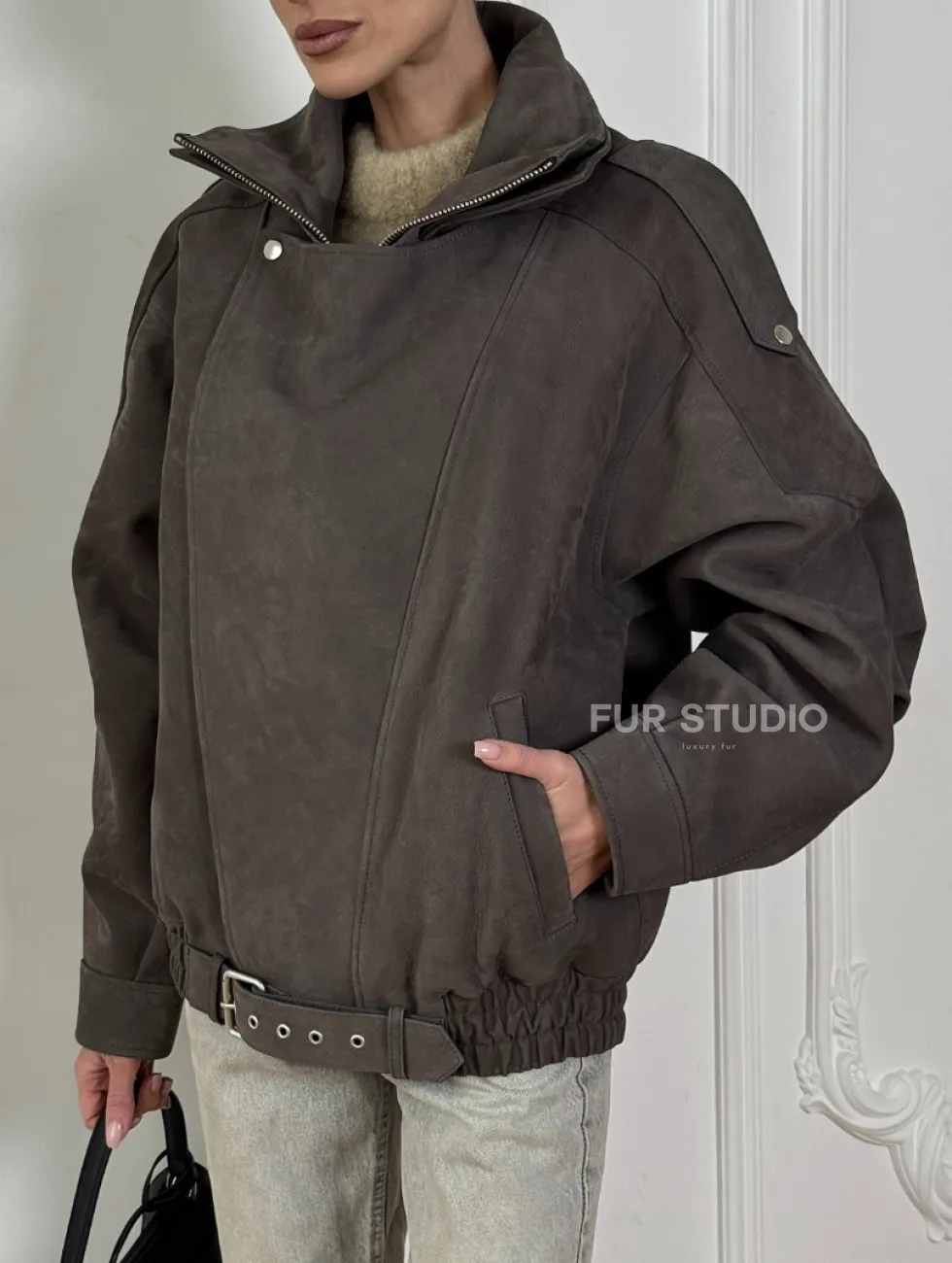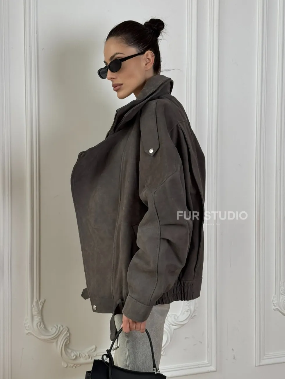 Современная куртка - бомбер из винтажной кожи Gray с двойным воротником доступна для покупки в нашем шоуруме Furs Studio в Чите, где также предоставляется удобная доставка во все города России.