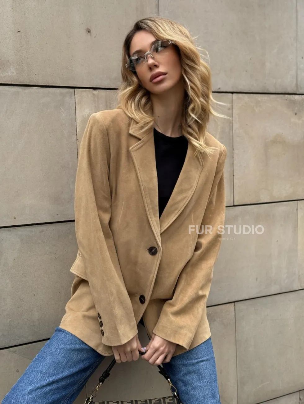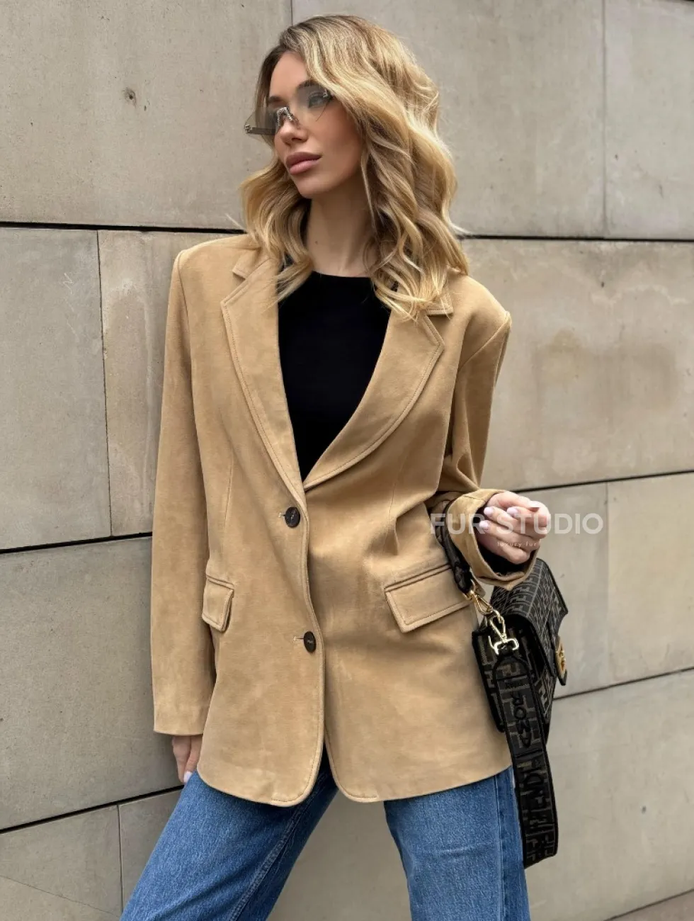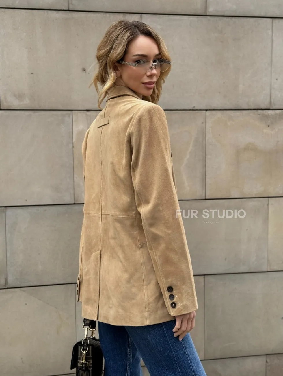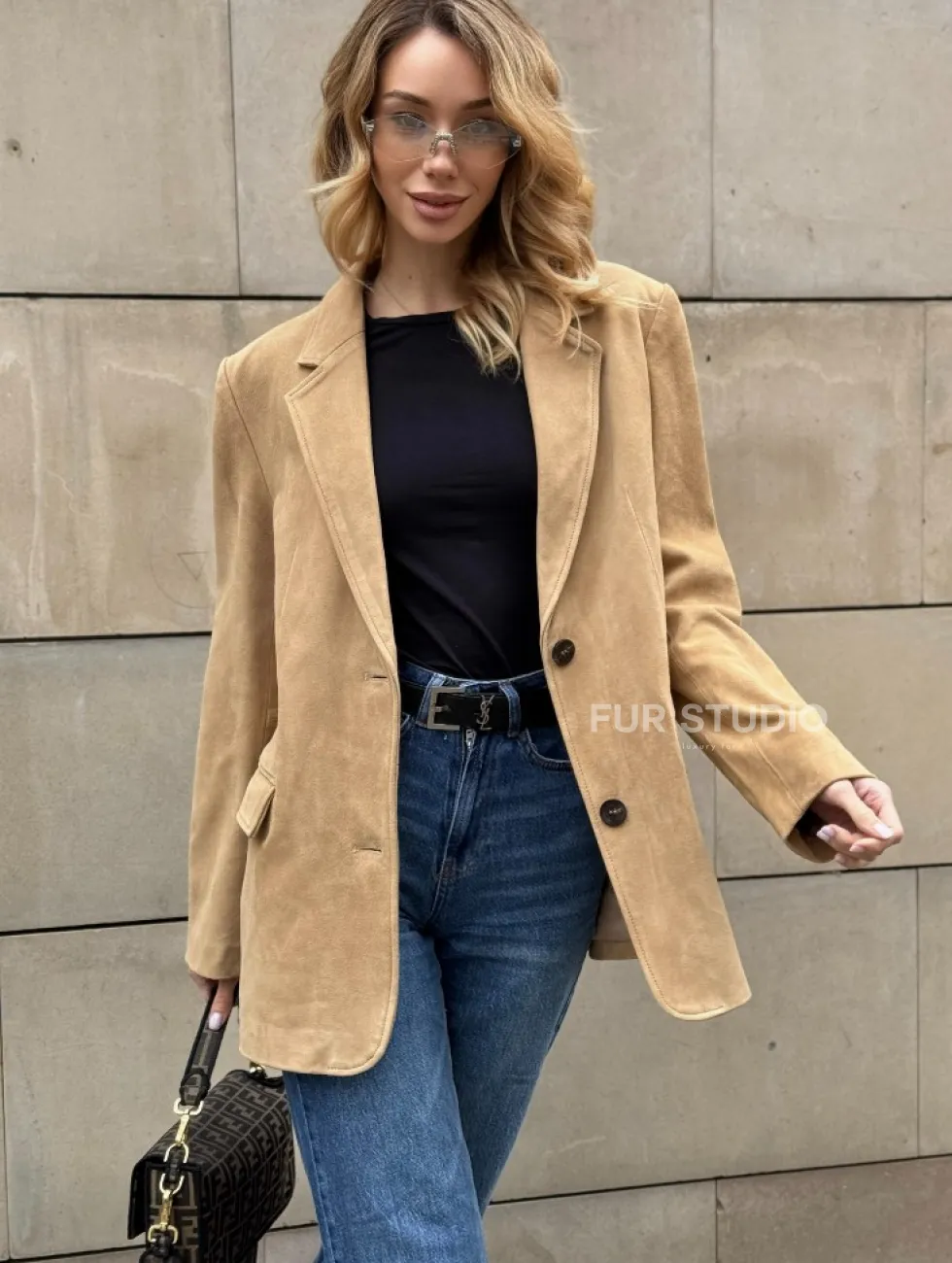 Стильный однобортный пиджак из натуральной замши в бежевом цвете доступна для покупки в нашем шоуруме Furs Studio в Чите, где также предоставляется удобная доставка во все города России.