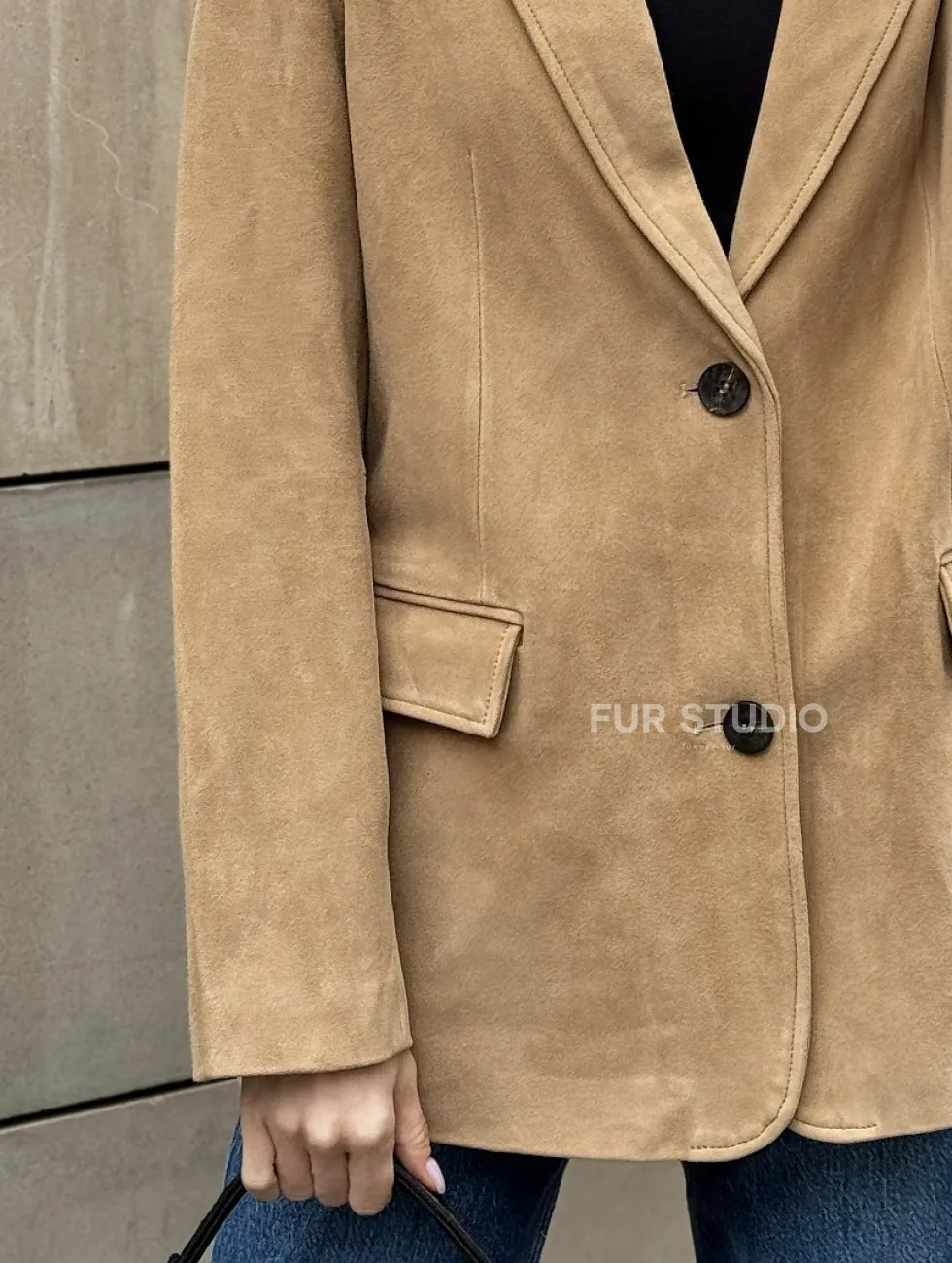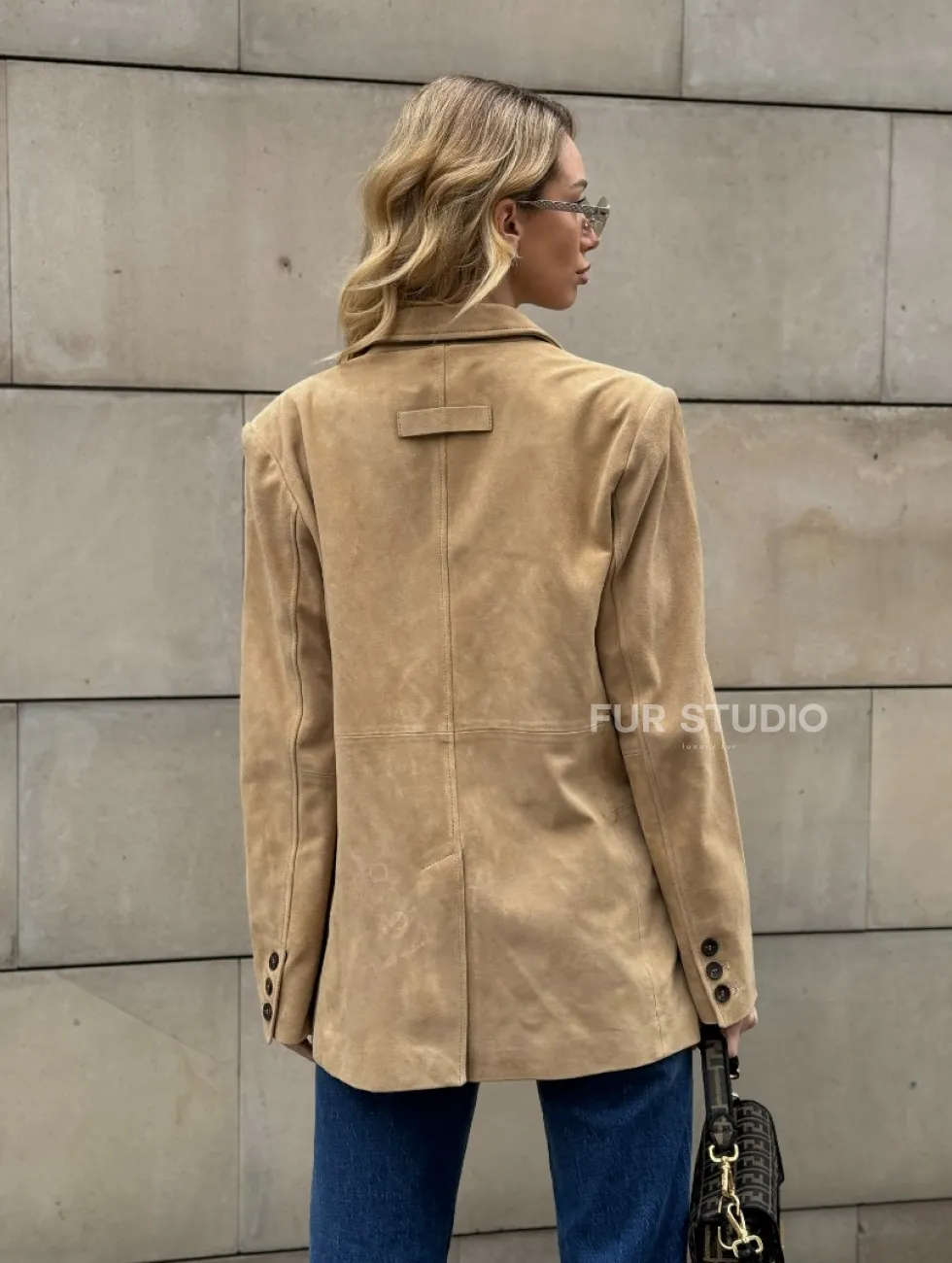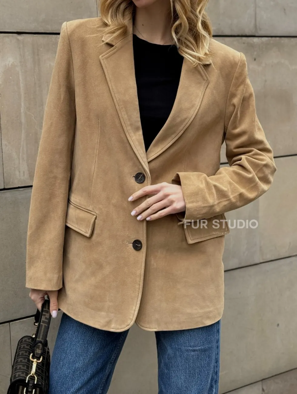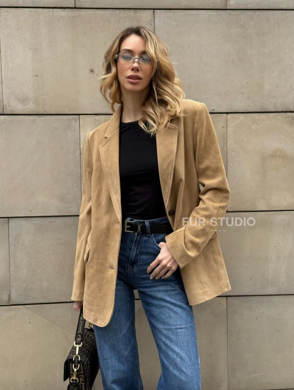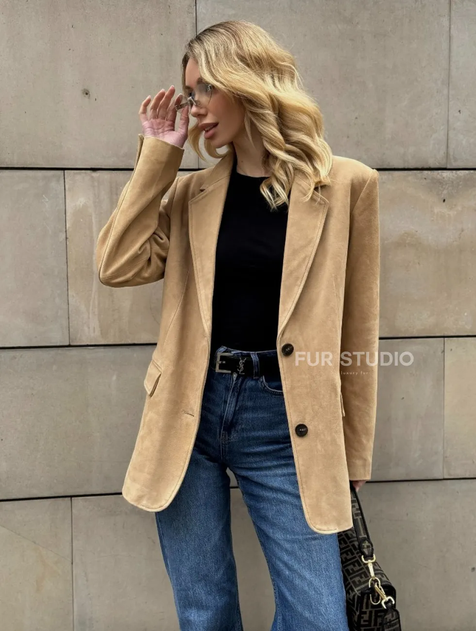 Стильный однобортный пиджак из натуральной замши в бежевом цвете доступна для покупки в нашем шоуруме Furs Studio в Чите, где также предоставляется удобная доставка во все города России.