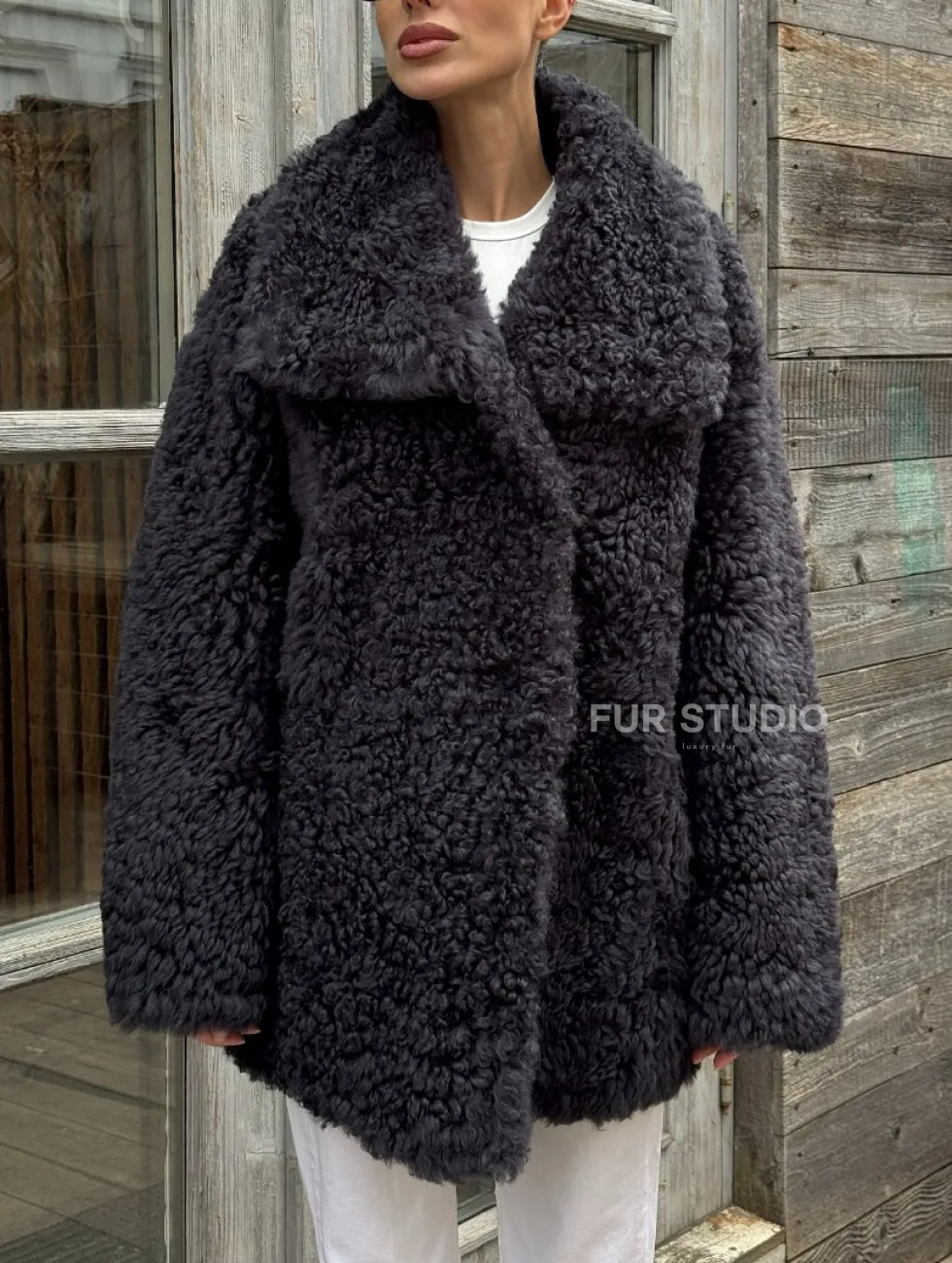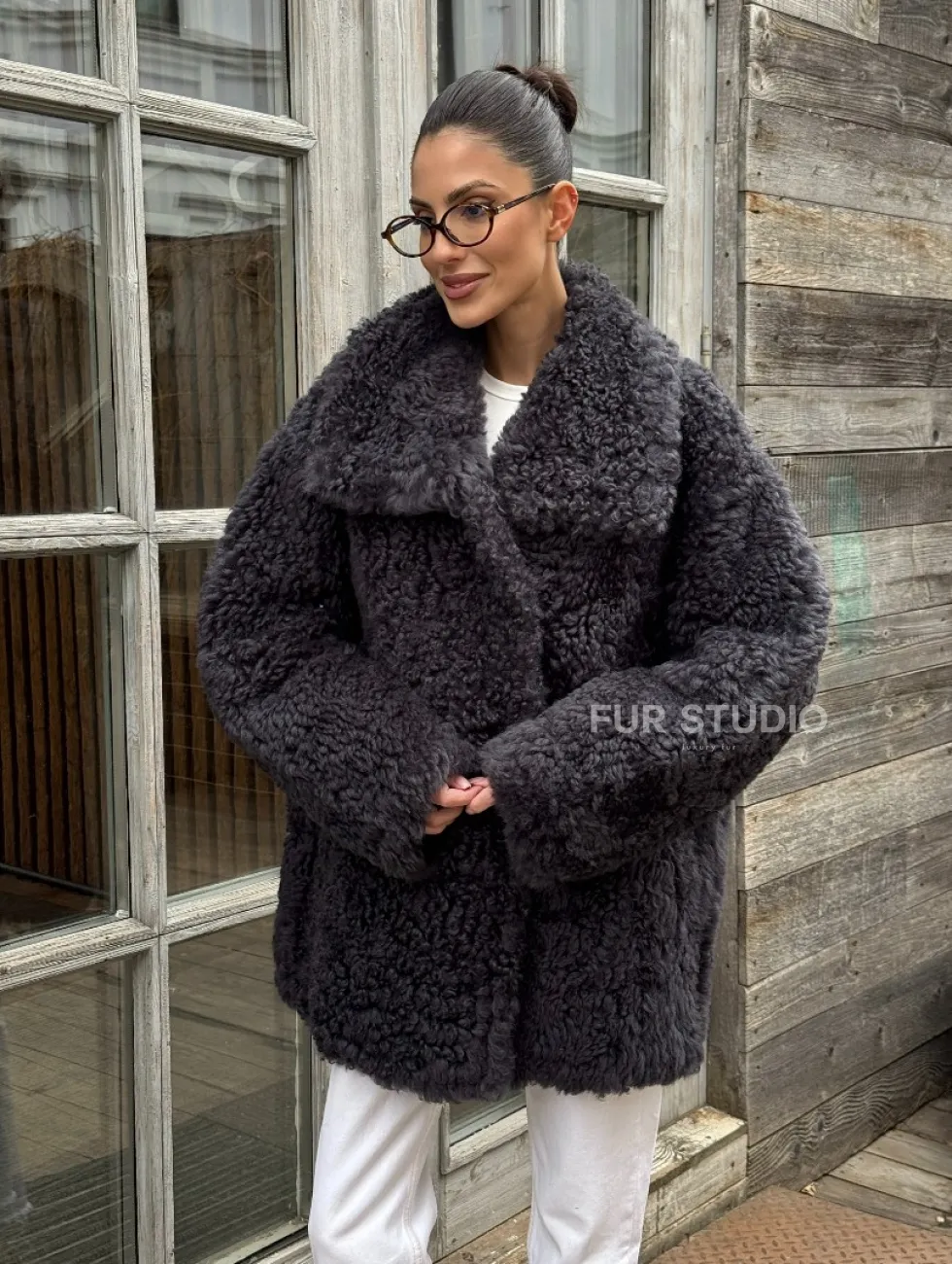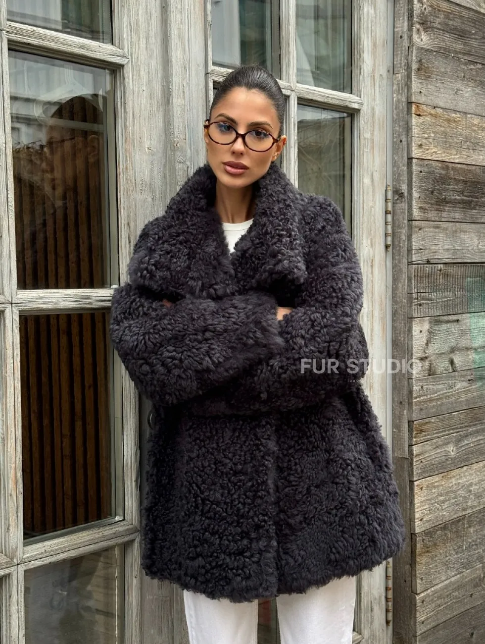 Стильный полушубок из натурального меха тиградо с большим отложным воротником - цвет графит доступна для покупки в нашем шоуруме Furs Studio в Чите, а также предлагается удобная доставка во все города России. Обогатите свой гардероб этой дубленкой, которая прослужит вам многие годы, добавив немного роскоши в ваш повседневный образ.
