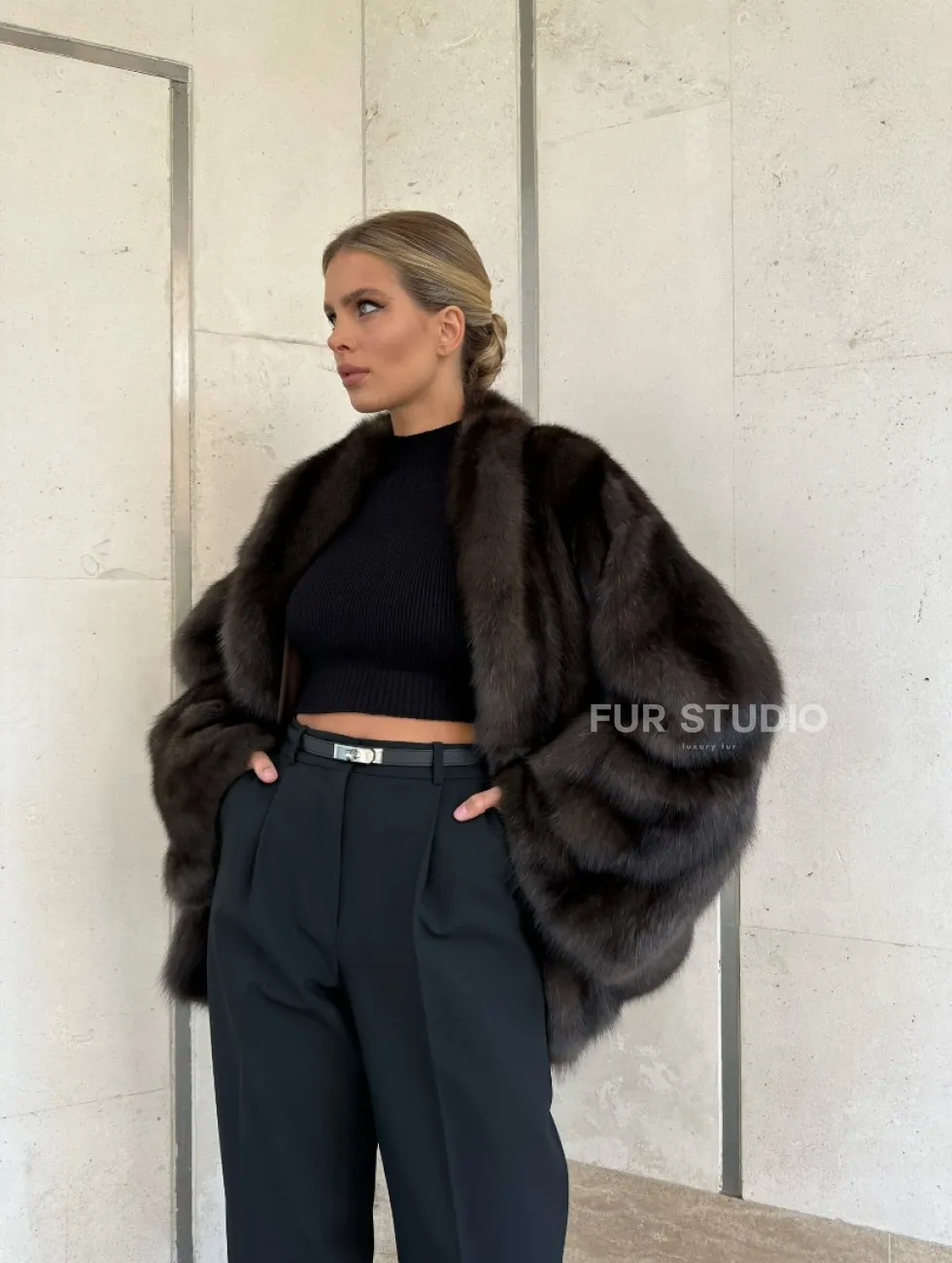 Жакет из темного натурального меха соболя с серебристой проседью — универсальный предмет зимнего гардероба, особенно для жительниц большого города в средней полосе. Укороченный крой не помешает с комфортом водить машину и без опаски передвигаться по городу, не боясь испортить полы мехового изделия уличным противоледным реагентом.