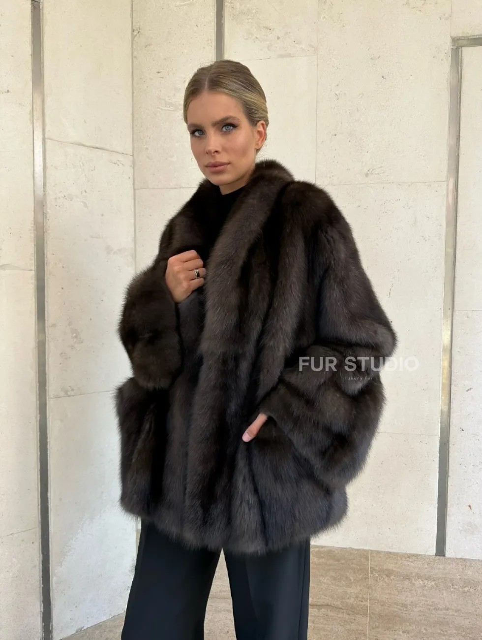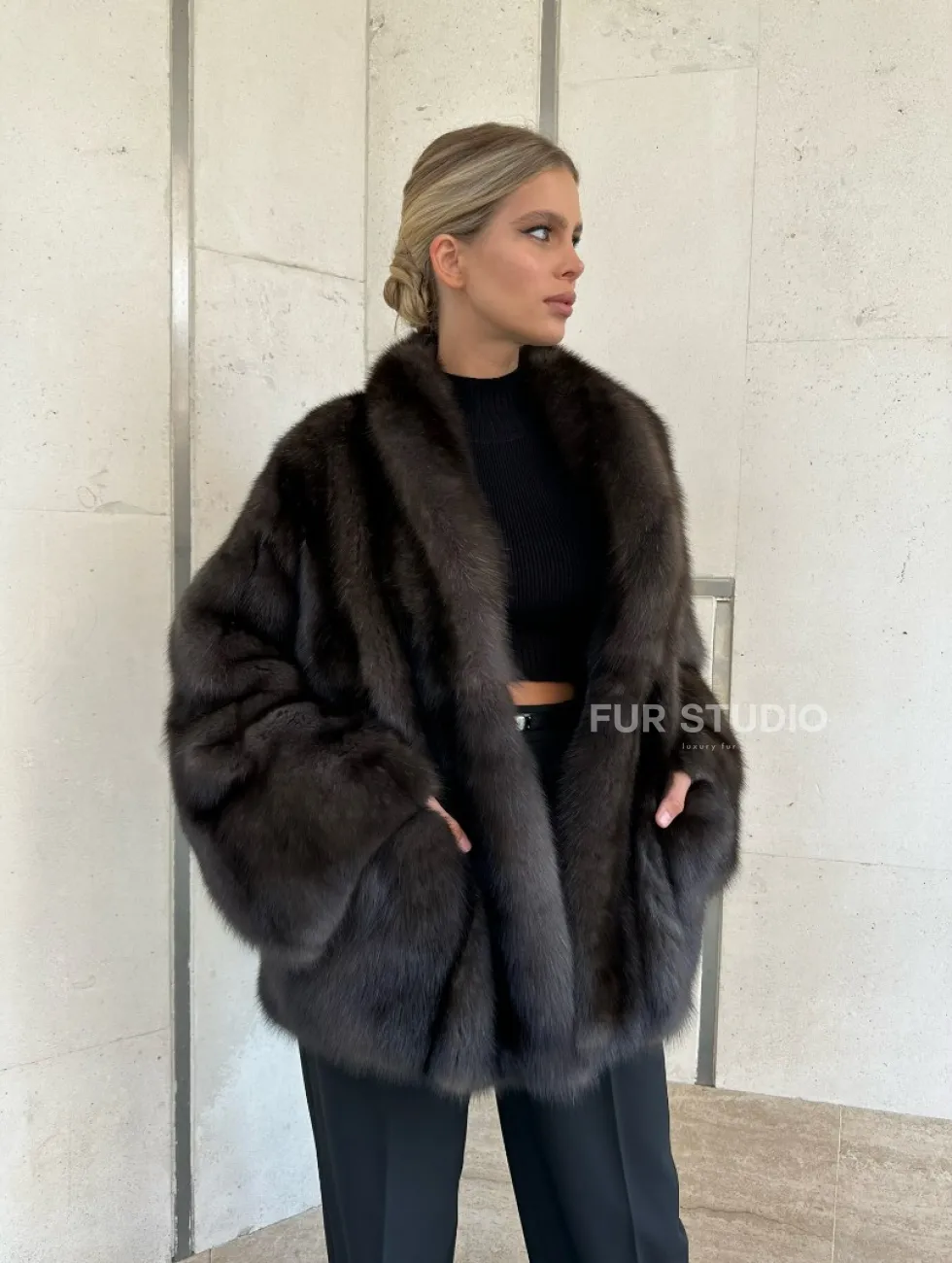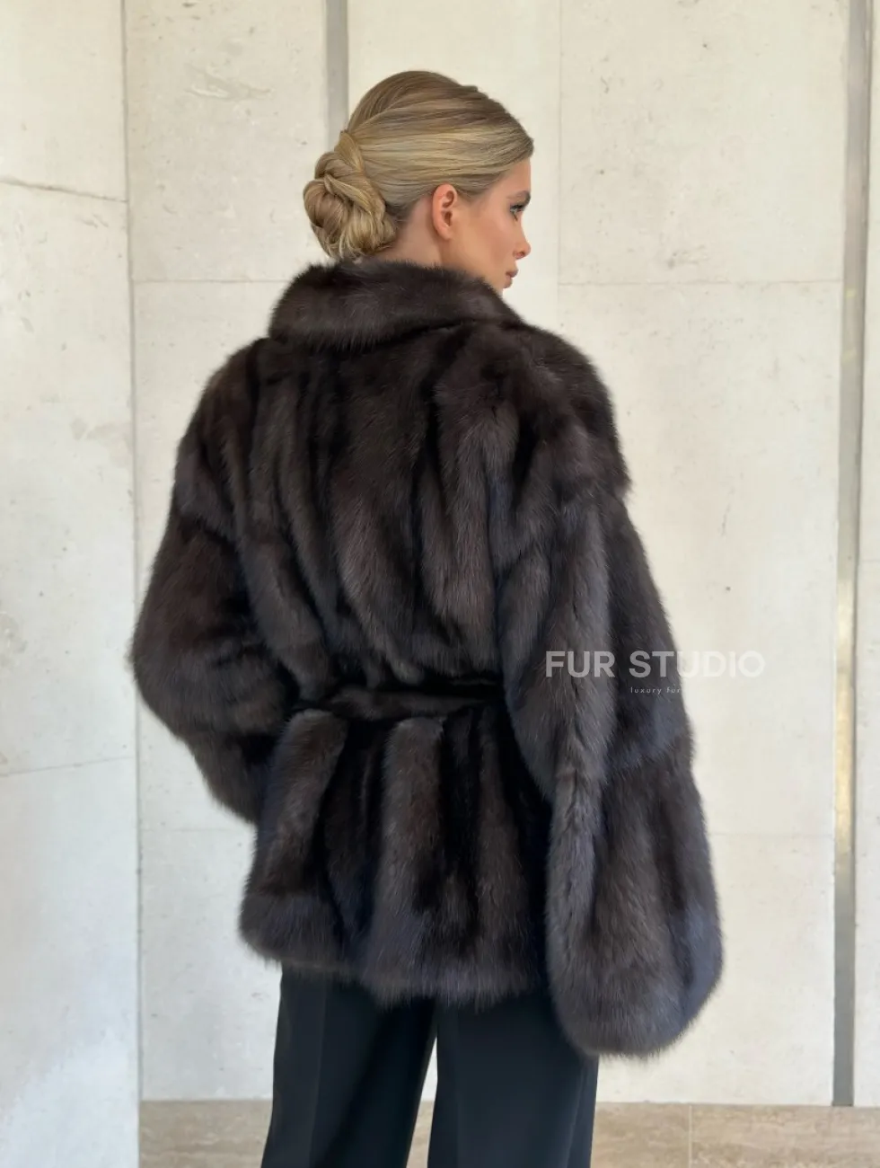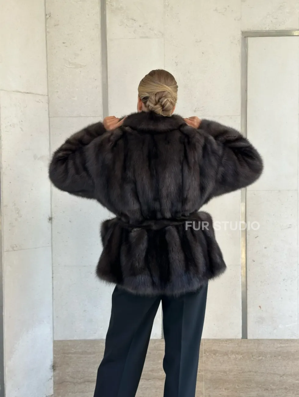 Фасон жакета под пояс из струящегося по фигуре соболиного меха цвета DARK выглядит особенно удачно. В любом размере он не будет выглядеть массивно и мешковато. И даже при том, что его длина всего до середины бедра, в жакете будет тепло и комфортно в любую погоду за счет плотного искрящего серебром подшерстка.