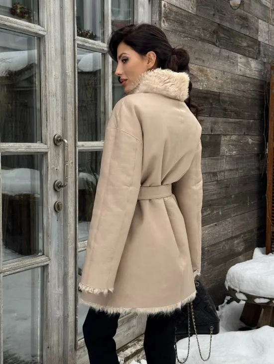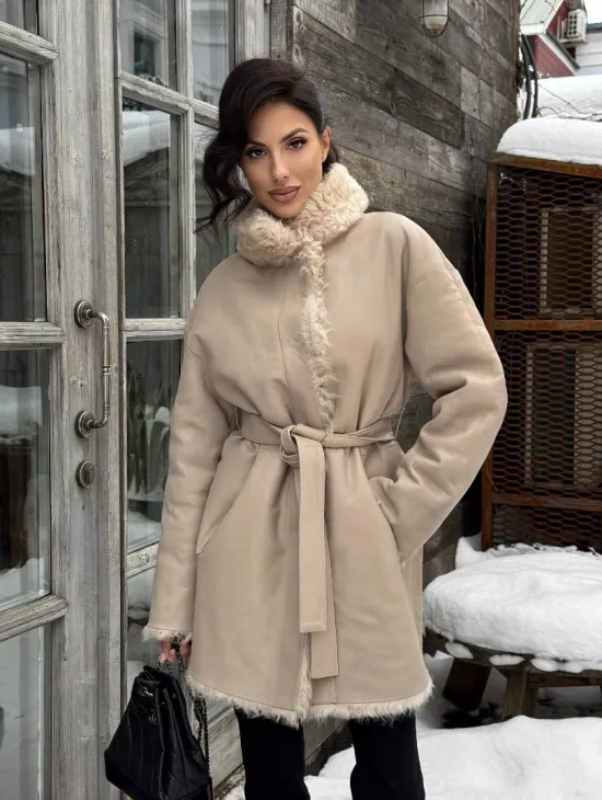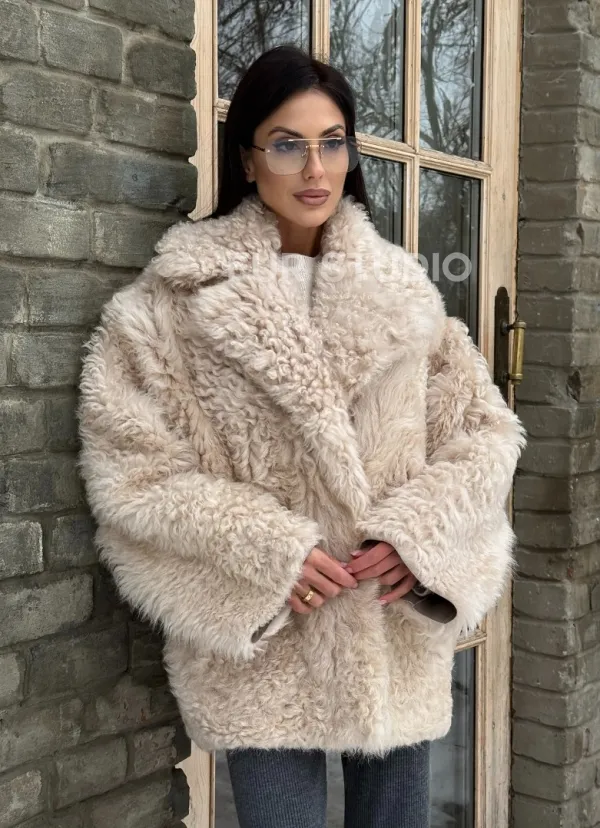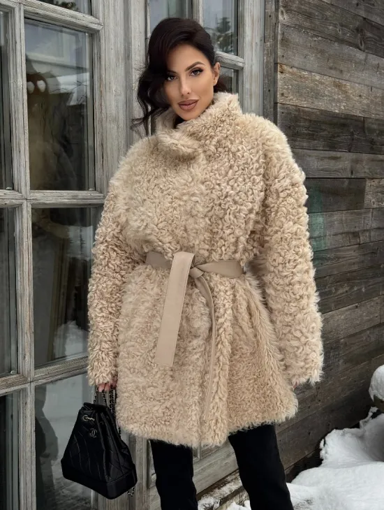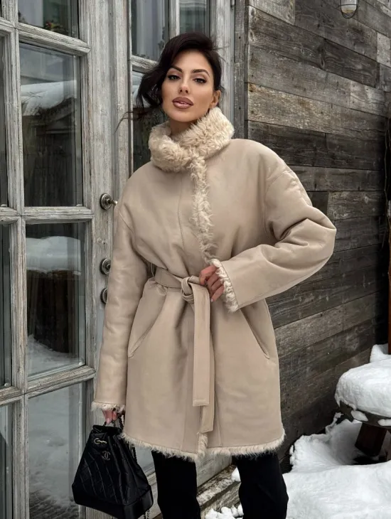 Светлая короткая шуба из испанской овчины. Модель предлагается в размерах от 42 до 48. Оптимальная длина моделей 65-70 см подчеркивает линии вашей фигуры. Эта дубленка станет неотъемлемой частью гардероба для тех, кто предпочитает роскошь и утонченность натуральной кожи.