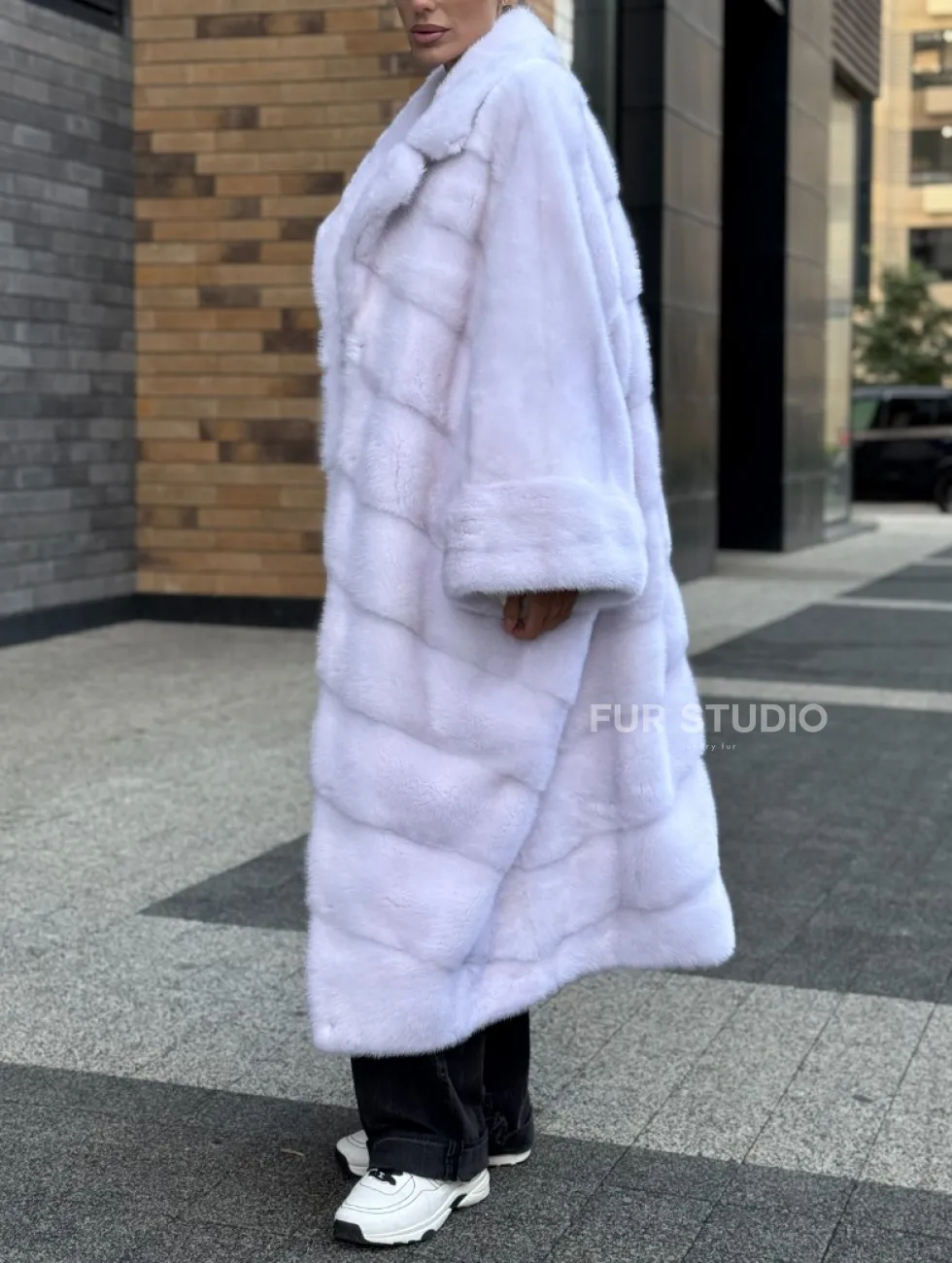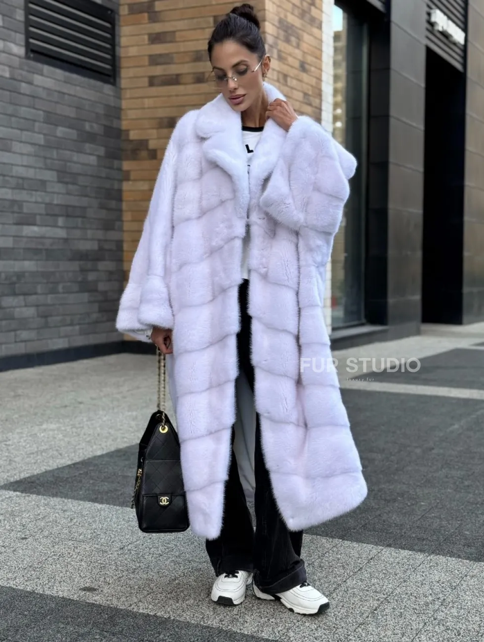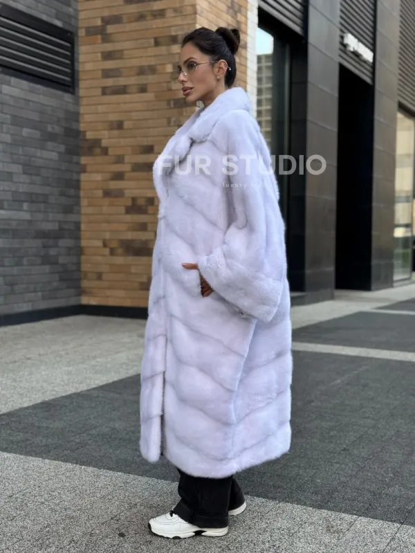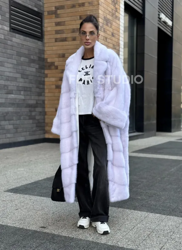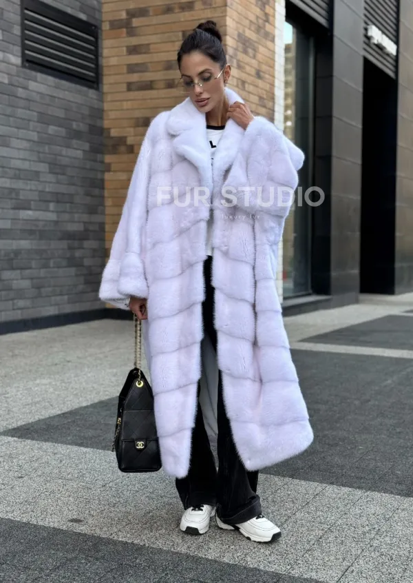 Мех данной шубы аукционная норка , цвет белый. Предлагается в размерах от 42 до 68. Длина модели 115-120 см, что выгодно подчеркивает фигуру девушек. Эта модель идеально подойдет для девушек и женщин, предпочитающих роскошные натуральные меха.