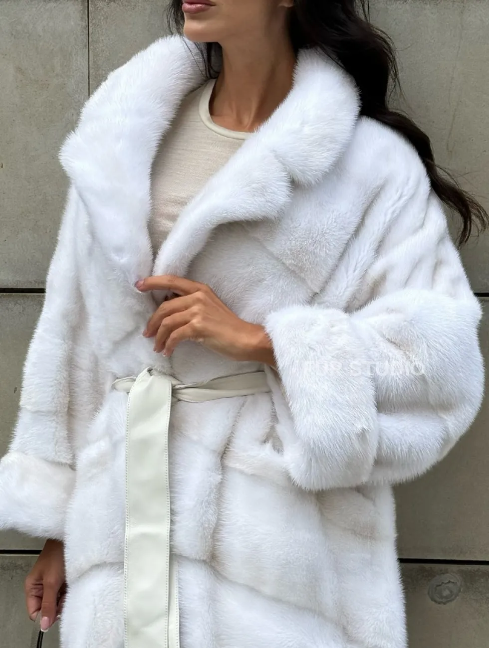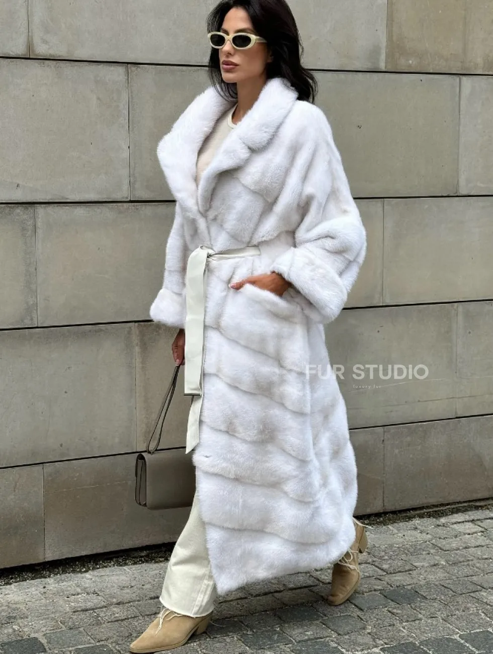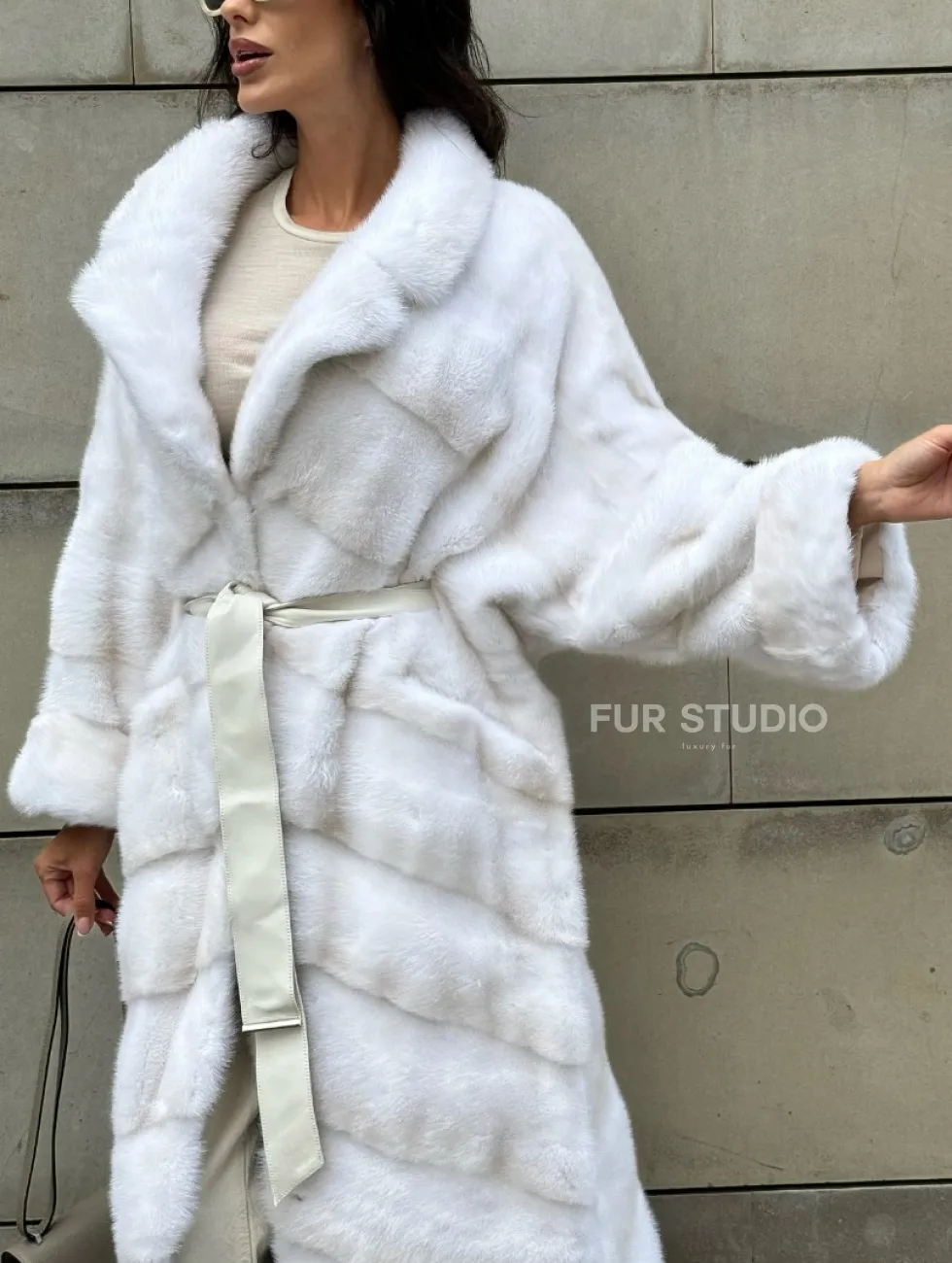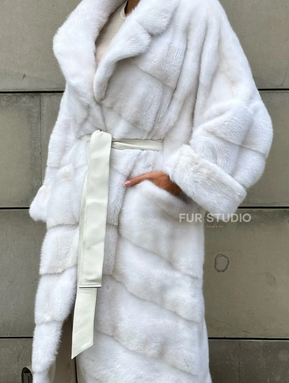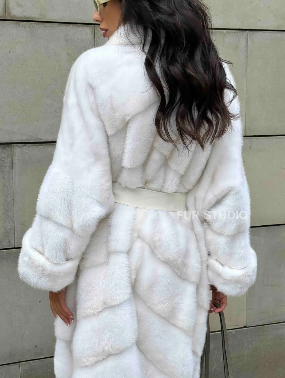 Мех данной шубы аукционная норка, цвет белый. Предлагается в размерах от 42 до 50. Длина модели 125-130 см, что выгодно подчеркивает фигуру девушек. Эта модель идеально подойдет для девушек и женщин, предпочитающих роскошные натуральные меха.