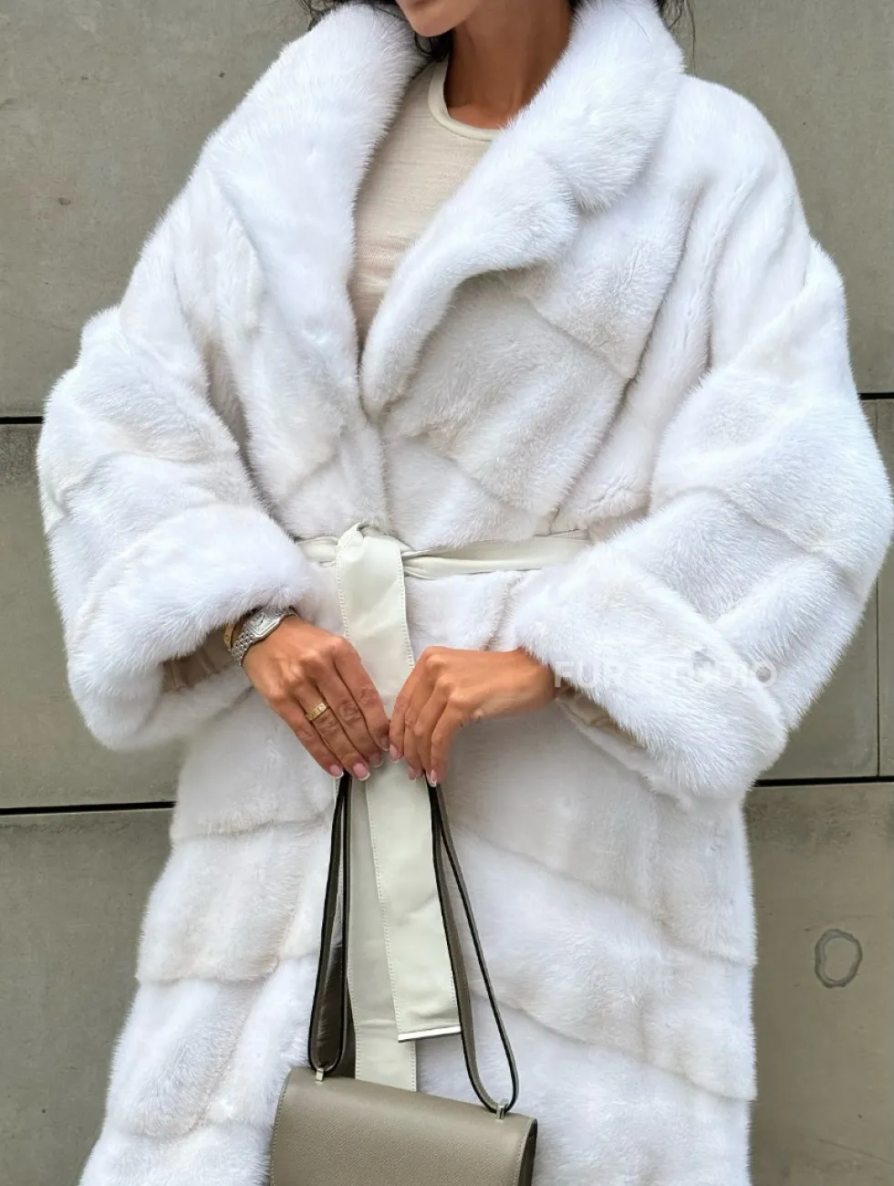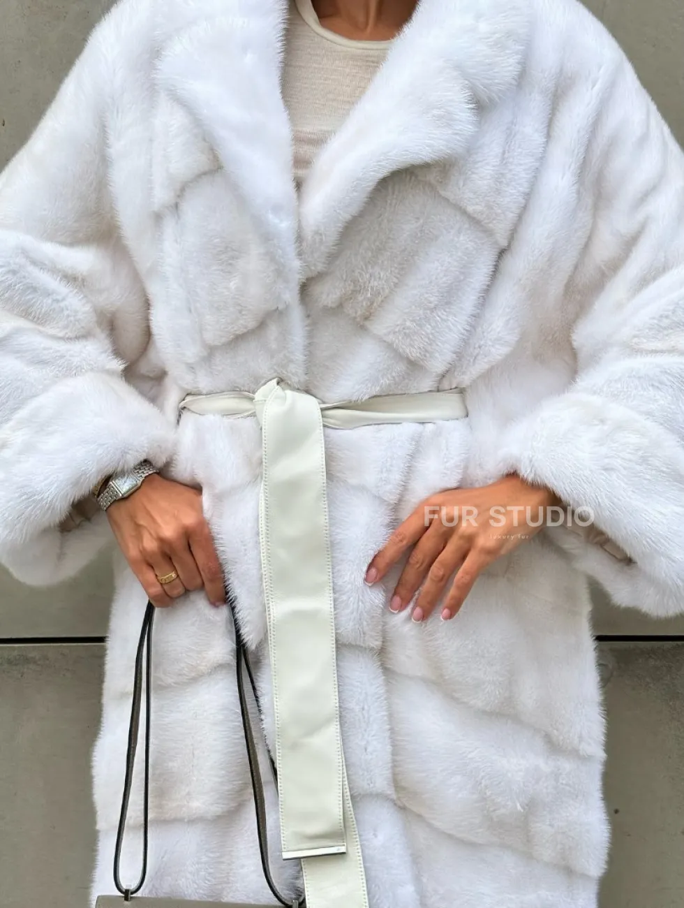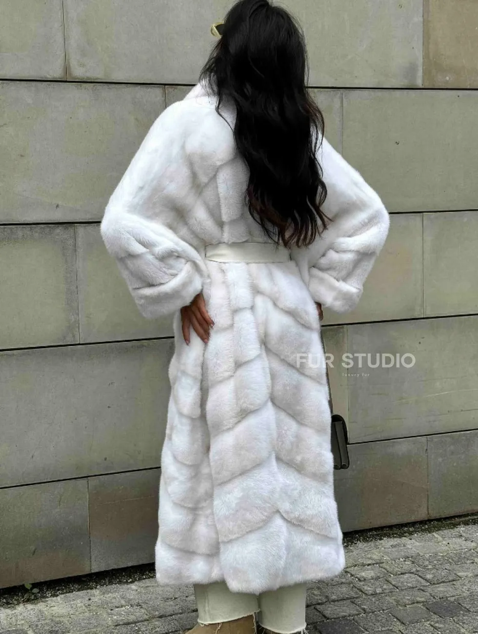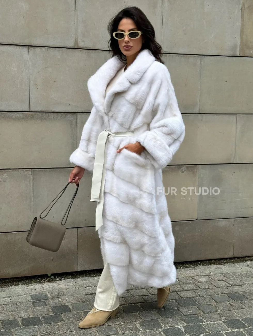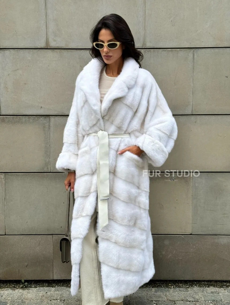 Мех данной шубы аукционная норка, цвет белый. Предлагается в размерах от 42 до 50. Длина модели 125-130 см, что выгодно подчеркивает фигуру девушек. Эта модель идеально подойдет для девушек и женщин, предпочитающих роскошные натуральные меха.