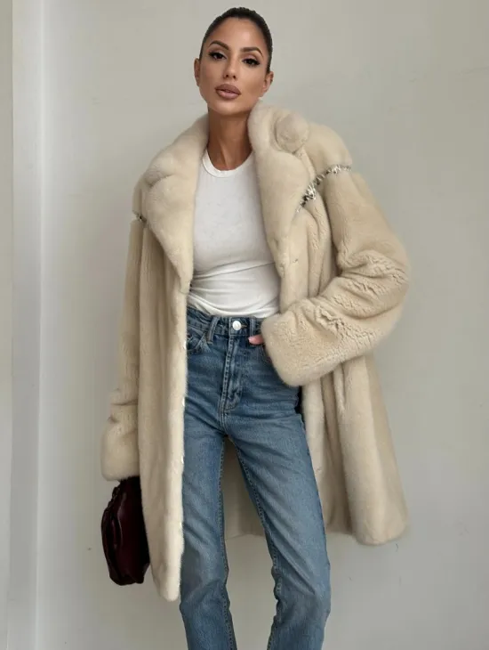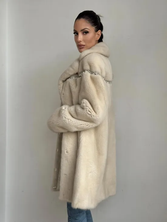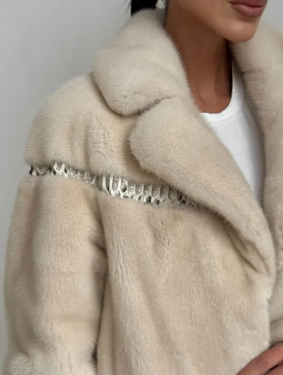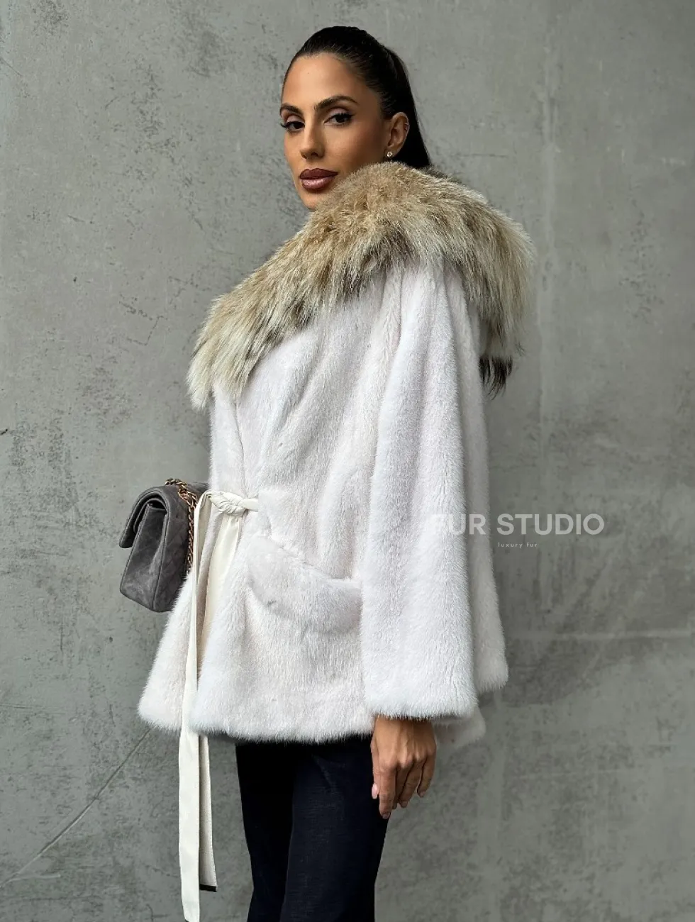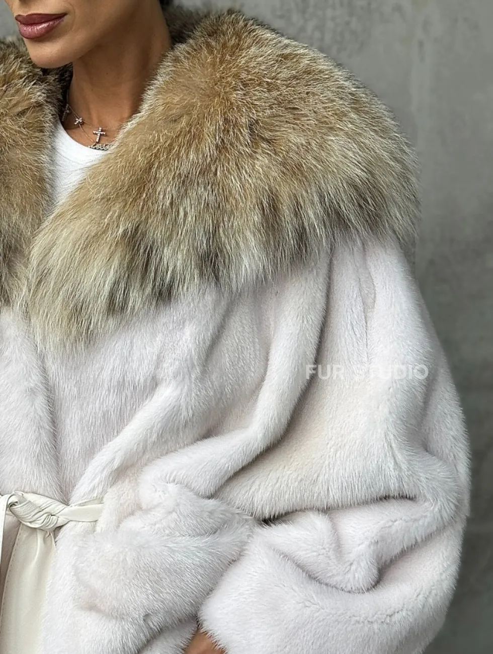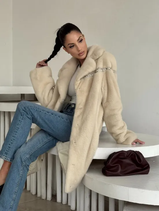 Мех данной шубы аукционная норка, цвет белый. Предлагается в размерах от 42 до 54 (oversize). Длина модели 70-75 см, что выгодно подчеркивает фигуру девушек. Эта модель идеально подойдет для девушек и женщин, предпочитающих роскошные натуральные меха.
