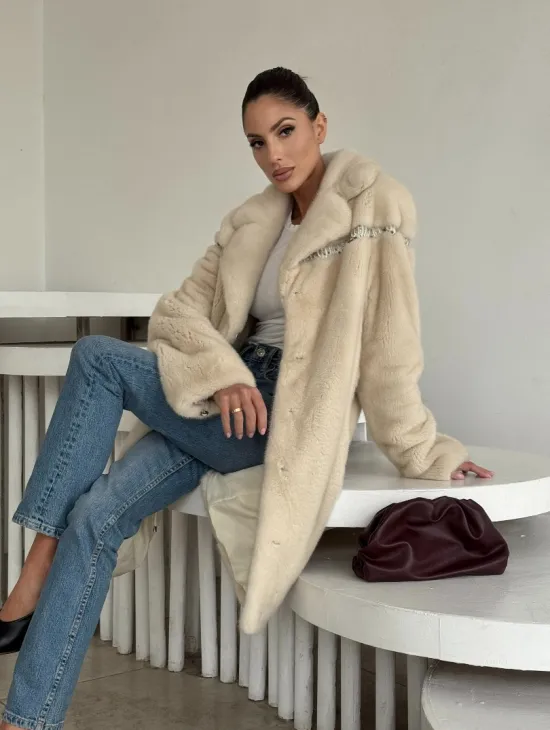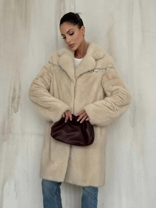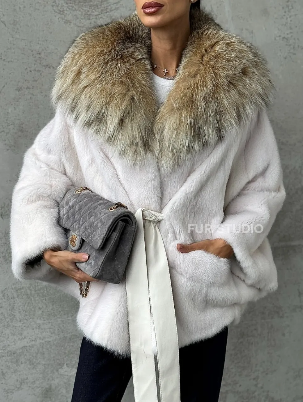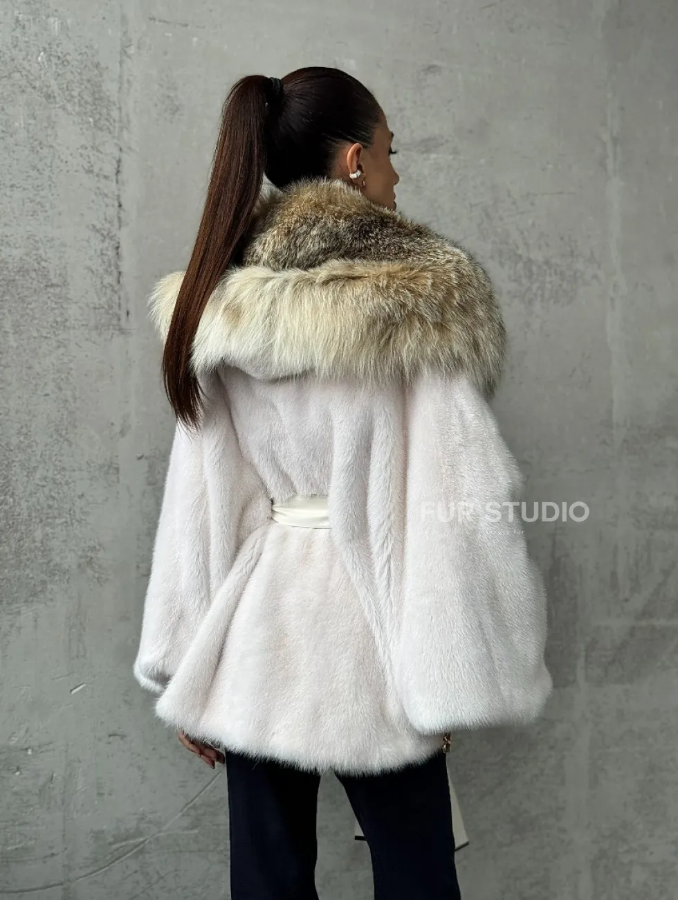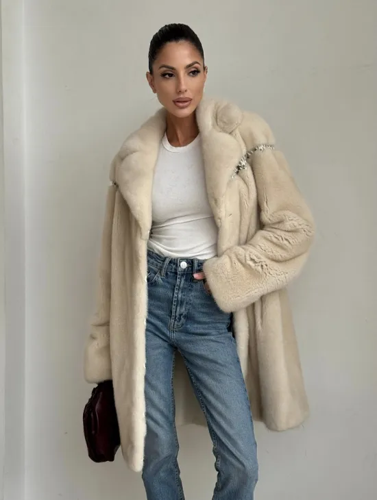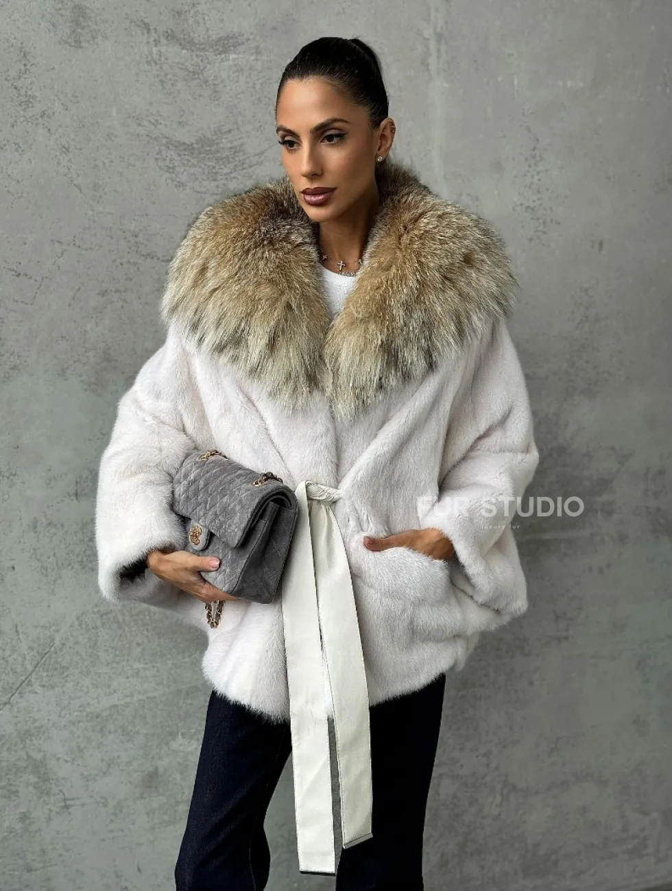 Мех данной шубы аукционная норка, цвет белый. Предлагается в размерах от 42 до 54 (oversize). Длина модели 70-75 см, что выгодно подчеркивает фигуру девушек. Эта модель идеально подойдет для девушек и женщин, предпочитающих роскошные натуральные меха.