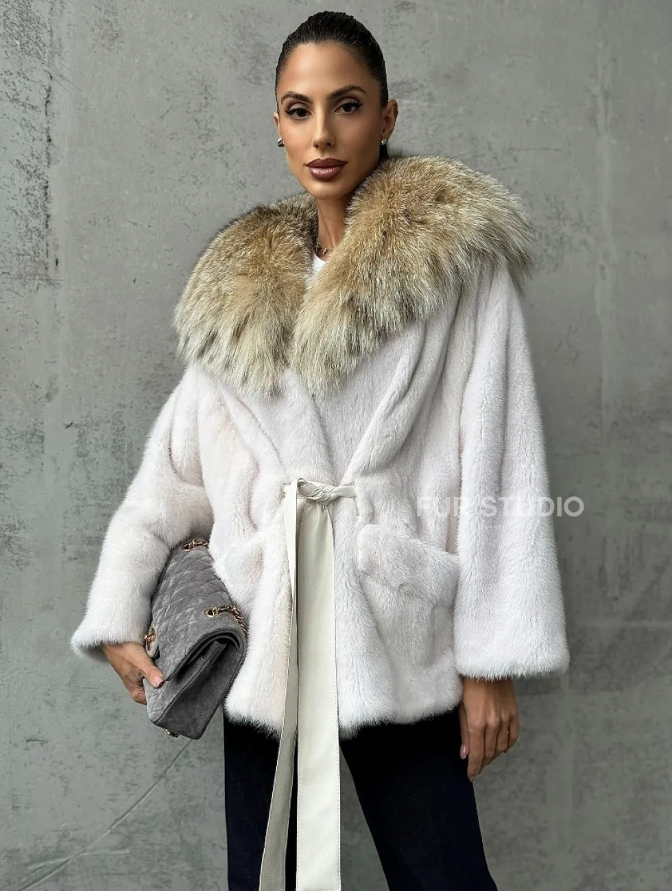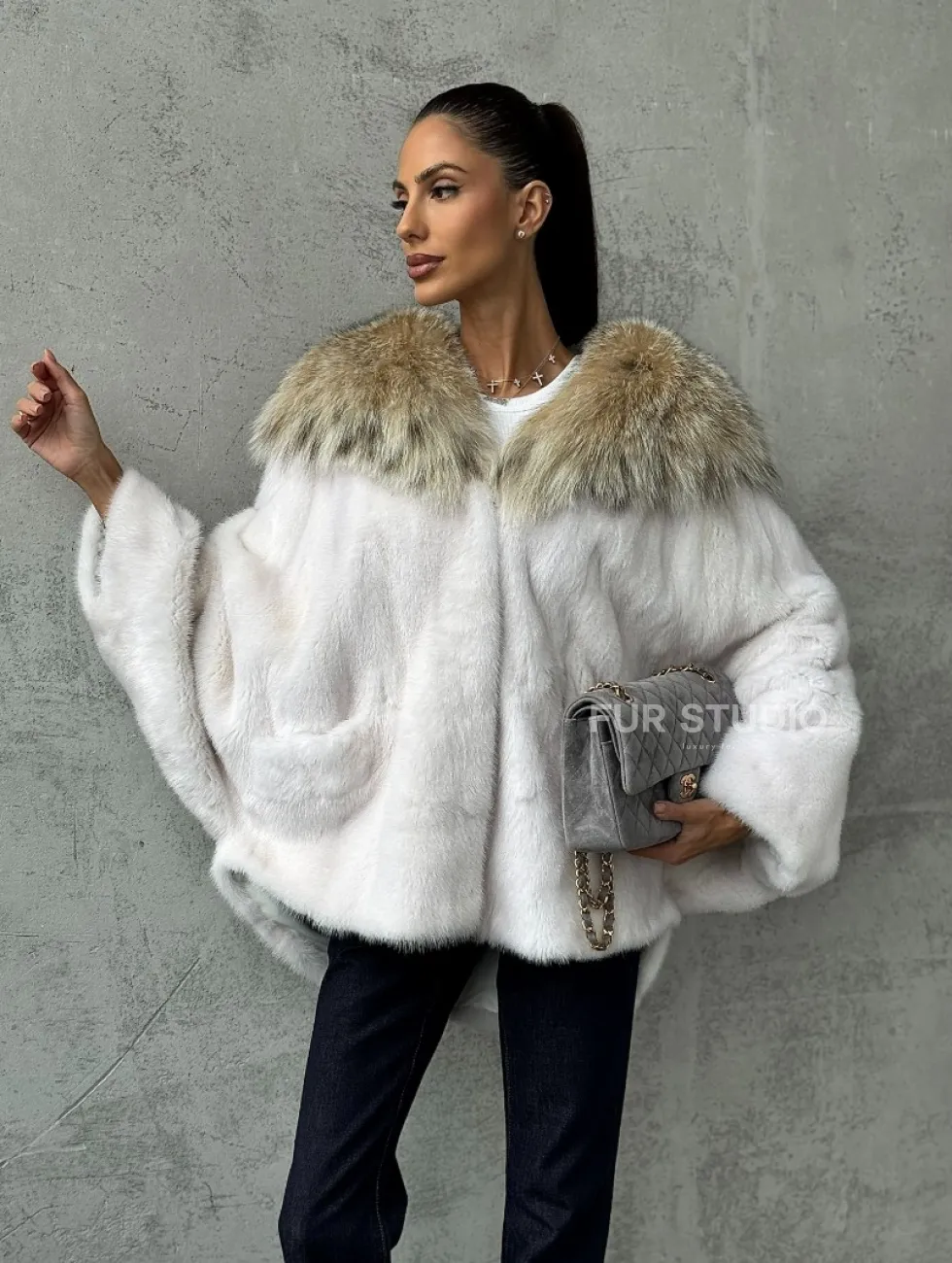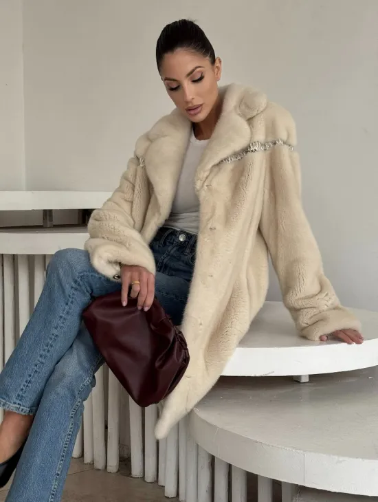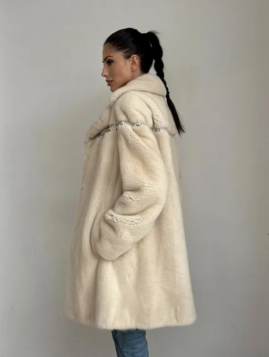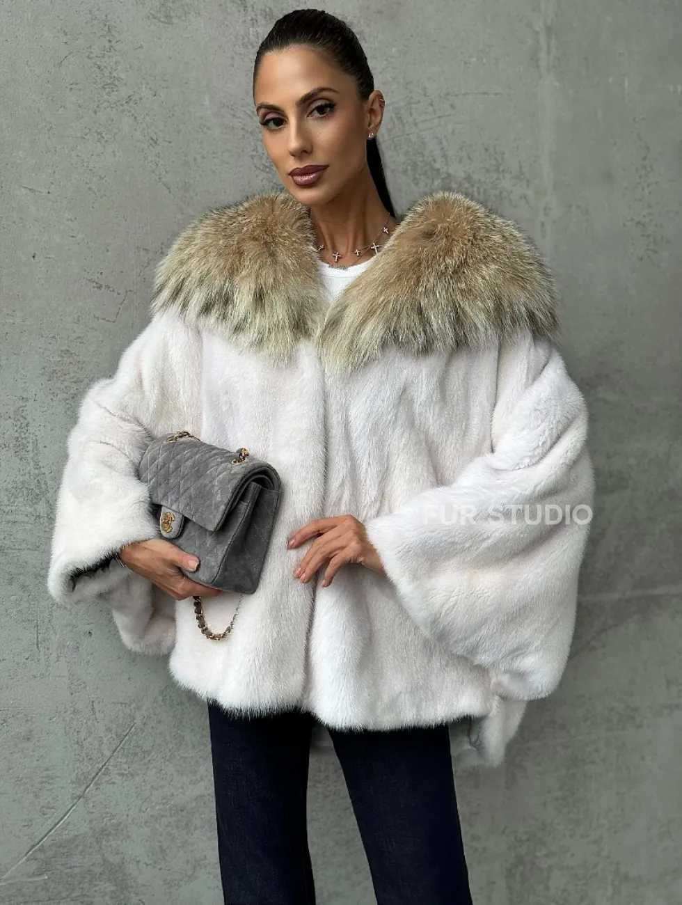 Мех данной шубы аукционная норка, цвет белый. Предлагается в размерах от 42 до 54 (oversize). Длина модели 70-75 см, что выгодно подчеркивает фигуру девушек. Эта модель идеально подойдет для девушек и женщин, предпочитающих роскошные натуральные меха.