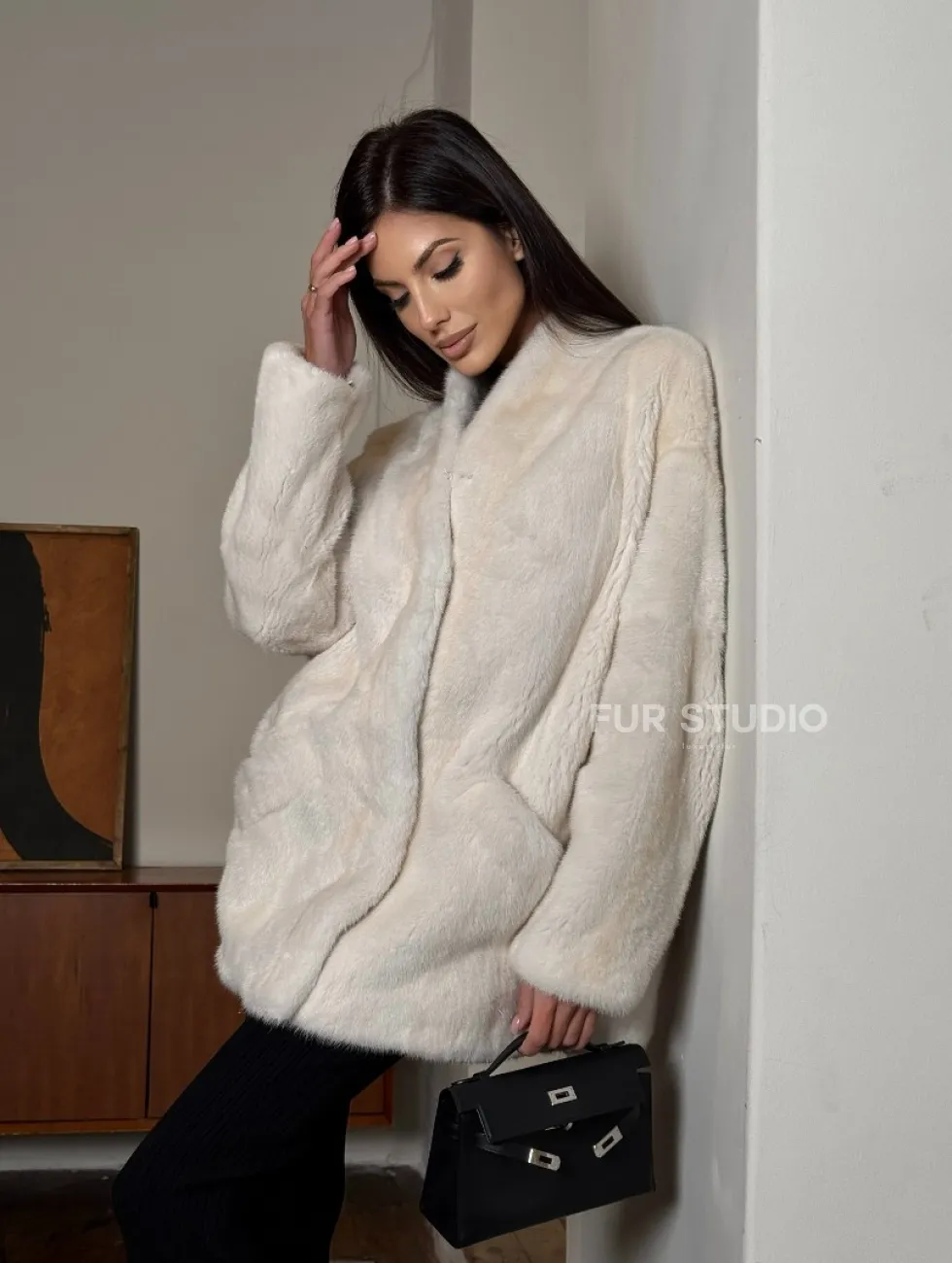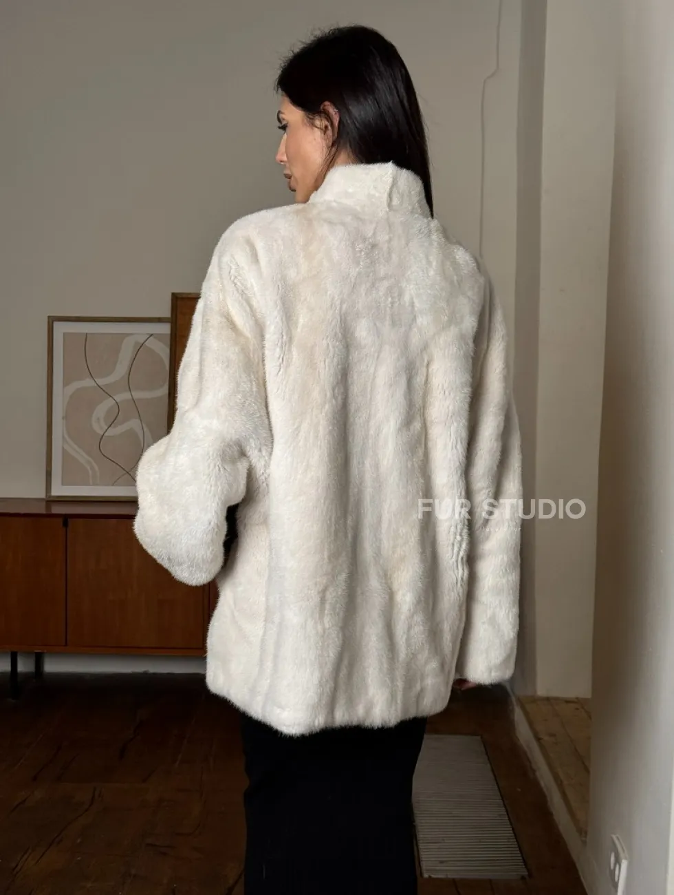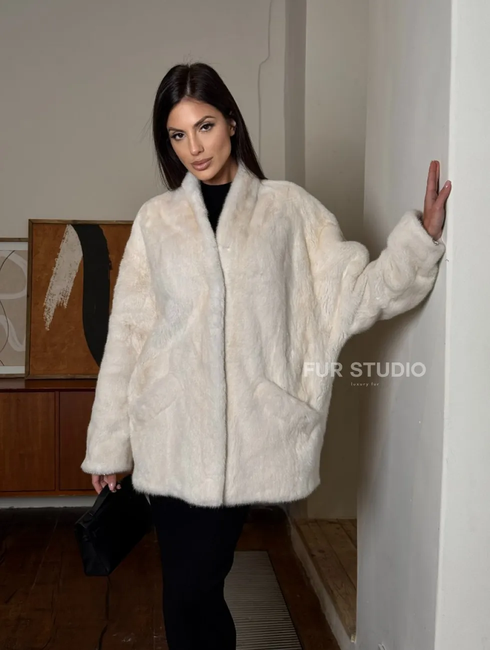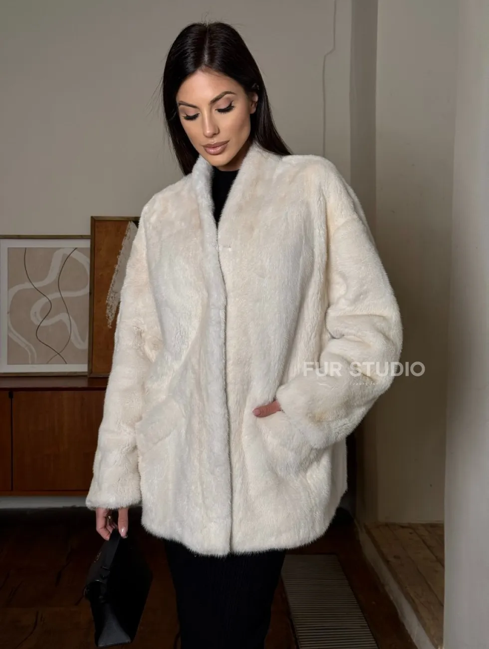 Светлый норковый полушубок жакет с V-образным воротником доступна для покупки в нашем шоуруме Furs Studio в Чите. У нас так же есть доставка во все города России. Добавьте немного роскоши в свой гардероб с этой шубой, которая будет служить вам многие годы.