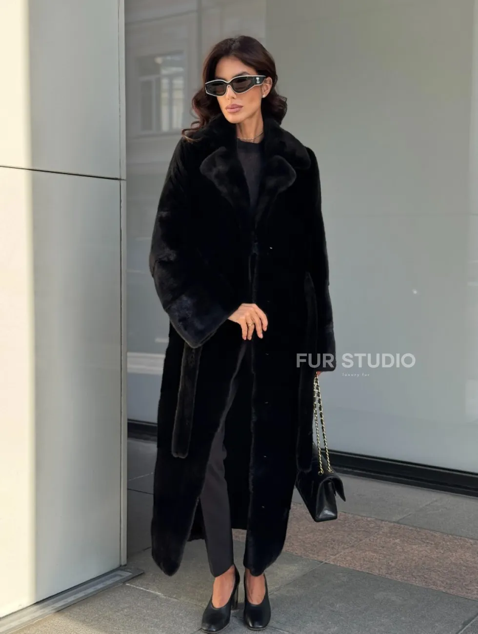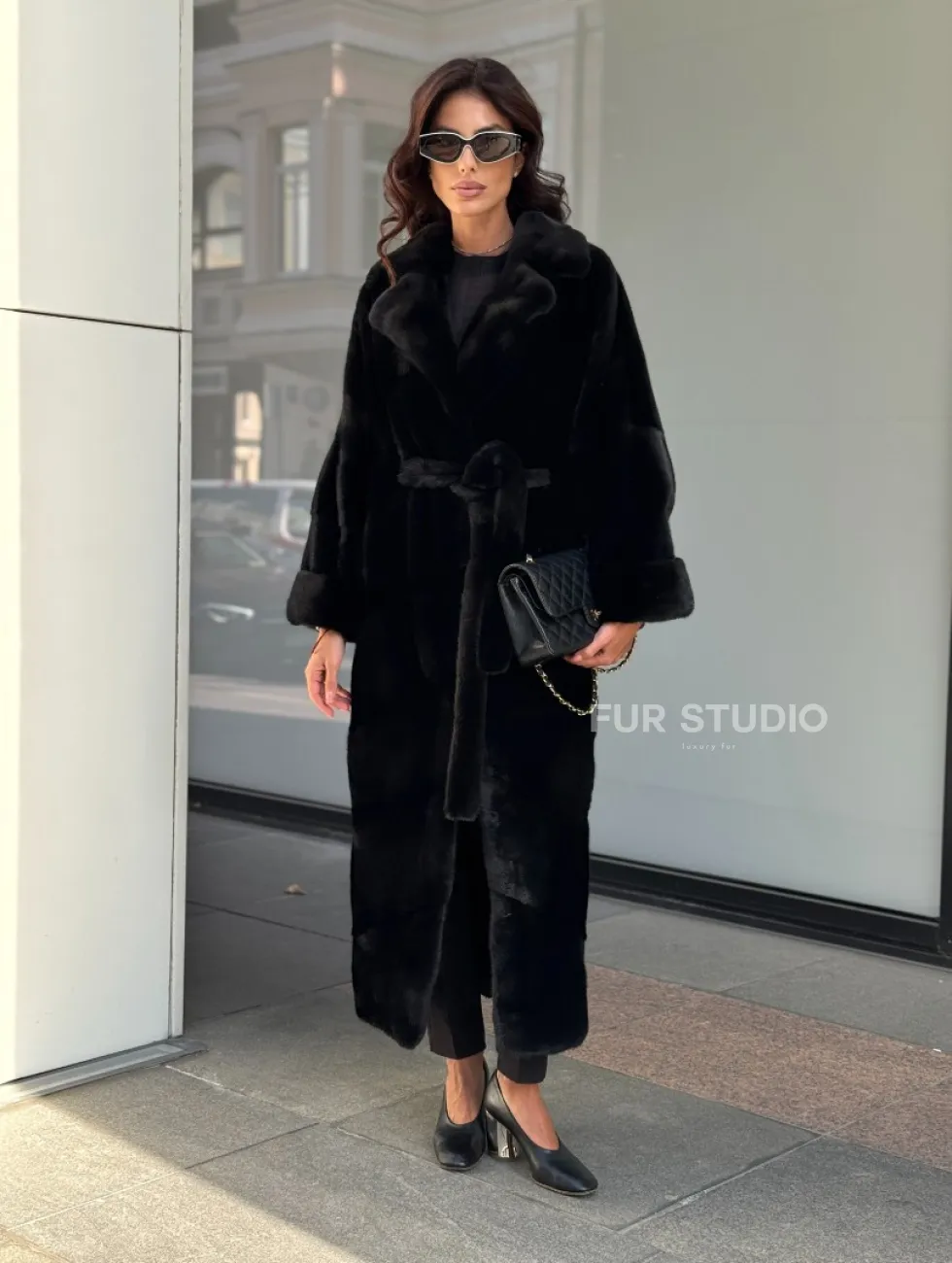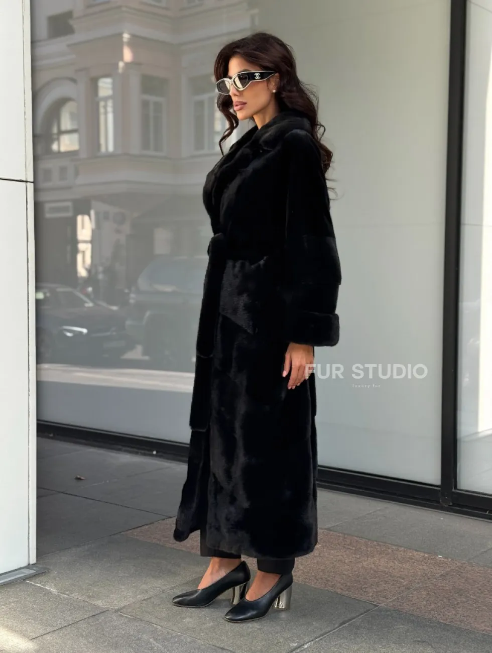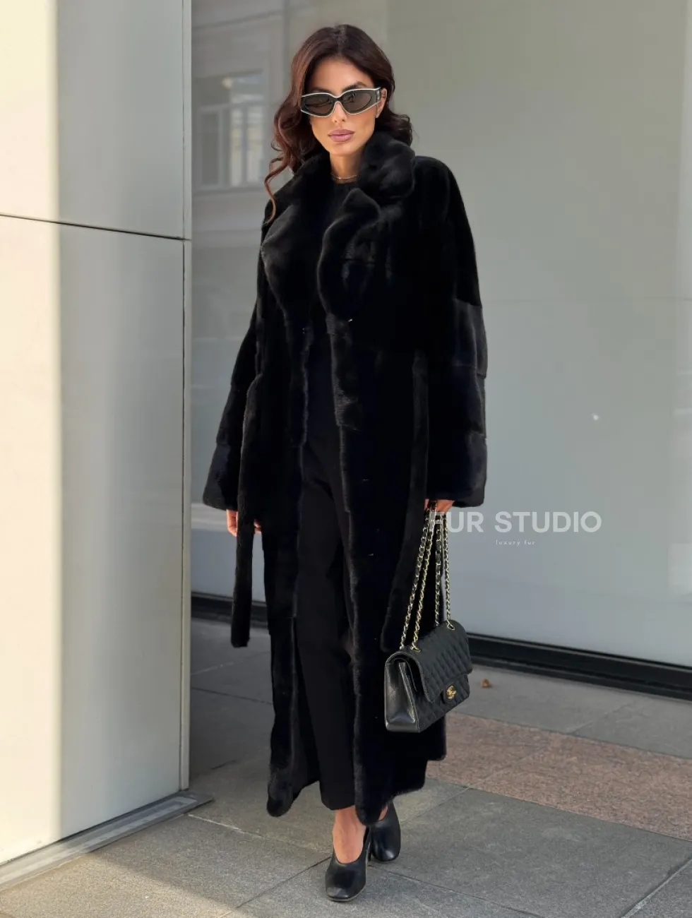 Удлиненная черная шуба с поясом из скандинавской норки 100150