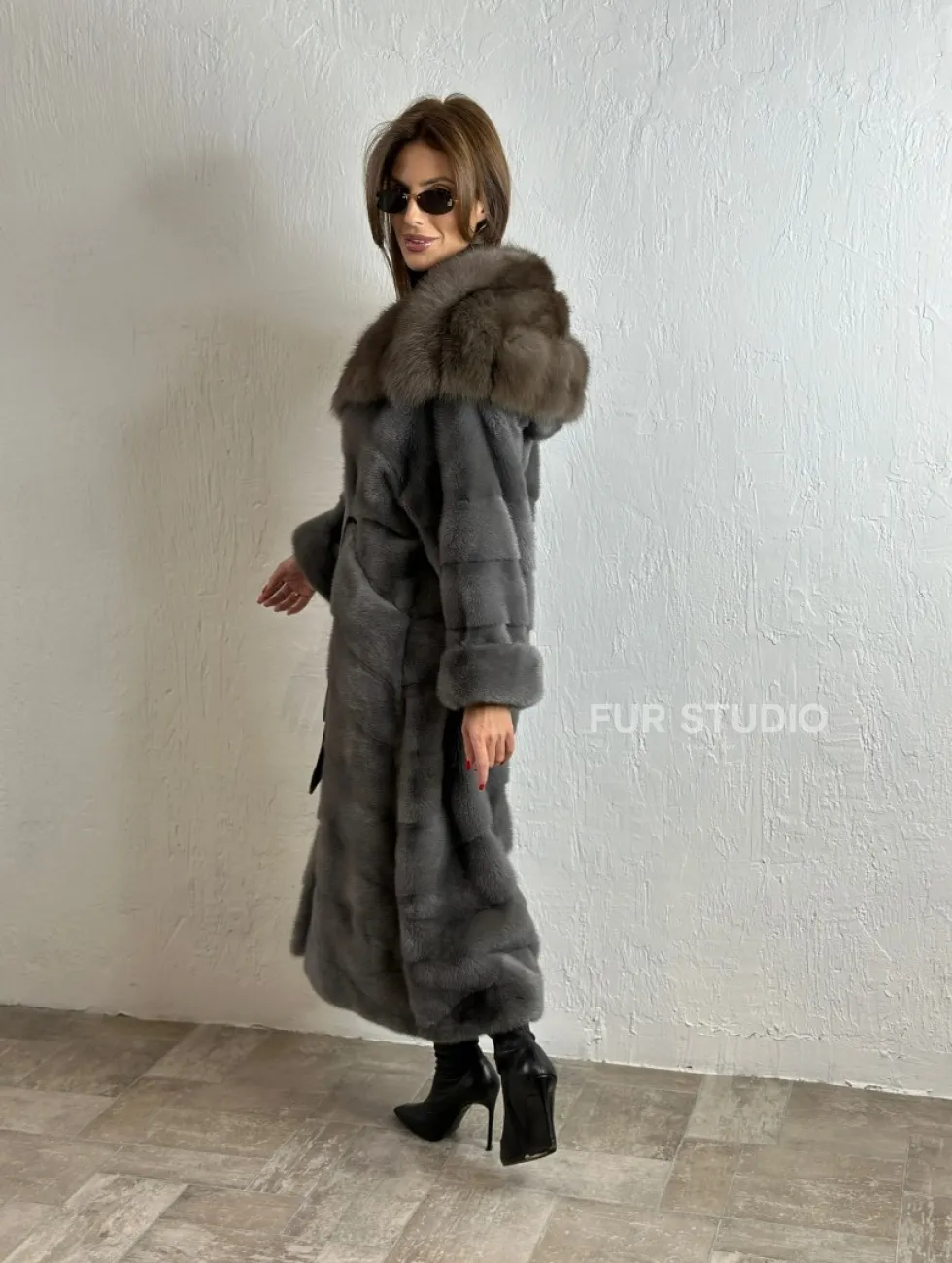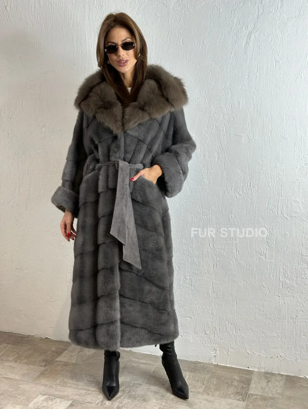 Глубокие карманы согреют ваши ручки. Прямой силуэт визуально увеличит рост и скроет недостатки фигуры. Стильный пояс выделит талию и сделает ее тонкой. Модель подойдет под классический look и к вечернему образу. Купить шубу норковую с капюшоном из меха в цвете графит грей - это прекрасное вложение в себя.
