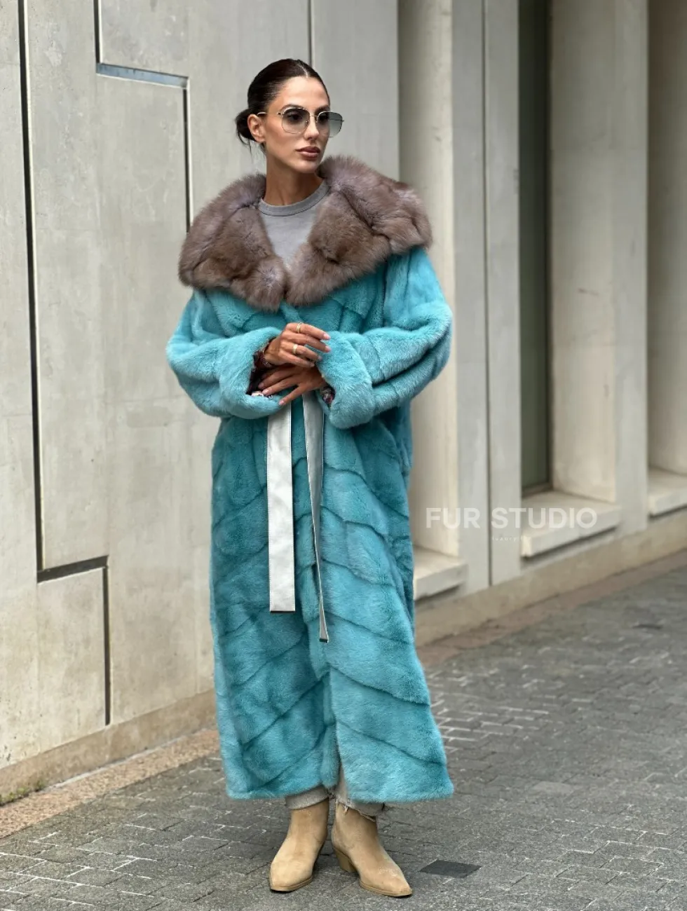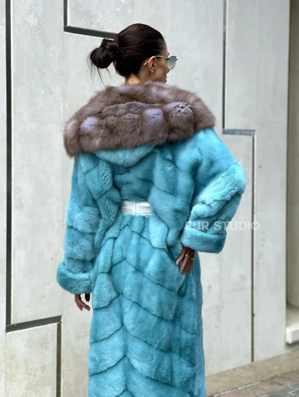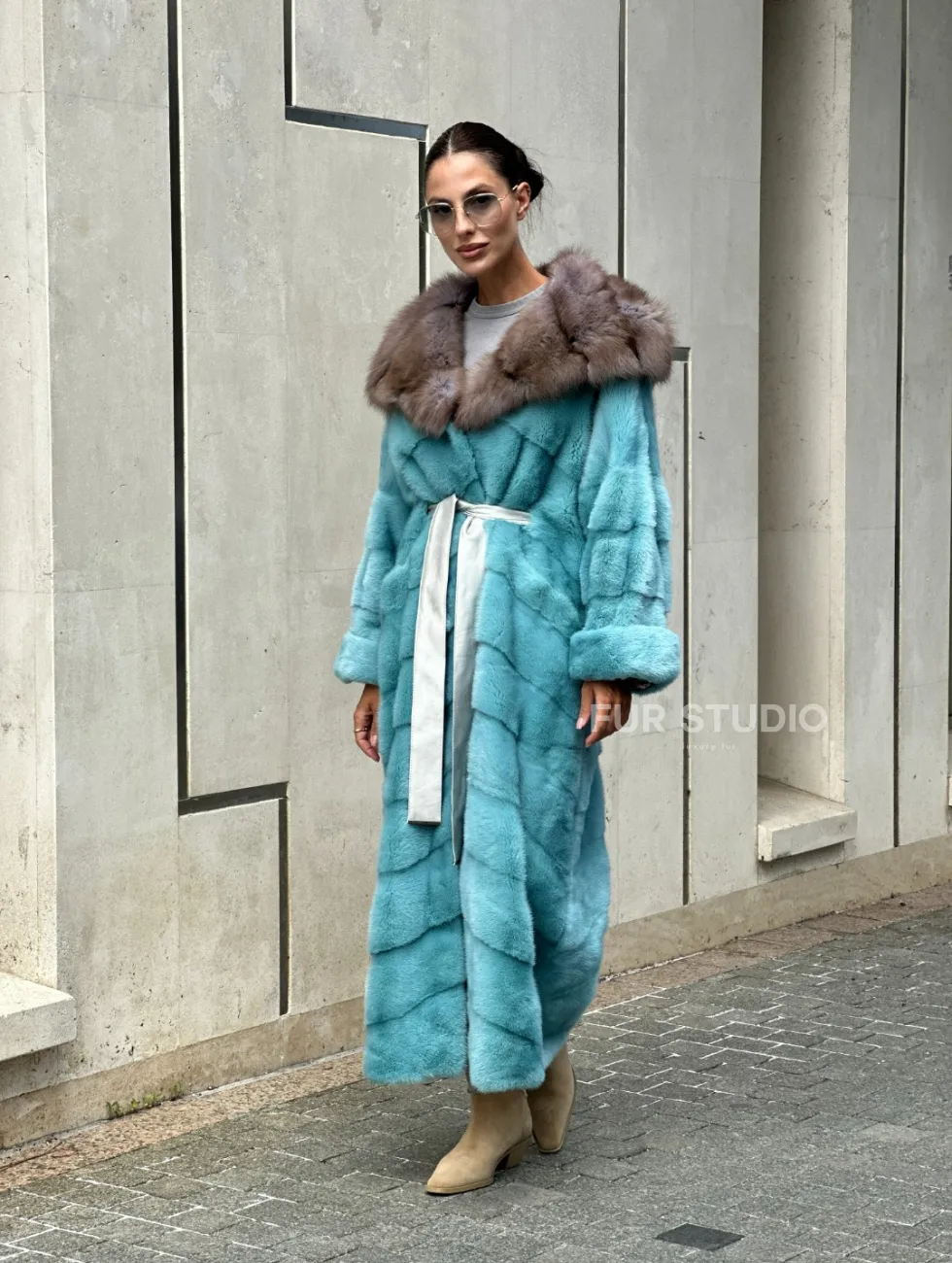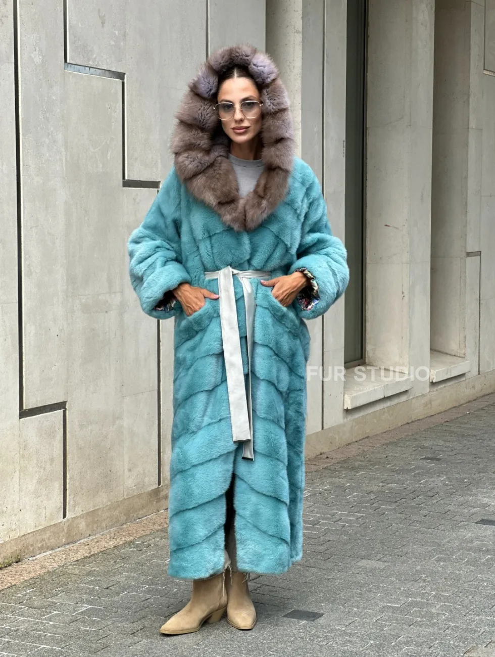 Удлиненная норковая шуба с капюшоном из меха куницы - цвет Тиффани доступна для покупки в нашем шоуруме Furs Studio в Чите. У нас так же есть доставка во все города России. Добавьте немного роскоши в свой гардероб с этой шубой, которая будет служить вам многие годы.