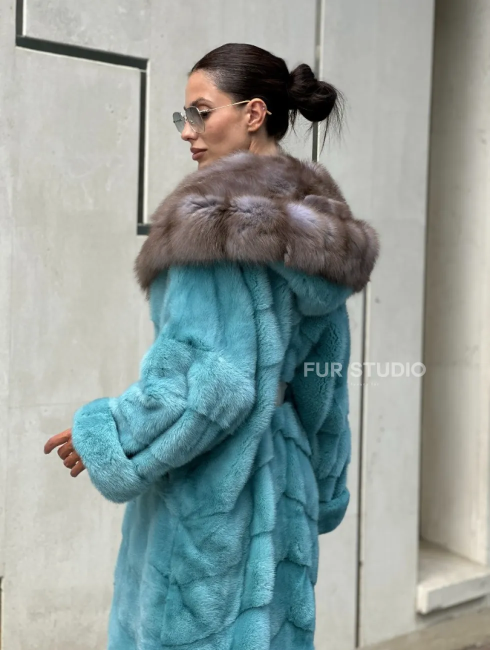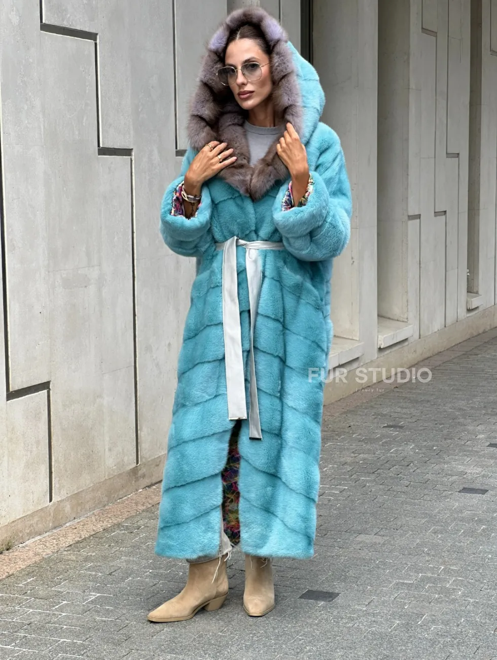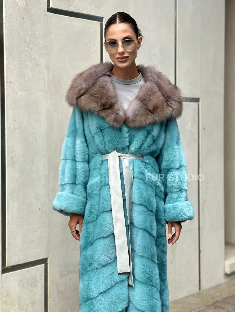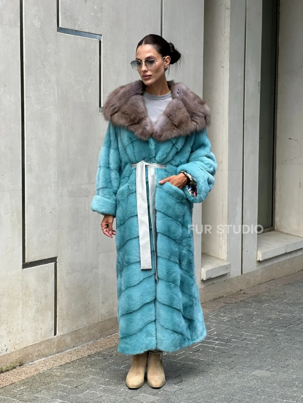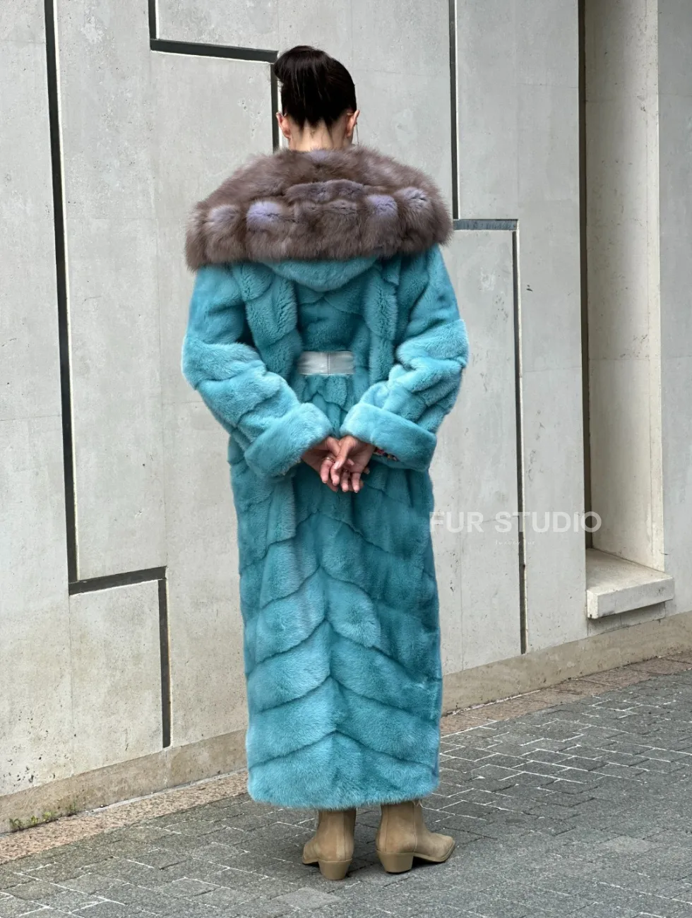 Удлиненная норковая шуба с капюшоном из меха куницы - цвет Тиффани доступна для покупки в нашем шоуруме Furs Studio в Чите. У нас так же есть доставка во все города России. Добавьте немного роскоши в свой гардероб с этой шубой, которая будет служить вам многие годы.