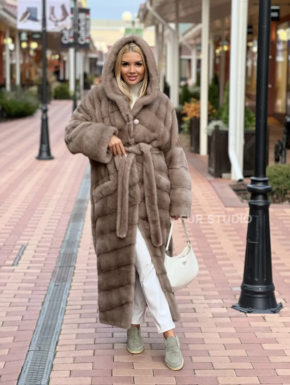 Удобные карманы позаботятся о комфорте ручек в холода. Роскошный капюшон сохранит прическу и не даст замерзнуть голове. Широкие манжеты выгодно подчеркивают тонкость кистей. Добавьте к образу необычную сумочку и комфортную обувь, вы будете выглядеть, как с обложки журнала. Купить удлиненную норковую шубу с капюшоном в цвете пастель могут женщины, которые любят роскошь и непревзойденное качество.