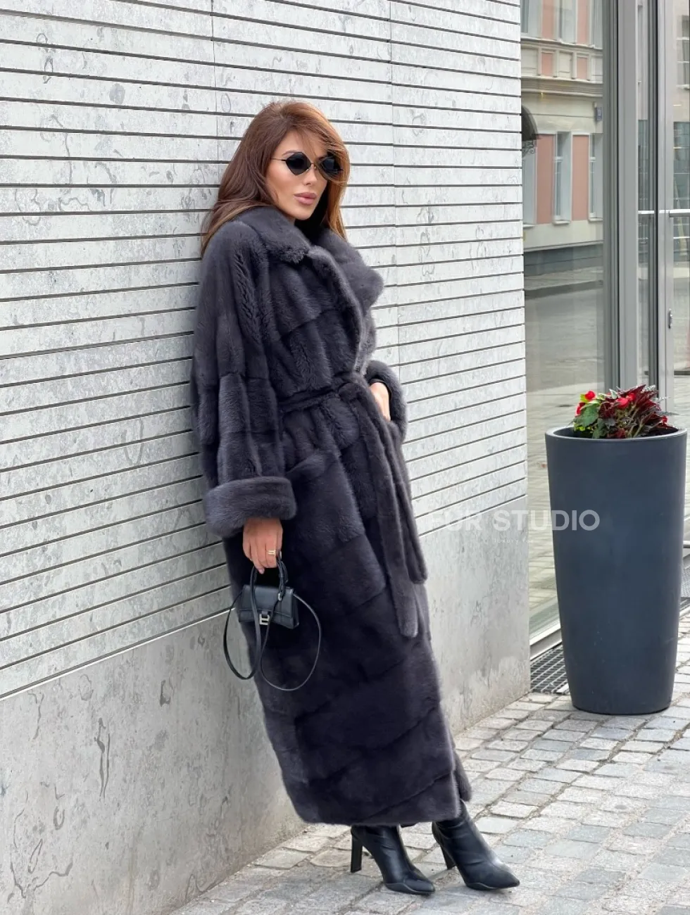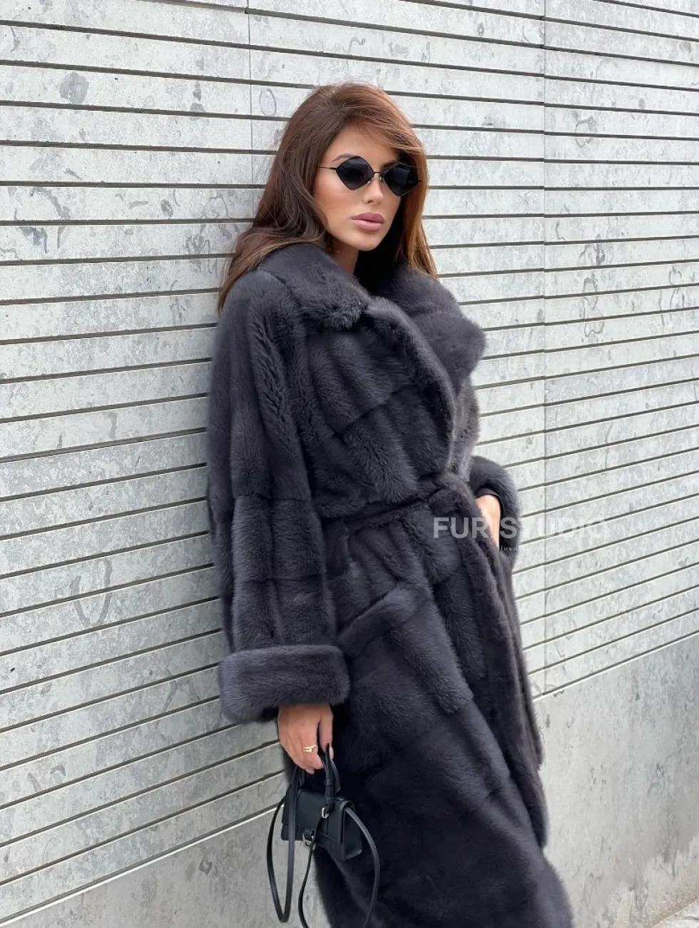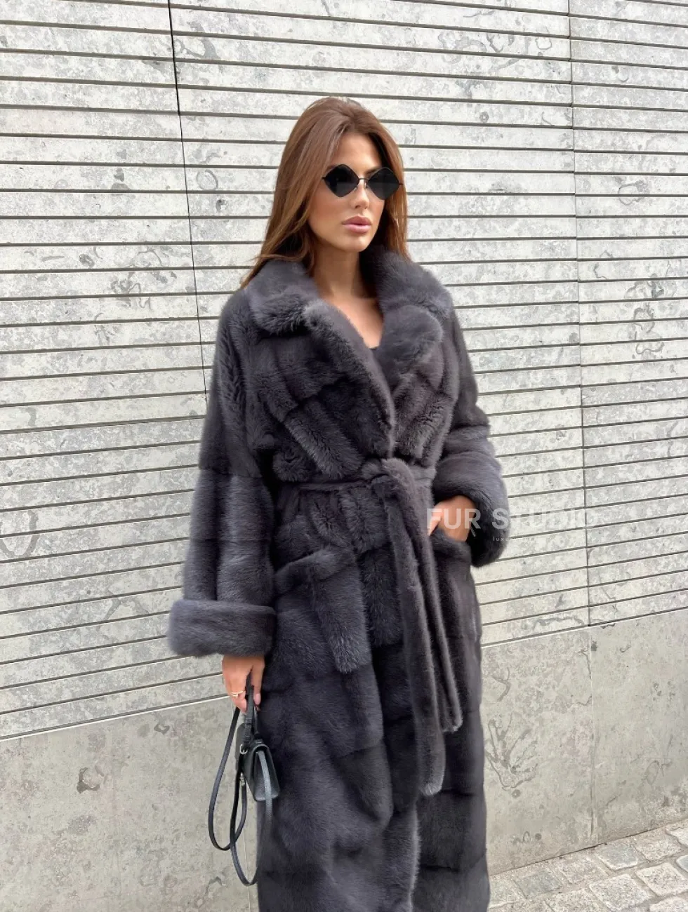 Удлиненная шуба из норки в цвете графит – прекрасный выбор изысканных дам. Удачный крой изделия выгодно подчеркнет достоинства фигуры. Удлиненная модель защитит от холода даже девушек, которые любят носить короткие платья или юбки. Пояс выделит талию.