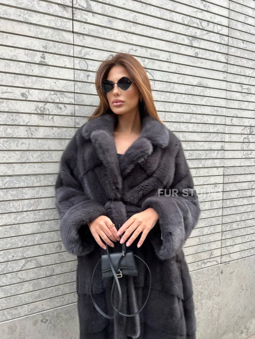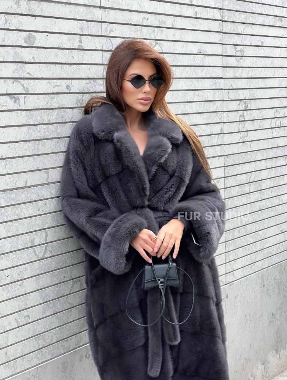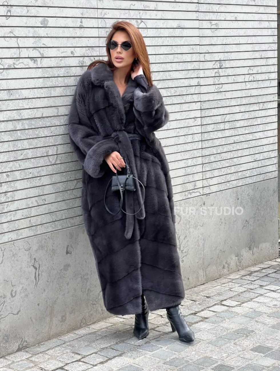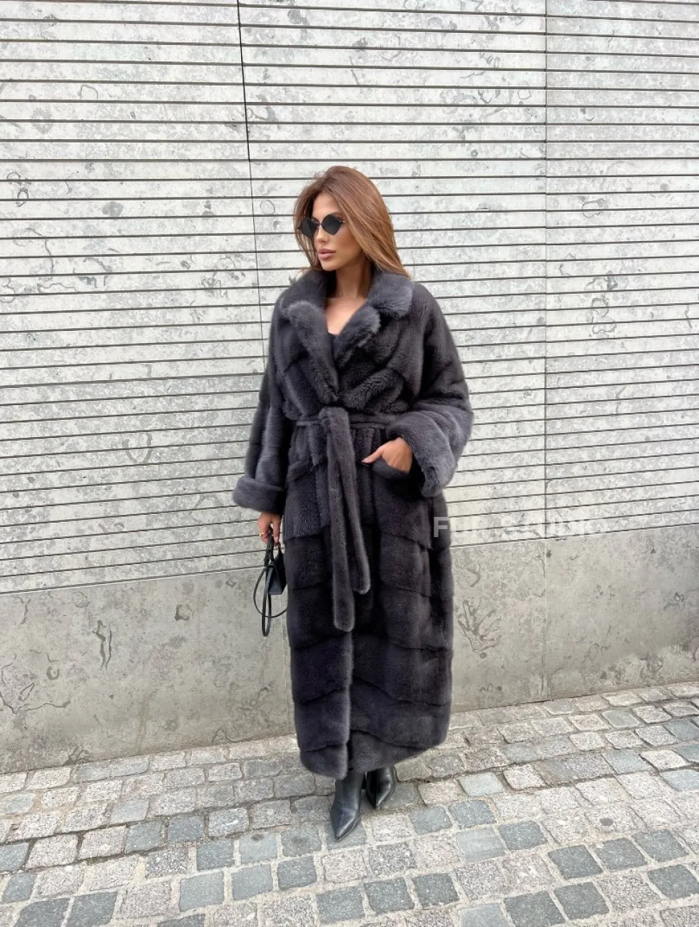 Удлиненная шуба из норки в цвете графит – прекрасный выбор изысканных дам. Удачный крой изделия выгодно подчеркнет достоинства фигуры. Удлиненная модель защитит от холода даже девушек, которые любят носить короткие платья или юбки. Пояс выделит талию.