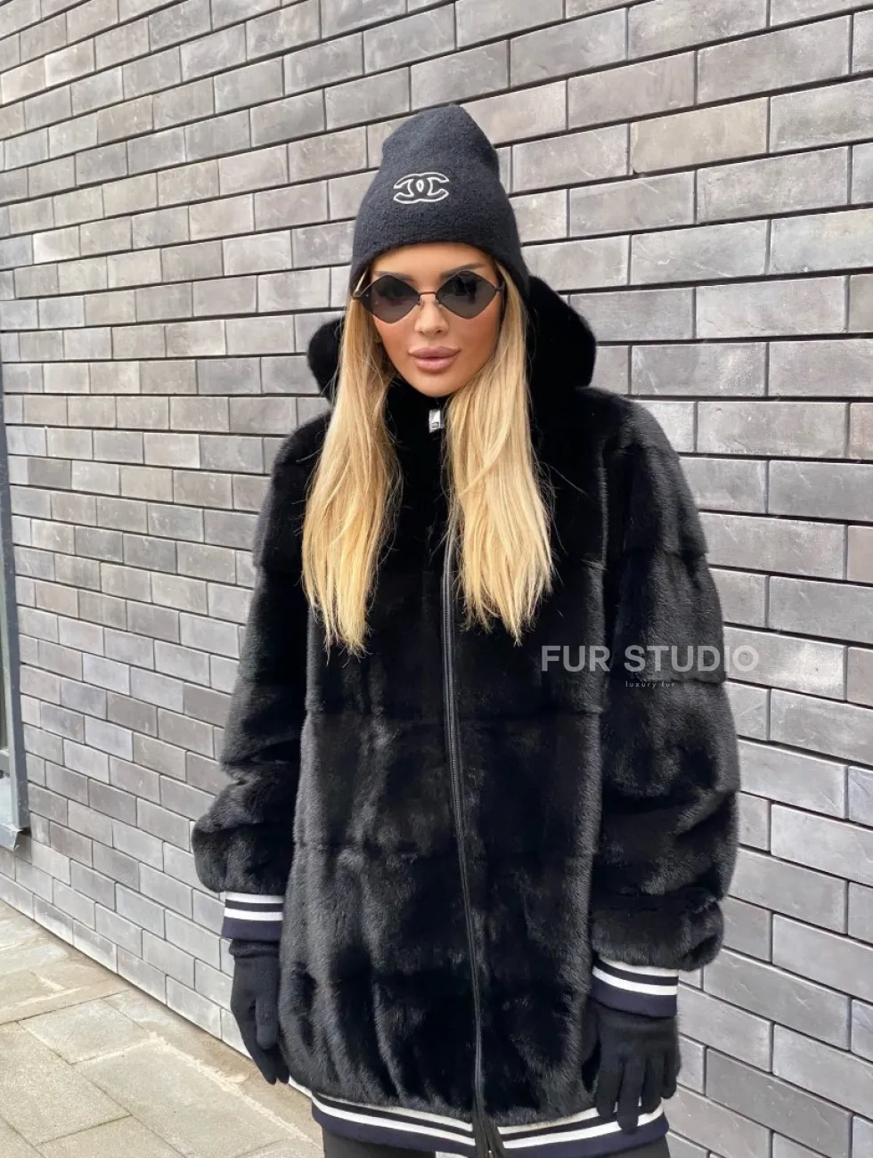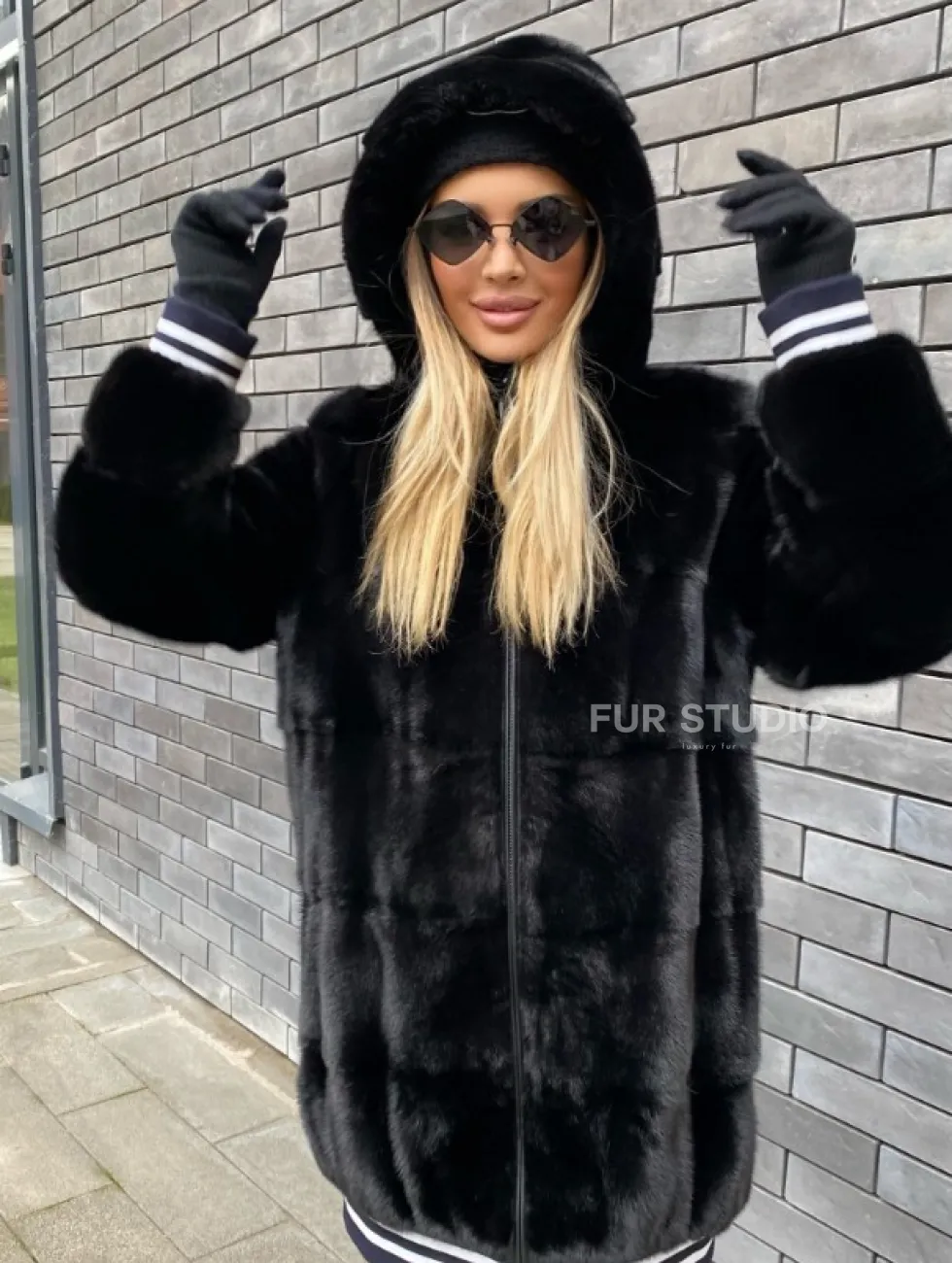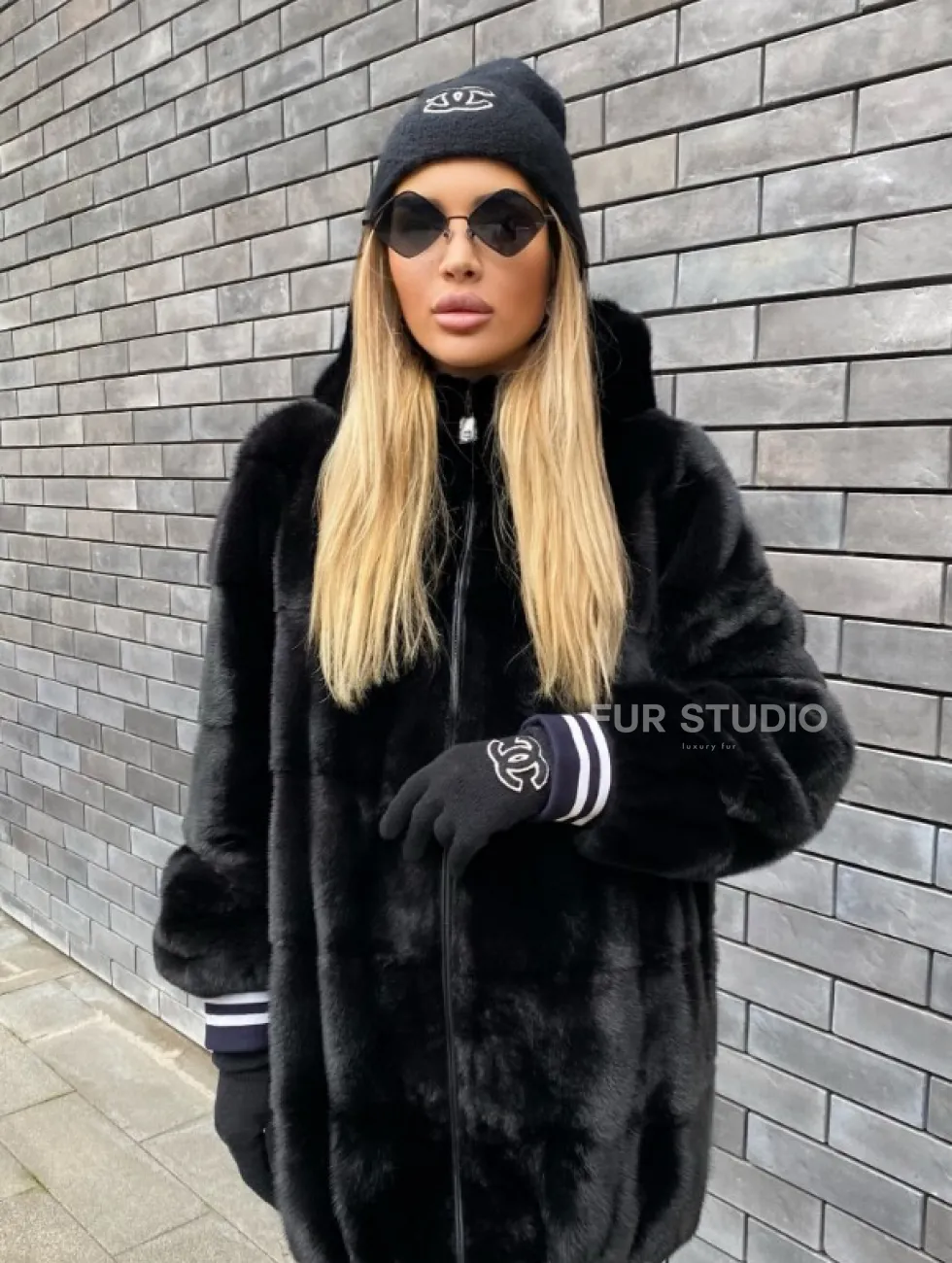 Удлиненный бомбер из меха скандинавской норки с капюшоном на молнии – выбор девушек с изысканным вкусом. Свободный крой удлиняет силуэт и скроет недостатки фигуры. Нежный мех скандинавской норки бережно согреет владелицу в лютые морозы. Шикарный капюшон позаботится о прическе в ветреную погоду.