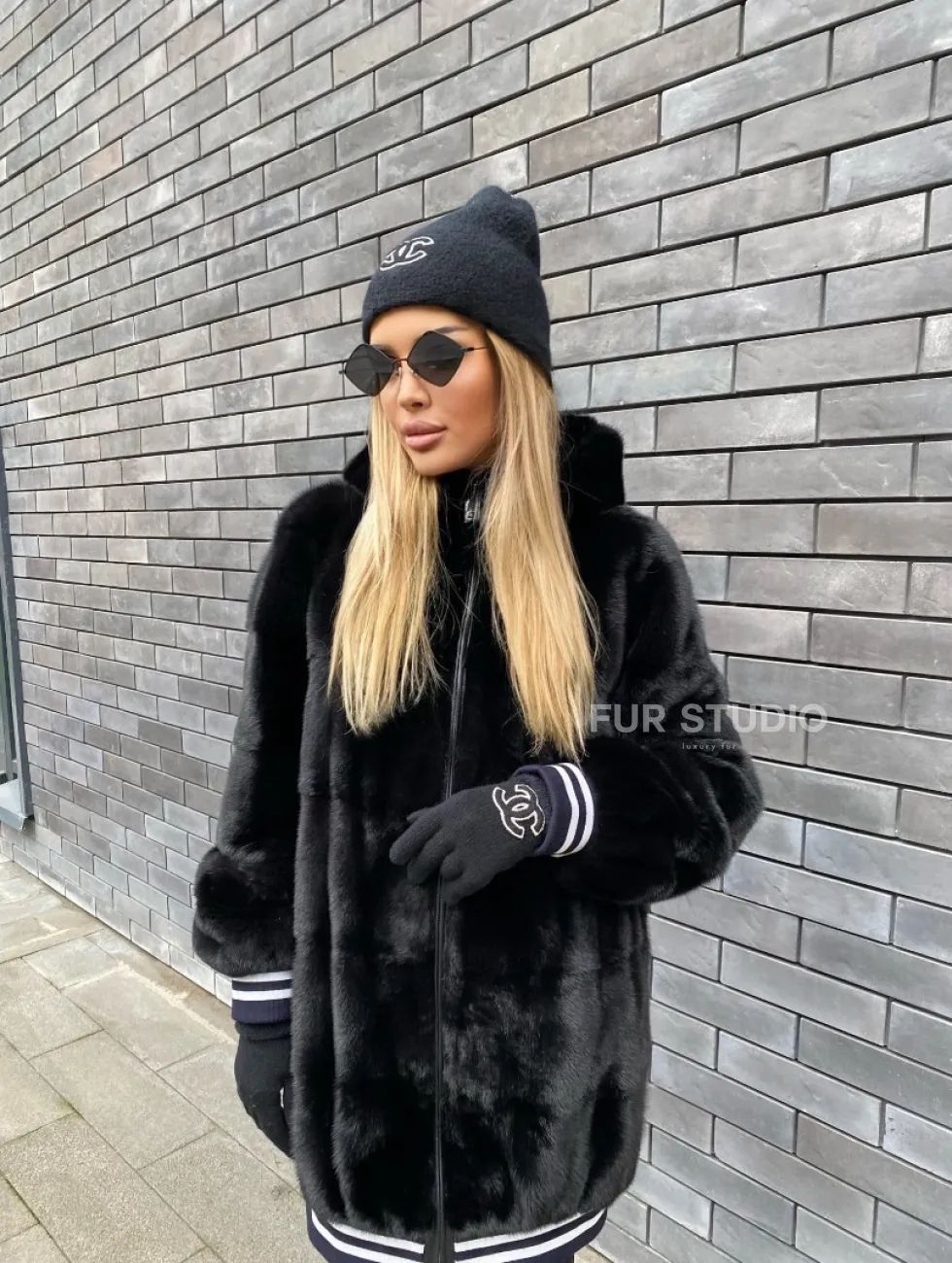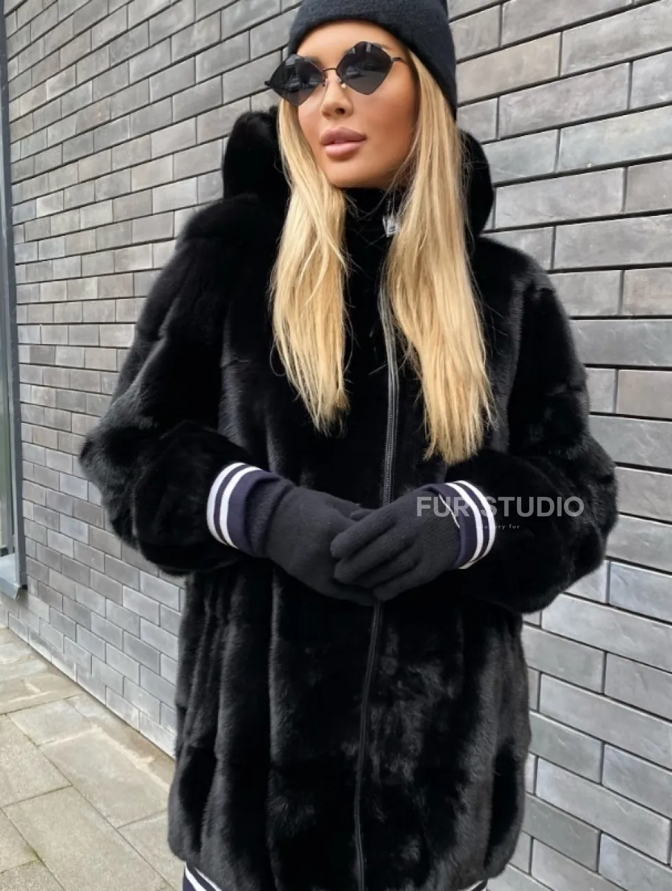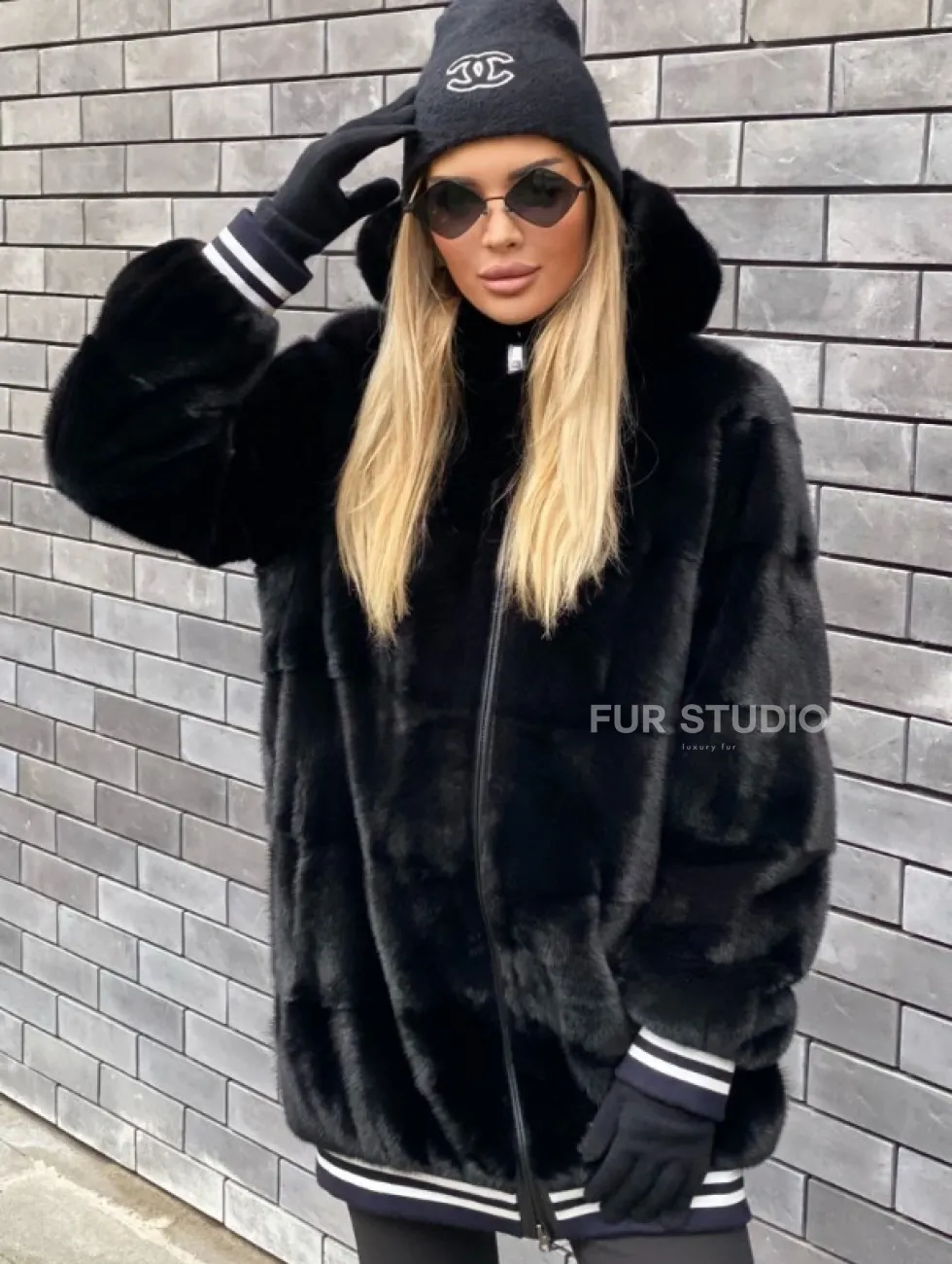 Удлиненный бомбер из меха скандинавской норки с капюшоном на молнии – выбор девушек с изысканным вкусом. Свободный крой удлиняет силуэт и скроет недостатки фигуры. Нежный мех скандинавской норки бережно согреет владелицу в лютые морозы. Шикарный капюшон позаботится о прическе в ветреную погоду.