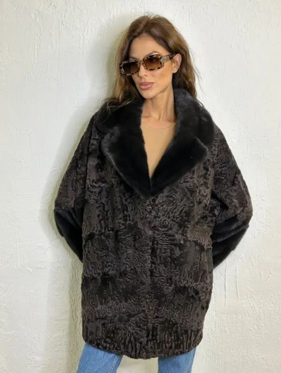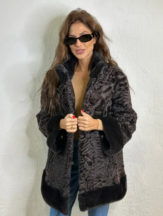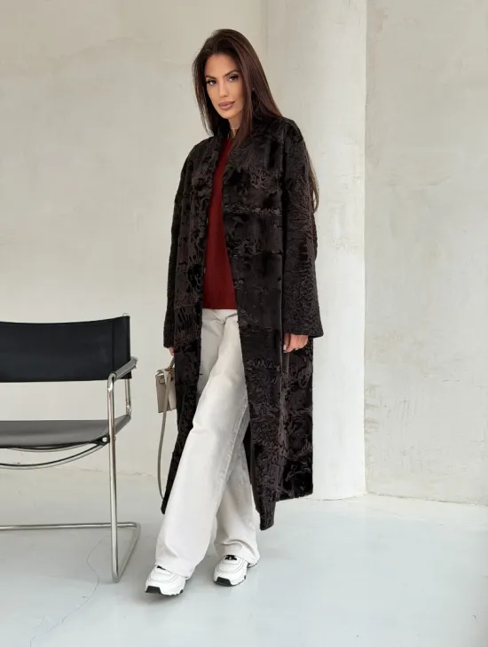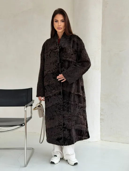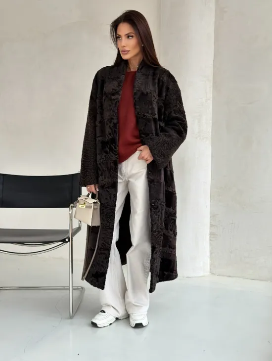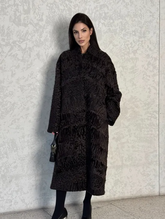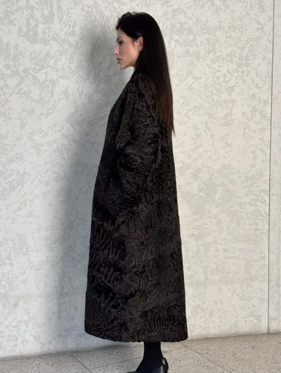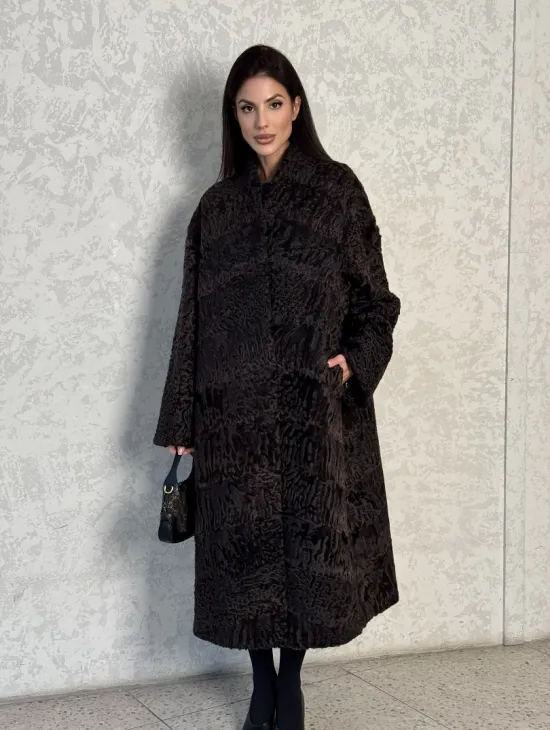 Мех данной шубы каракульча, цвет коричневый. Предлагается в размерах от 46 до 62 ( пошив по индивидуальным параметрам). Длина модели 95-100 см, что выгодно подчеркивает фигуру девушек. Эта модель идеально подойдет для девушек и женщин, предпочитающих роскошные натуральные меха.