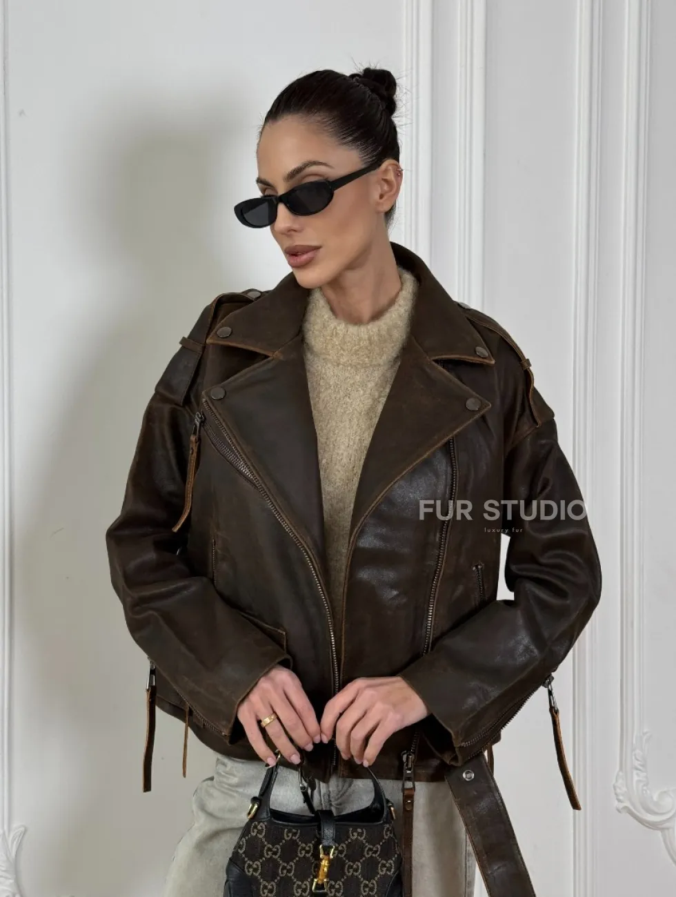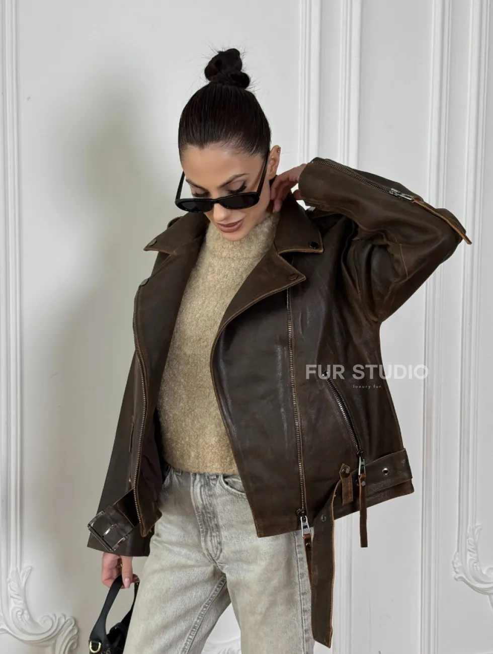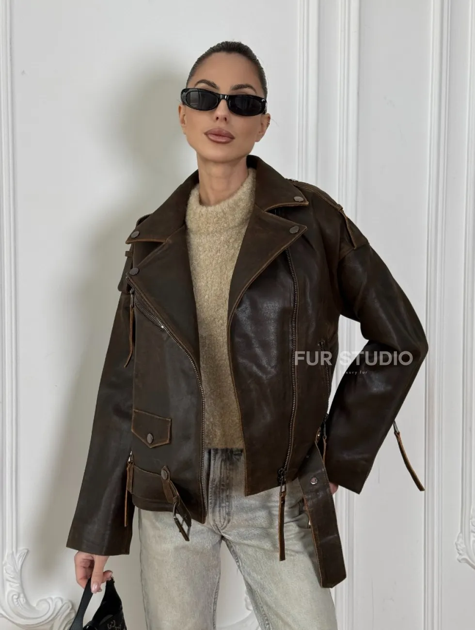 Vintage Brown кожаная куртка - косуха оверсайз с затертыми швами доступна для покупки в нашем шоуруме Furs Studio в Чите, где также предоставляется удобная доставка во все города России.