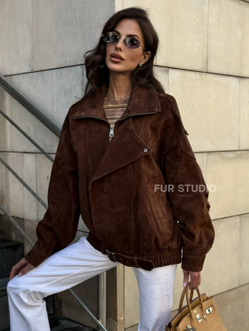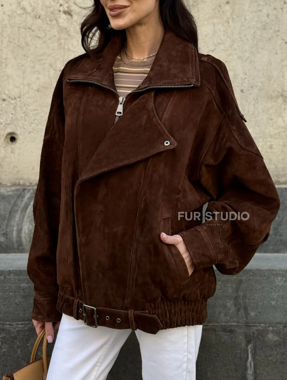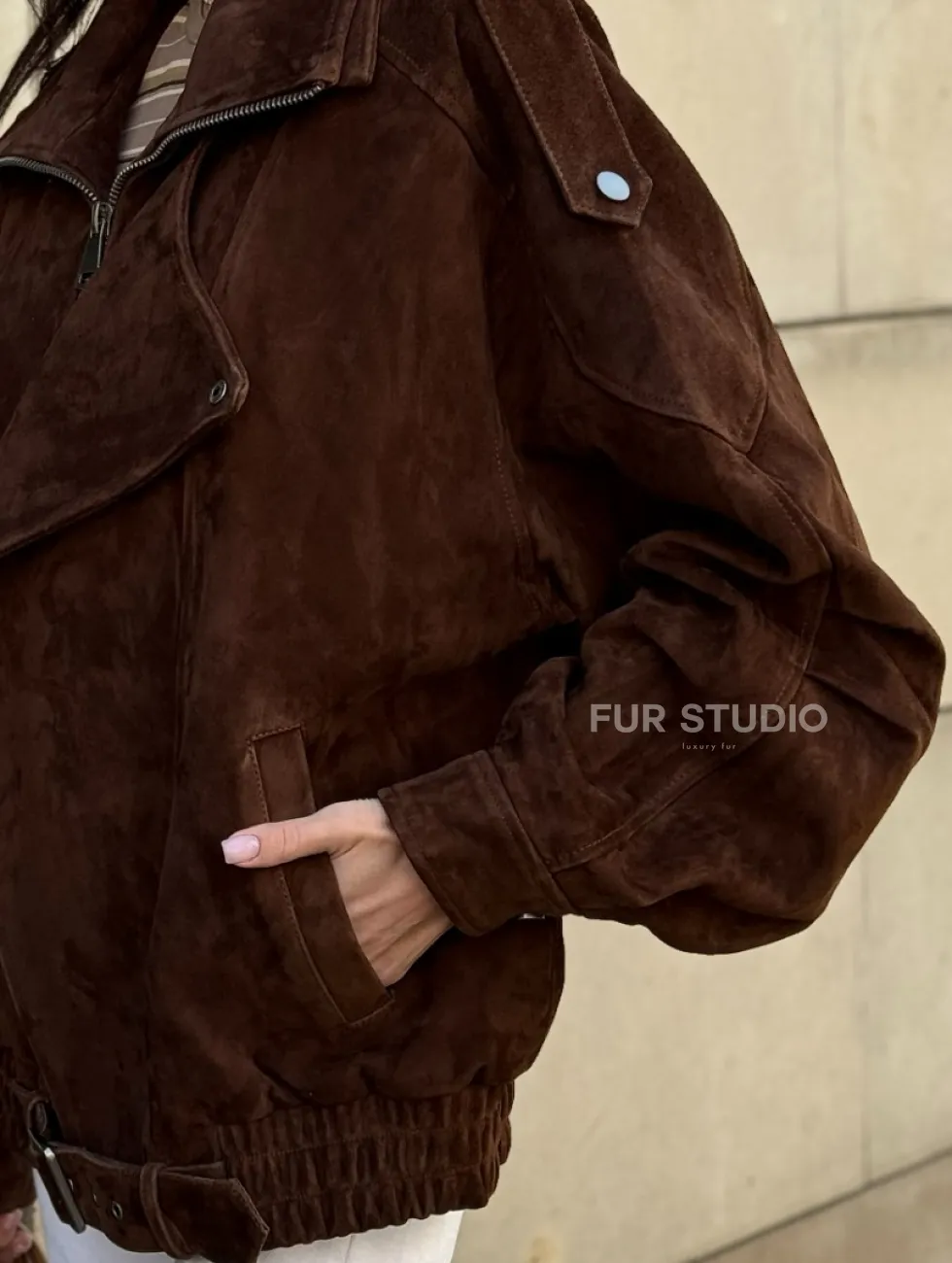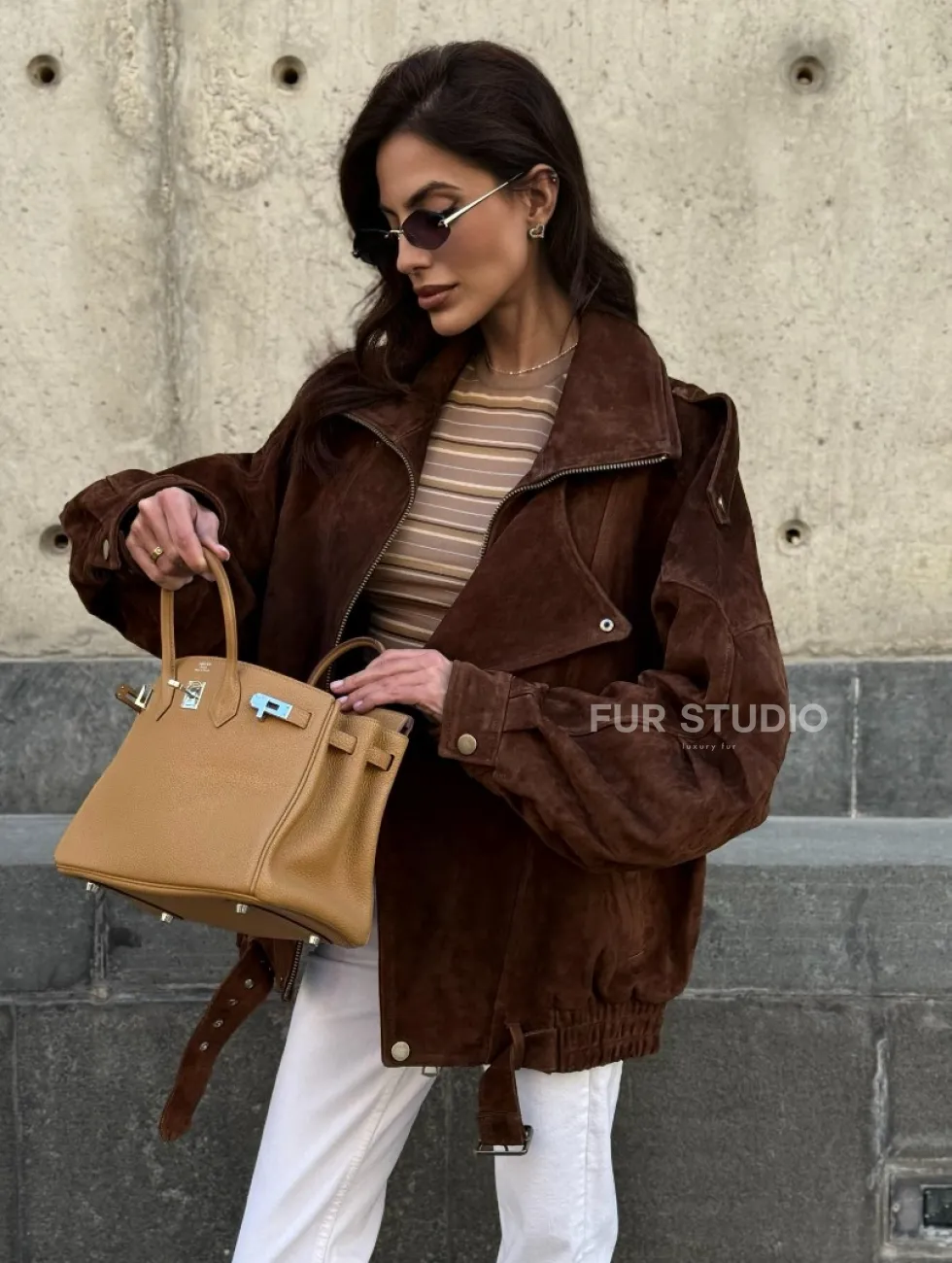 Винтажная куртка - бомбер из замши в коричневом цвете доступна для покупки в нашем шоуруме Furs Studio в Чите, где также предоставляется удобная доставка во все города России.
