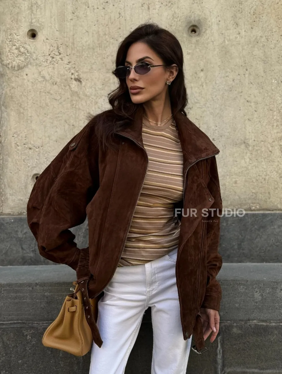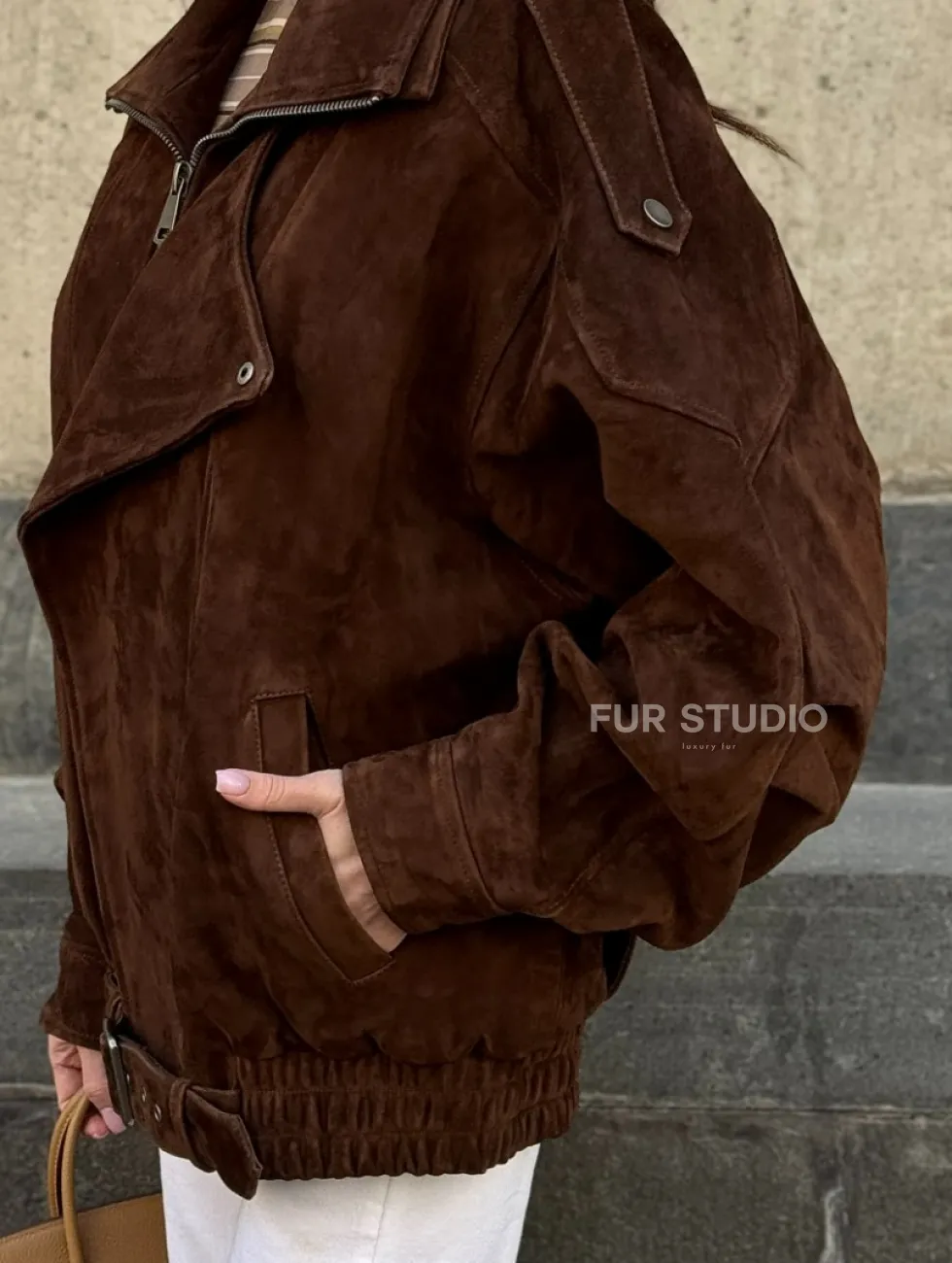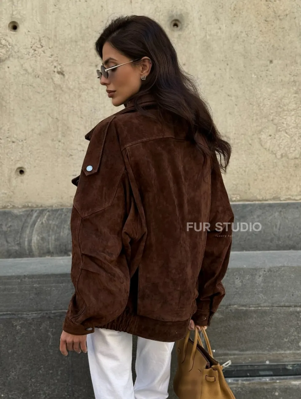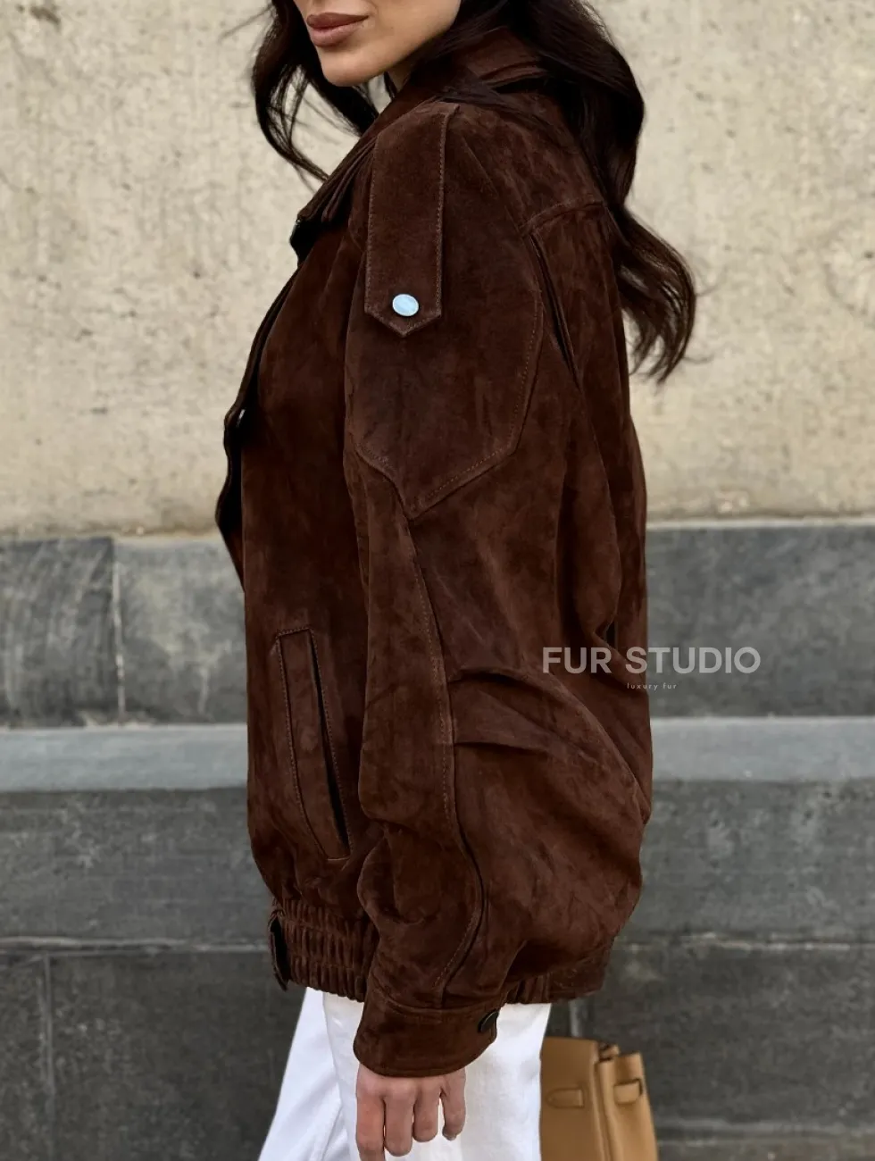 Винтажная куртка - бомбер из замши в коричневом цвете доступна для покупки в нашем шоуруме Furs Studio в Чите, где также предоставляется удобная доставка во все города России.