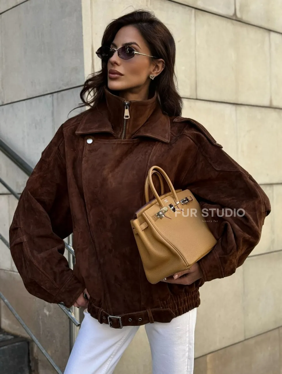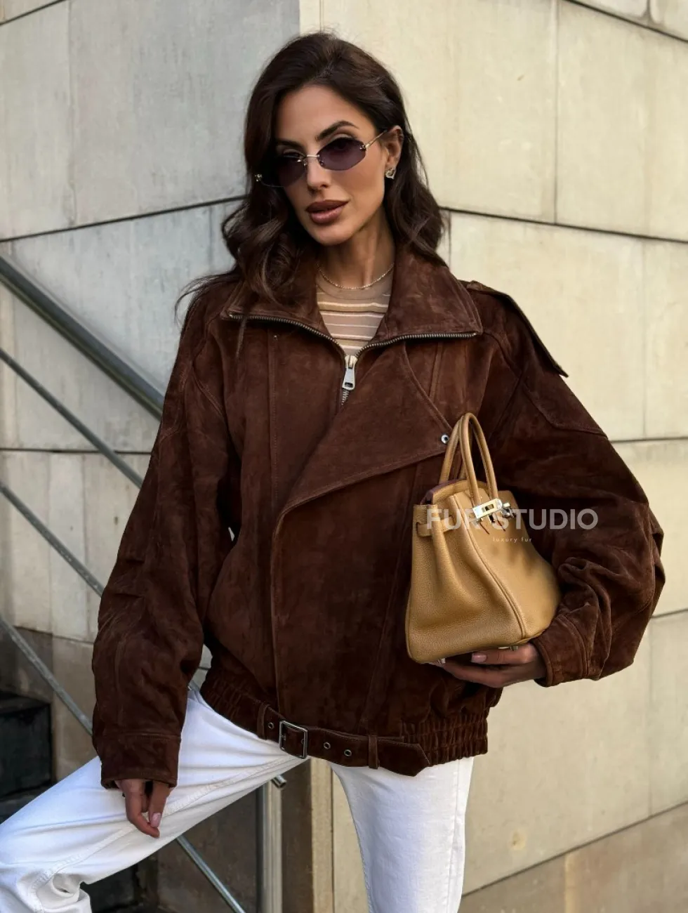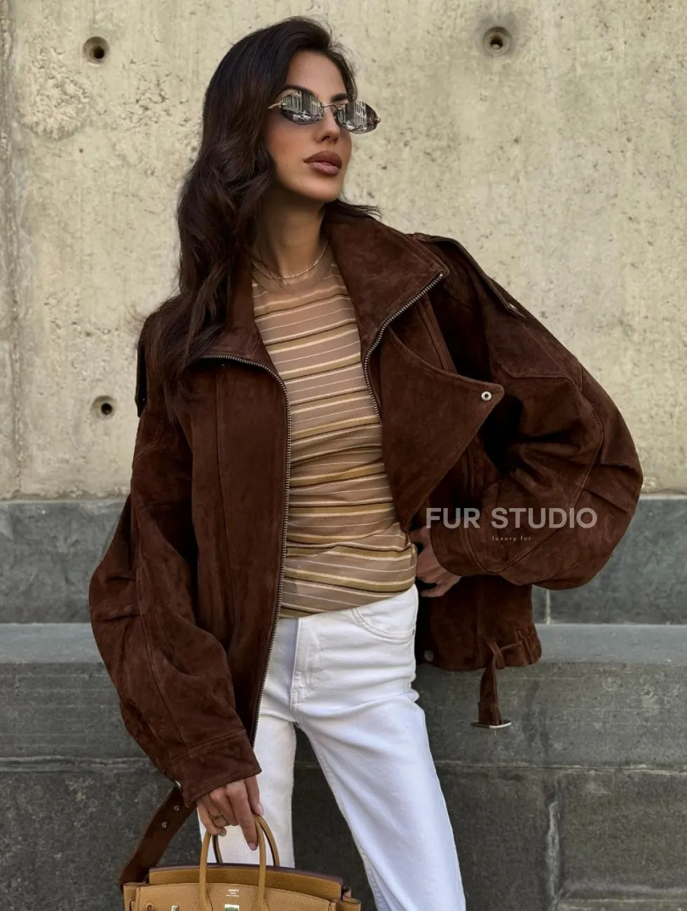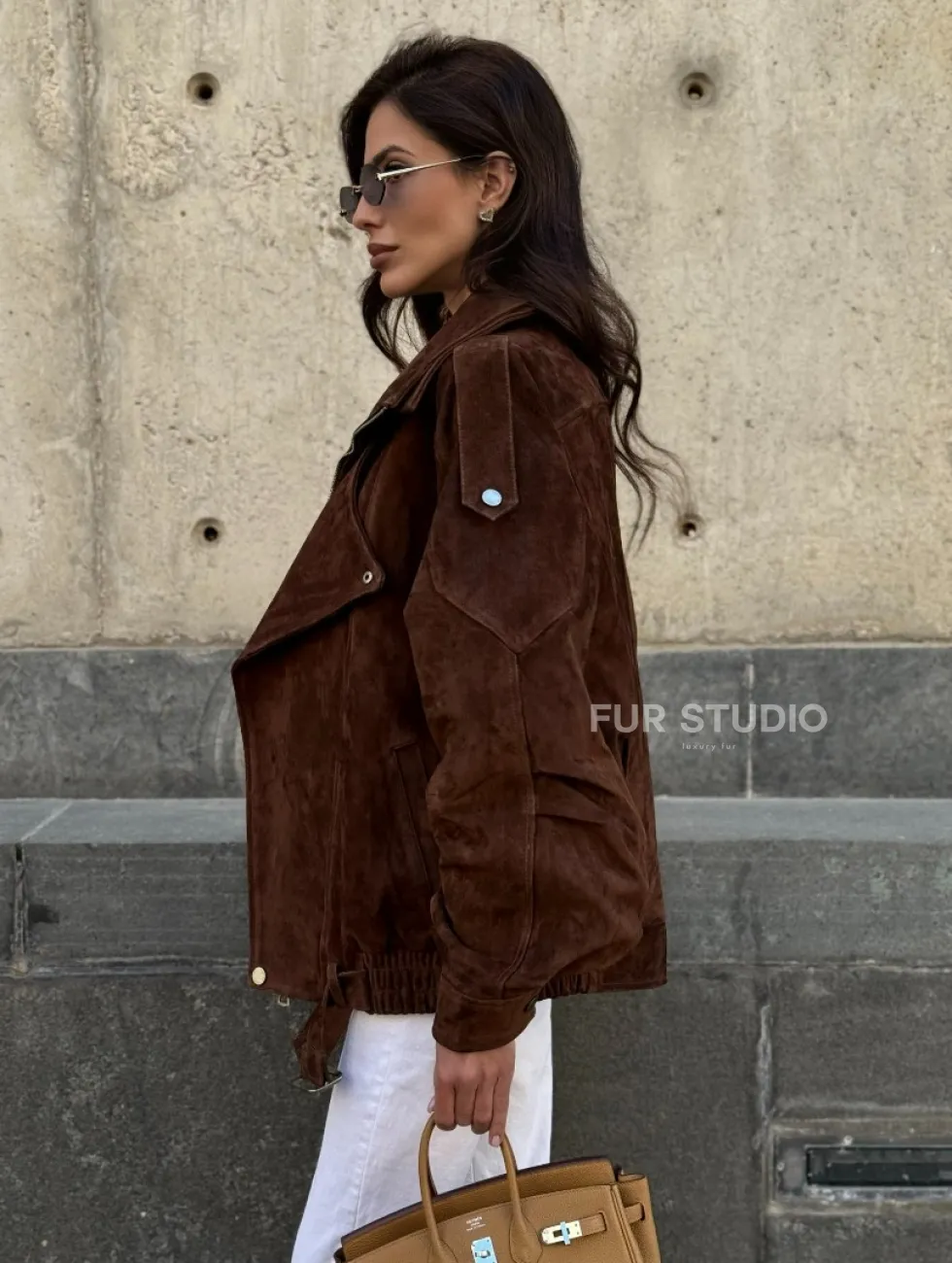 Винтажная куртка - бомбер из замши в коричневом цвете доступна для покупки в нашем шоуруме Furs Studio в Чите, где также предоставляется удобная доставка во все города России.
