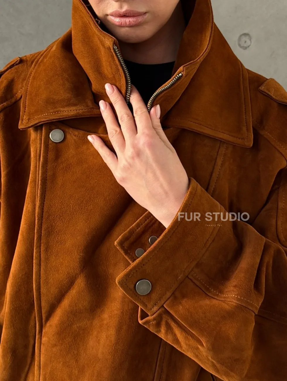 Замшевая куртка-косуха доступна для покупки в нашем шоуруме Furs Studio в Чите, где также предоставляется удобная доставка во все города России.