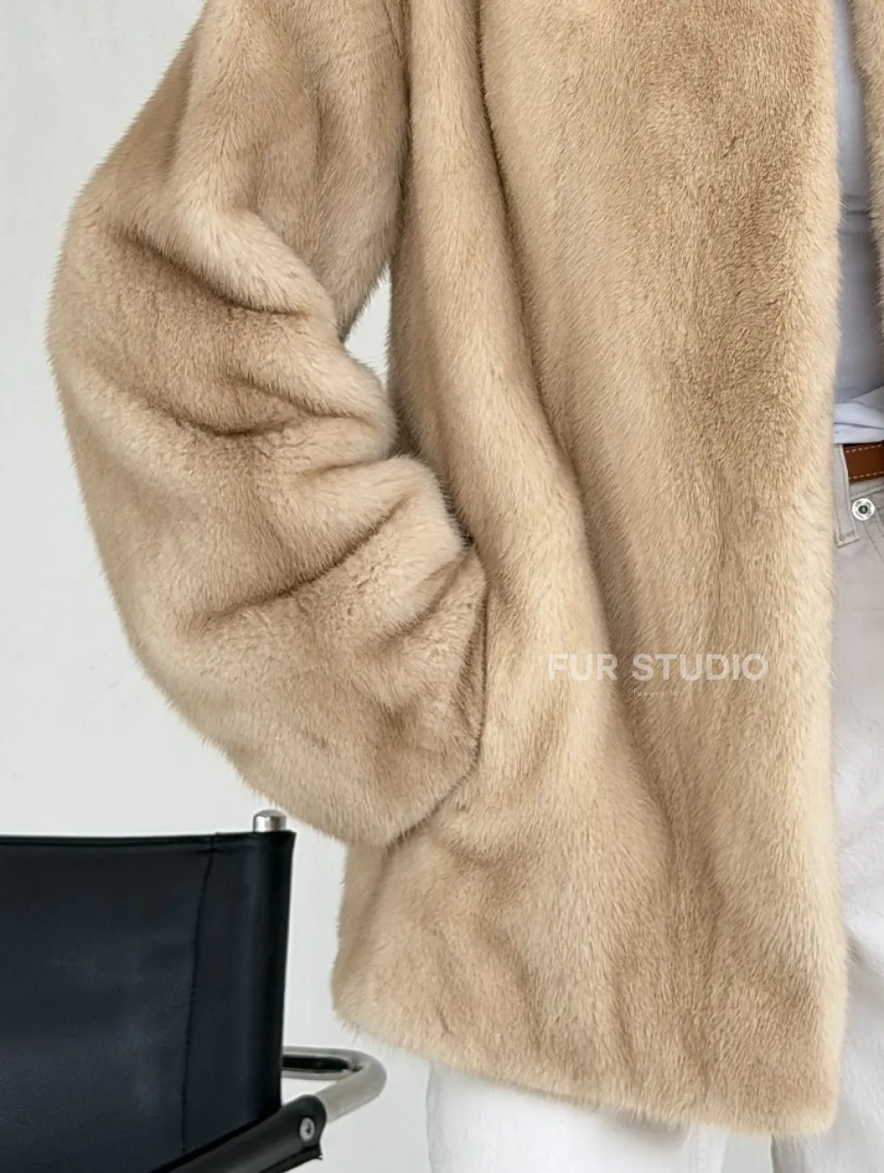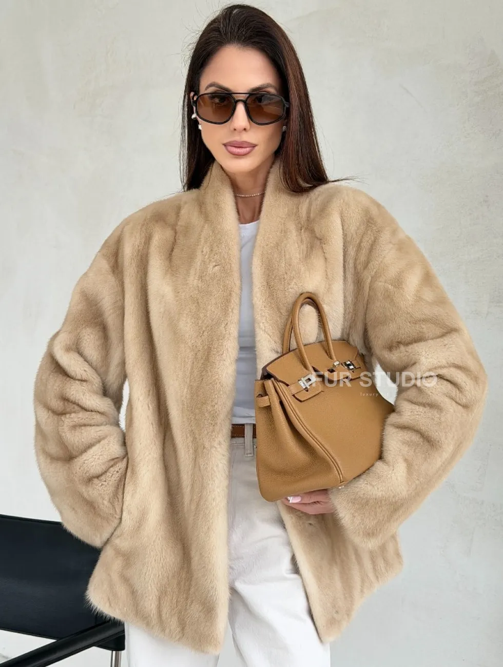Мех данной шубы аукционная норка , цвет бежевый. Предлагается в размерах от 42 до 48. Длина модели 70-75 см, что выгодно подчеркивает фигуру девушек. Эта модель идеально подойдет для девушек и женщин, предпочитающих роскошные натуральные меха.