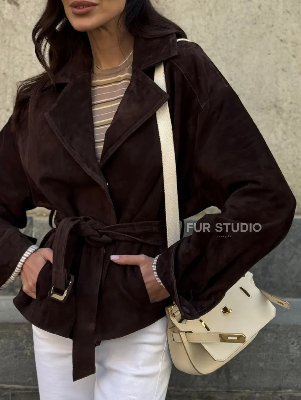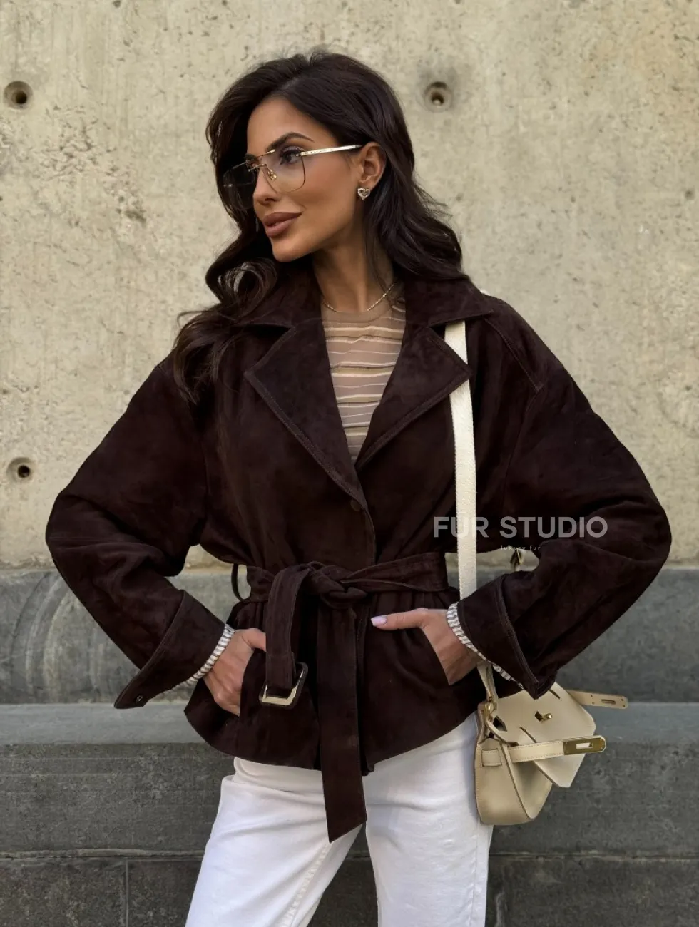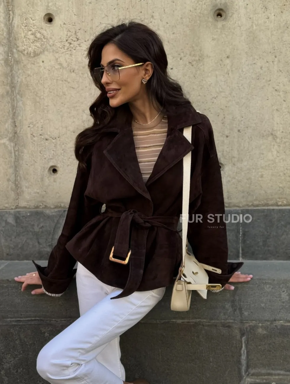 Жакет - куртка из замшевой кожи LUX с поясом доступна для покупки в нашем шоуруме Furs Studio в Чите, где также предоставляется удобная доставка во все города России.