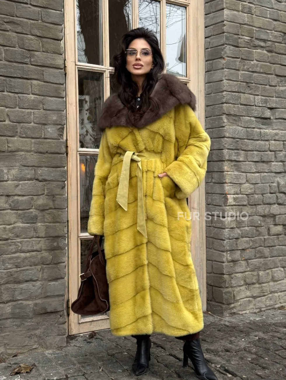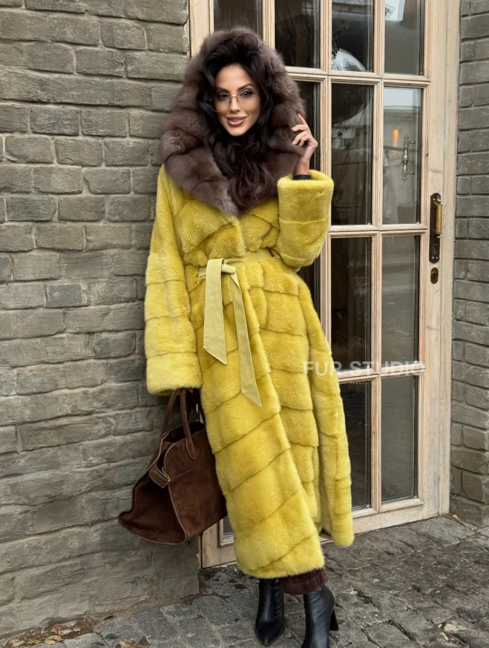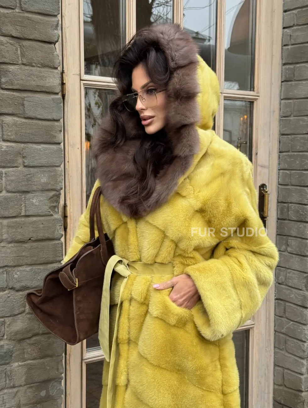 Женская длинная шуба из норки желтого цвета с капюшоном из меха куницы доступна для покупки в нашем шоуруме Furs Studio в Чите. У нас так же есть доставка во все города России. Добавьте немного роскоши в свой гардероб с этой шубой, которая будет служить вам многие годы.